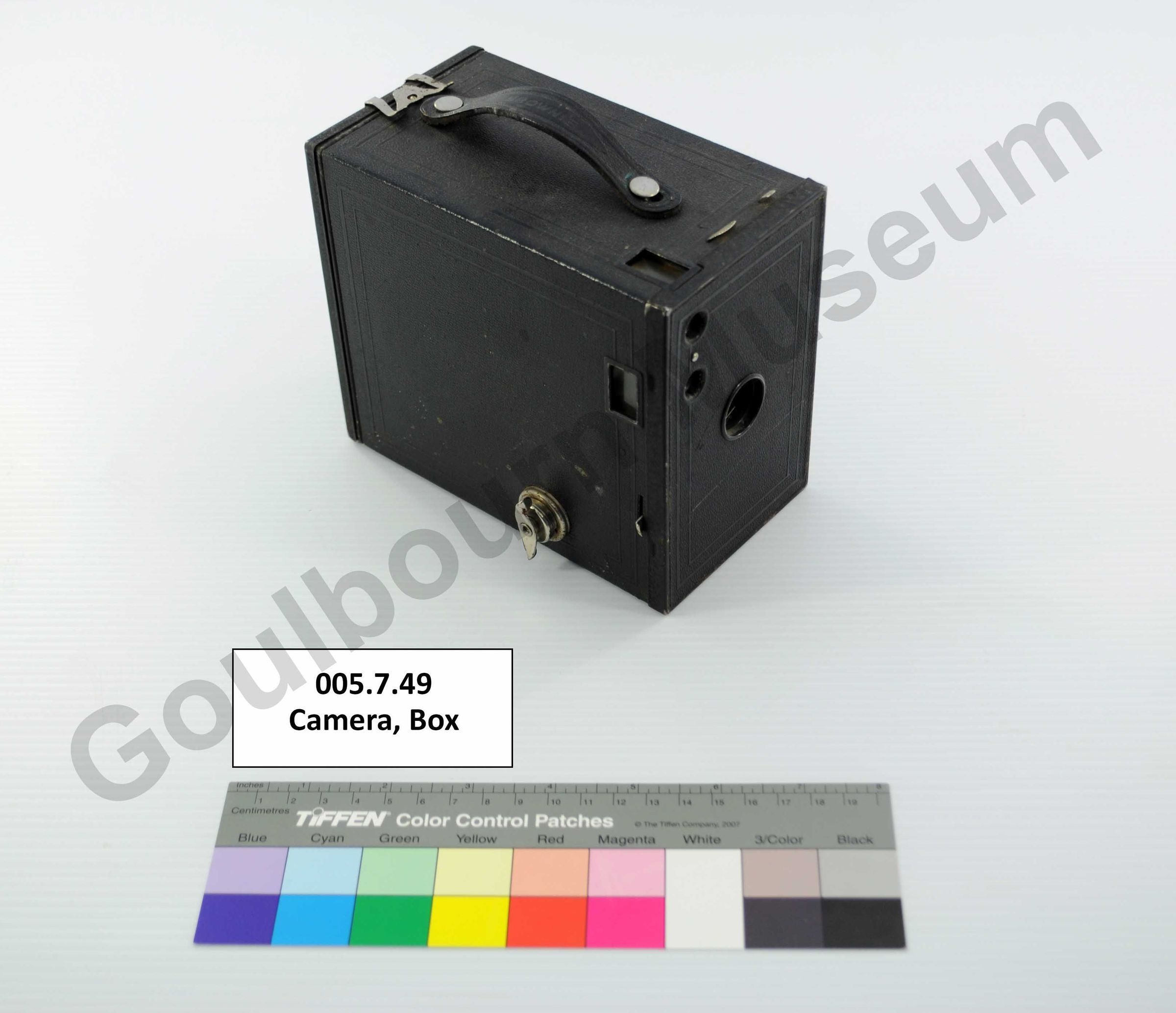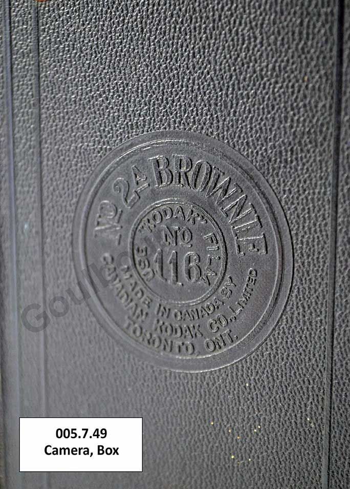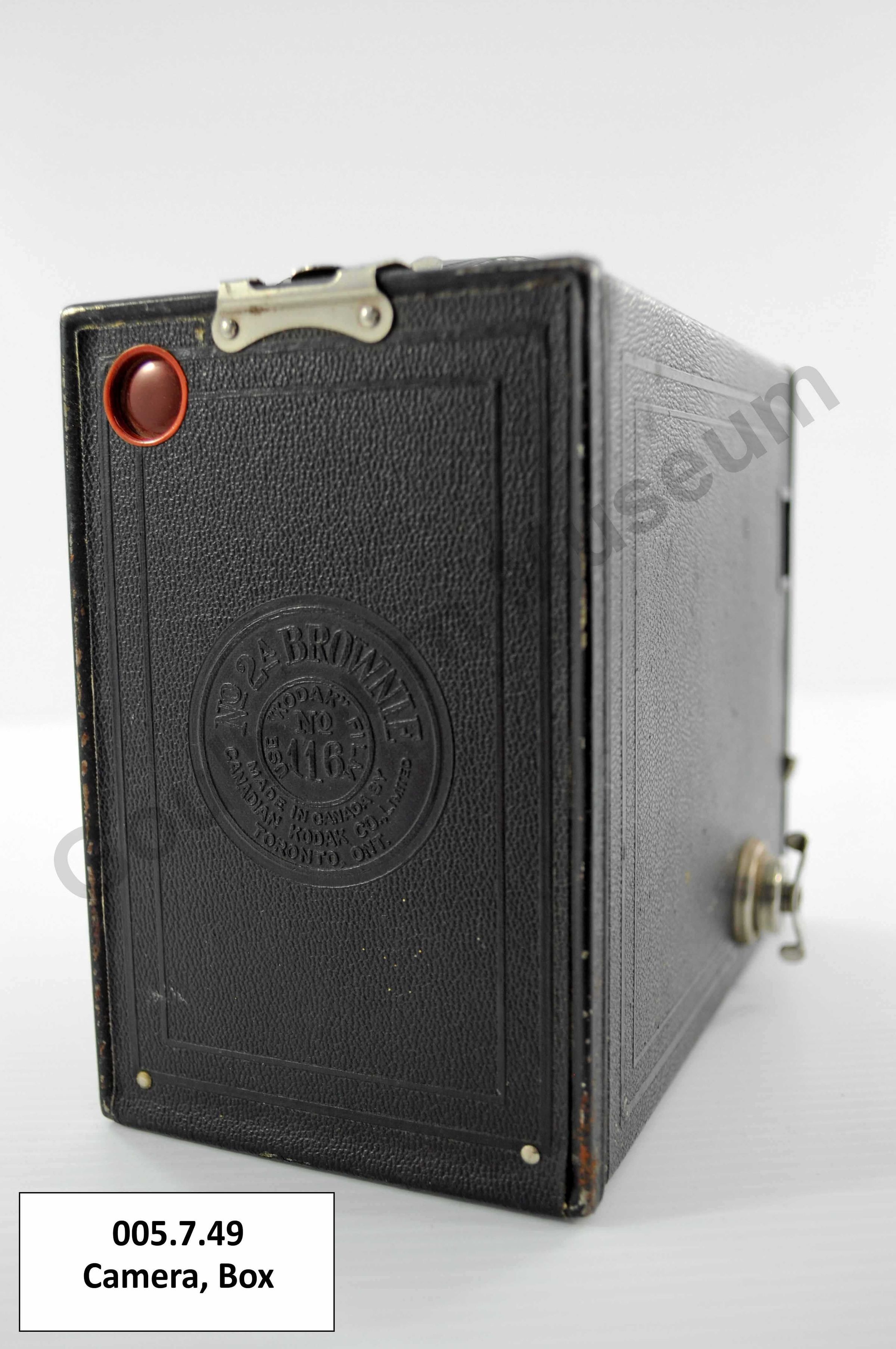 This camera was made by the Canadian Kodak Company Limited between 1924 and 1933. This Kodak camera was known as the “No. 2A Brownie” and is a metal frame box style camera that used a roll of number 116 film to capture images. The Brownie camera was an iconic object that helped popularize amateur photography and the “snapshot.” The Brownie’s affordable price and compact design, along with the affordability of Kodak’s rolled film and processing, allowed families to take a camera along on their adventures and capture candid “Kodak” moments.Lexicon