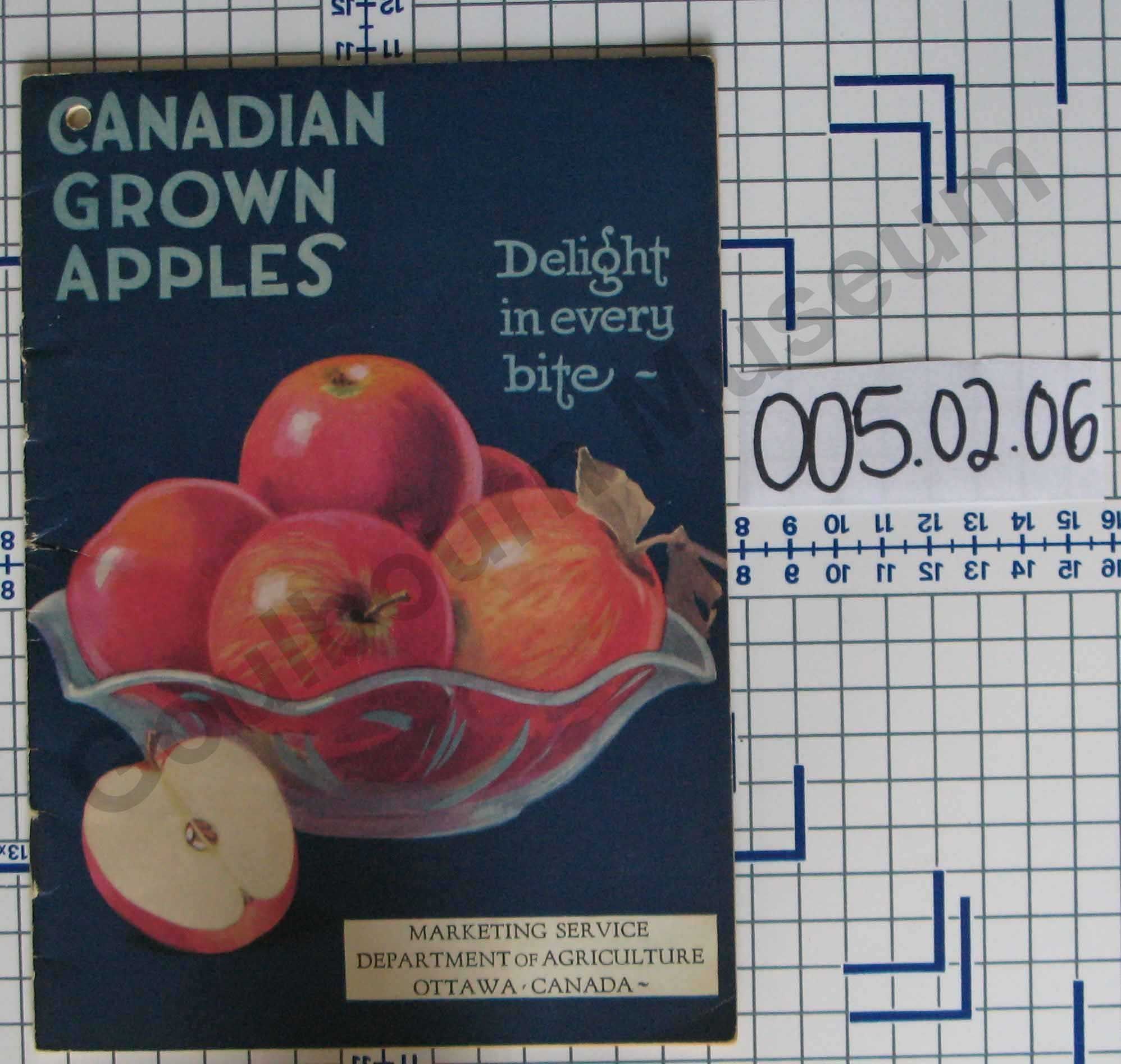 Marketing service for Dominion of Canada, Department of Agriculture. Publication 566, Household Bulletin 14. Published by authority of the Hon. JAMES G. Gardiner, Minister of Agriculture, Ottawa Ontario. Cover is dark blue with artist rendering of apples in a glass bowl, with a sliced apple. Title text is light blue and artist rendered. Stapled together with two staples. Hole punched through the "C" of Canadian in title. Back cover is plain, but is yellowed and stained.Collection