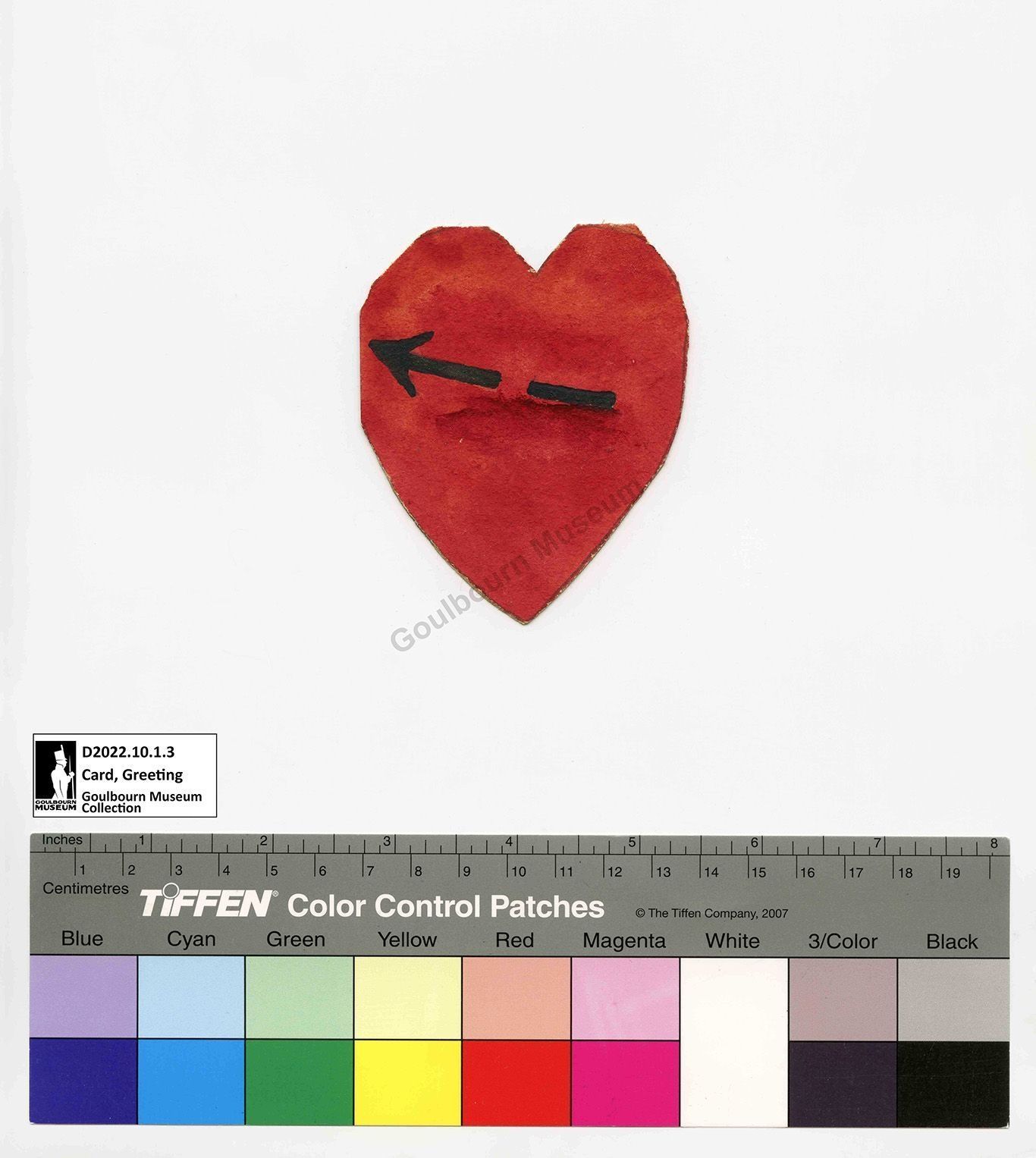 Handmade Valentine card. Card has been cut into a heart shape and the front has been coloured red and has a drawing of a black coloured arrow piercing the heart. On the reverse written in red is a handwritten inscription.