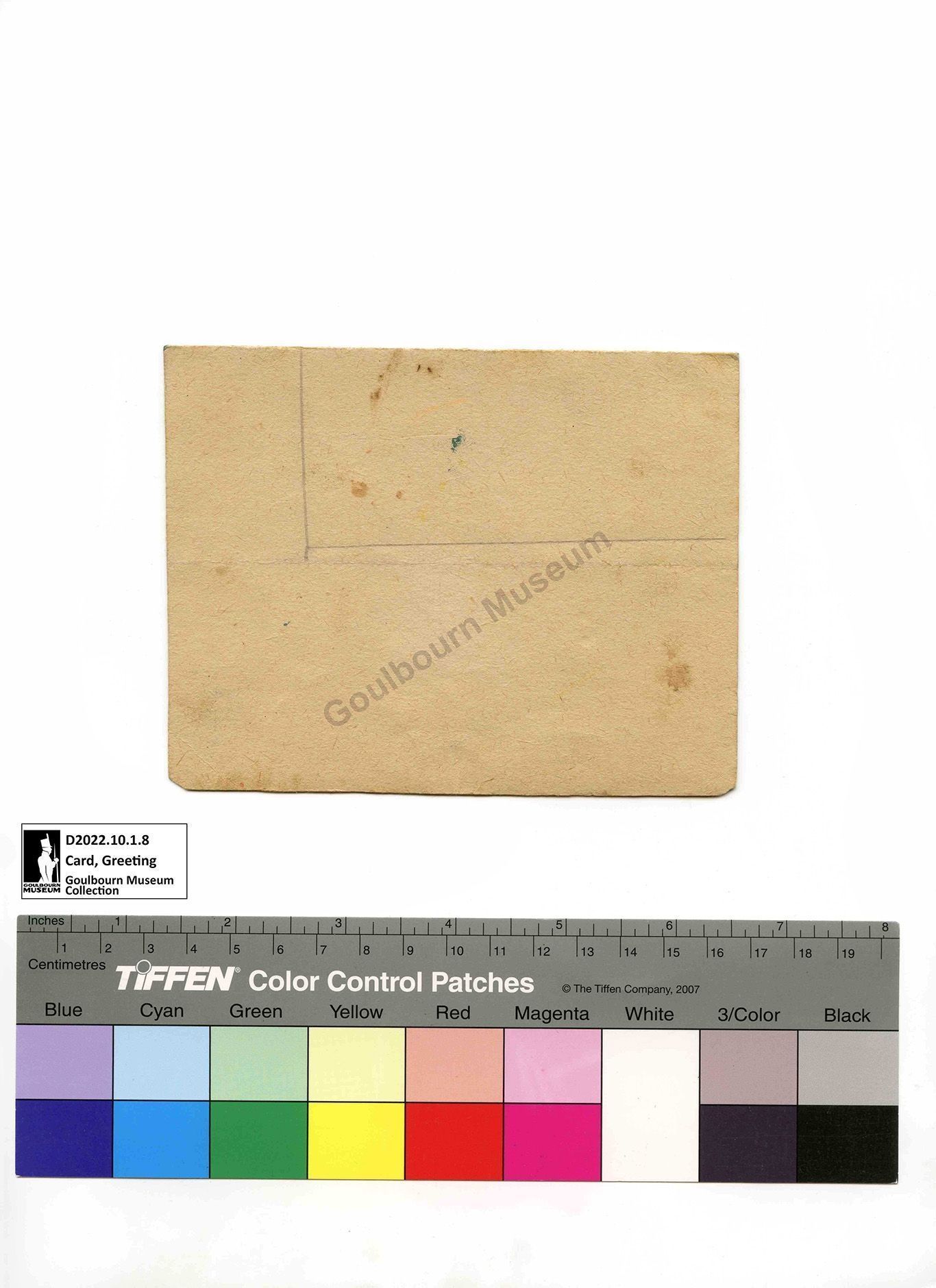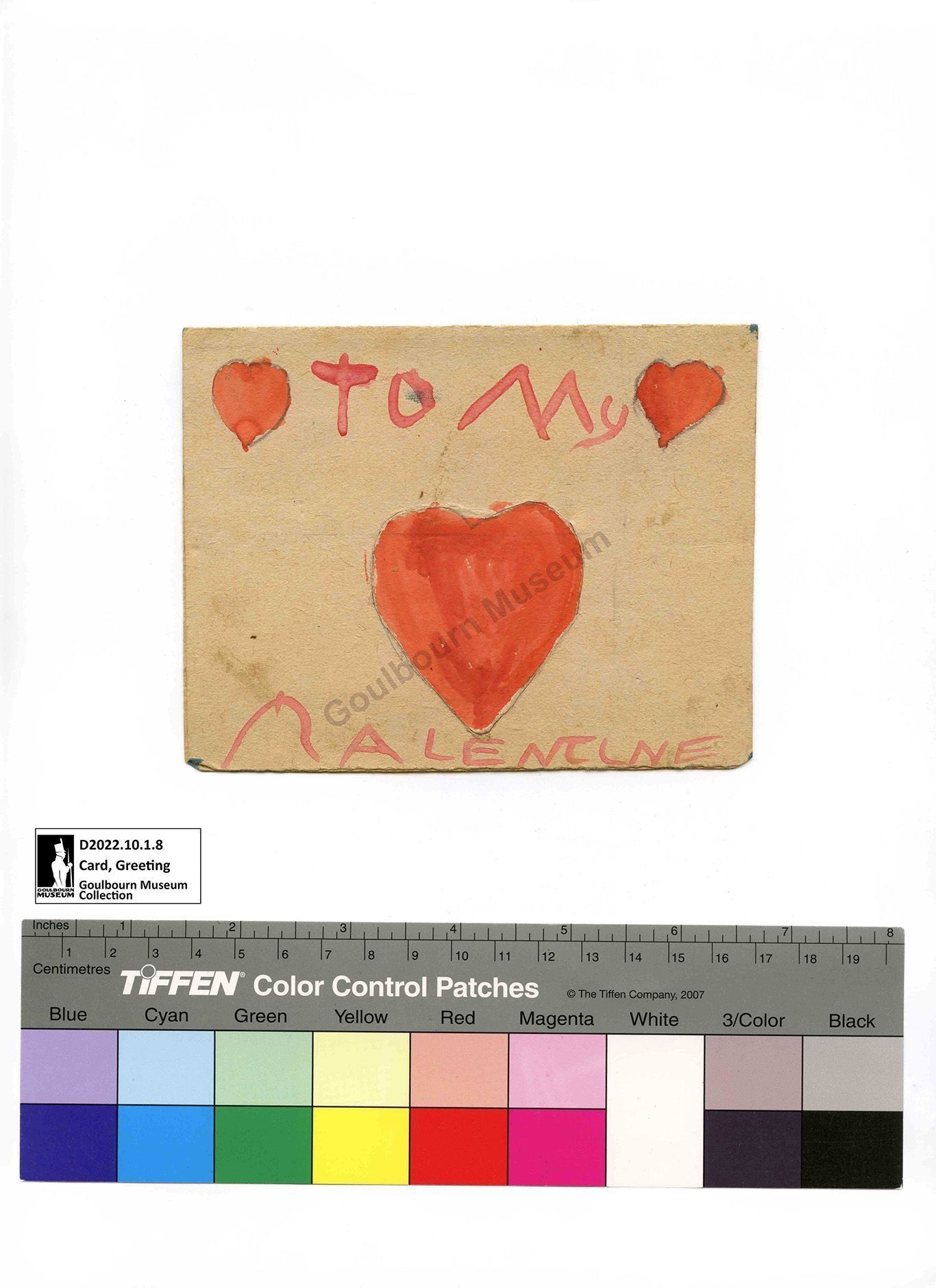 Handmade greeting card for Valentines Day. Rectangular in shape and produced on a light brown coloured cardstock material. The design incorporates a large central love heart design which is outlined in graphite pencil and coloured in using red paint or marker. Along the top edge of the card there are smaller love heart designs in both the right and left corners of the card with central text "To My" written in red coloured paint. Along the bottom edge of the card is written "Valentine" in red coloured paint with the "V" in Valentine written upside down. The reverse of the card is blank apart from two lines drawn in graphite pencil.