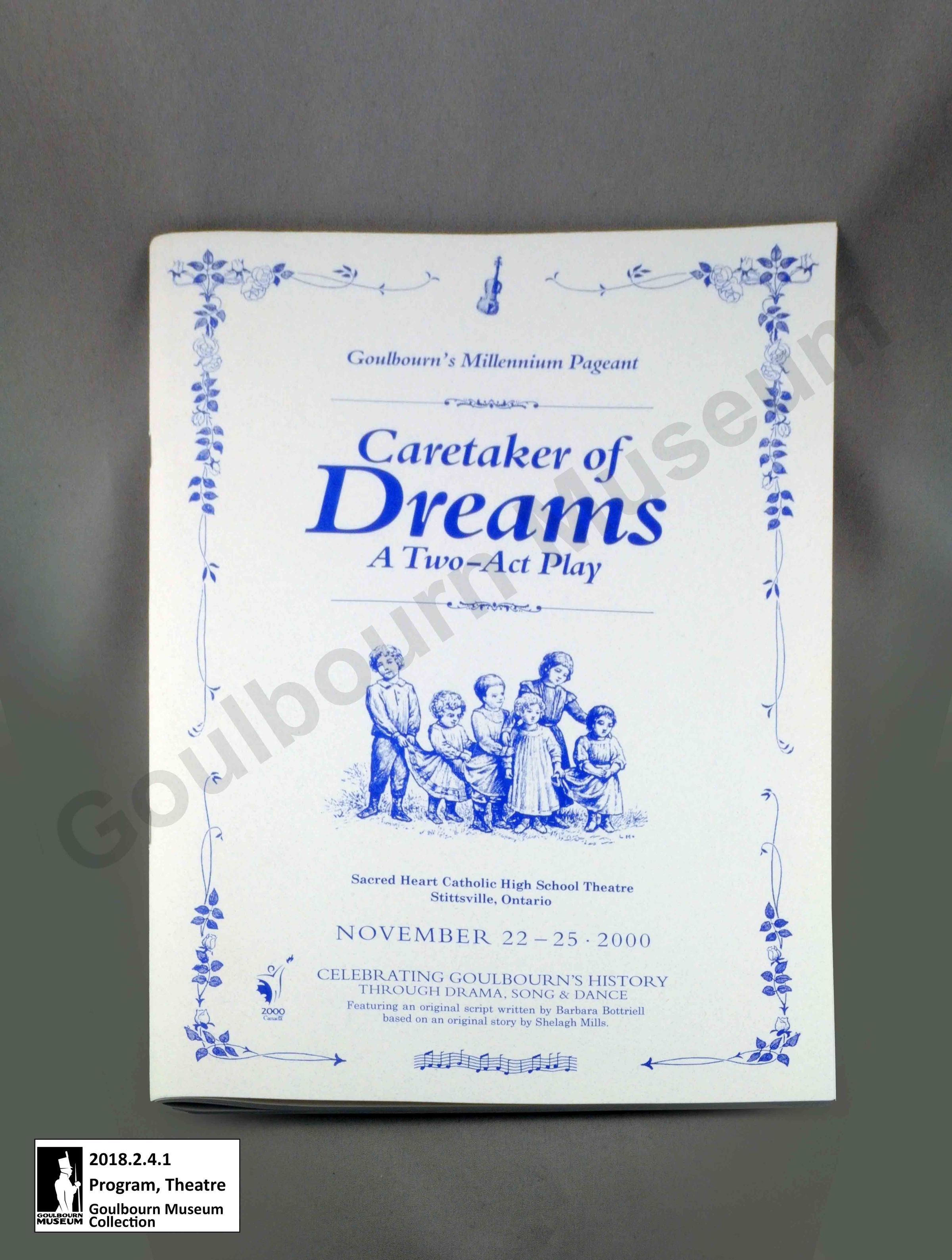 A playbill from the Goulbourn Township Millennium Pageant in 2000 when they performed the Caretaker of Dreams play at Sacred Heart Catholic High School. The play celebrates the history of the Goulbourn through it's performance.Collection