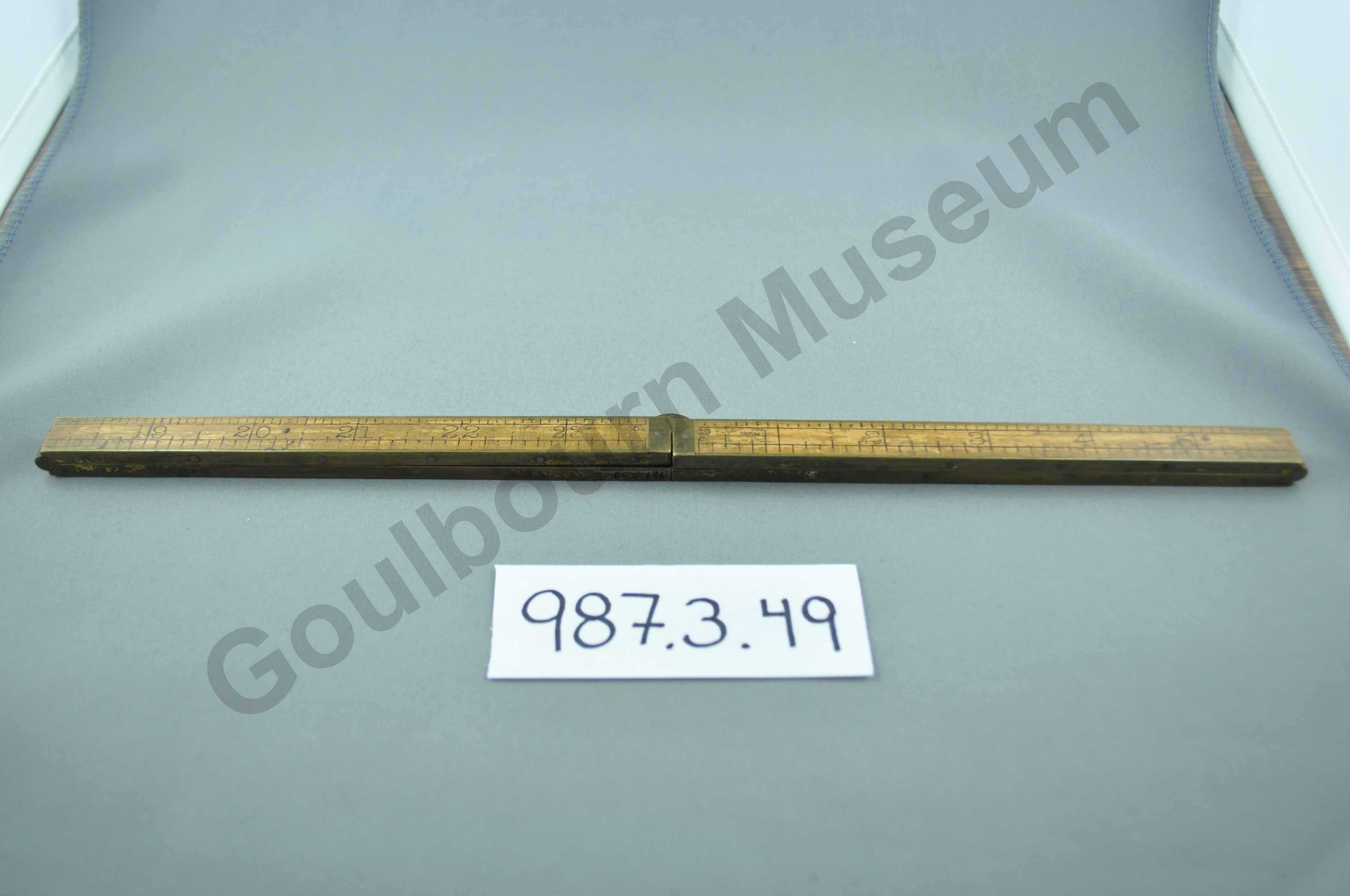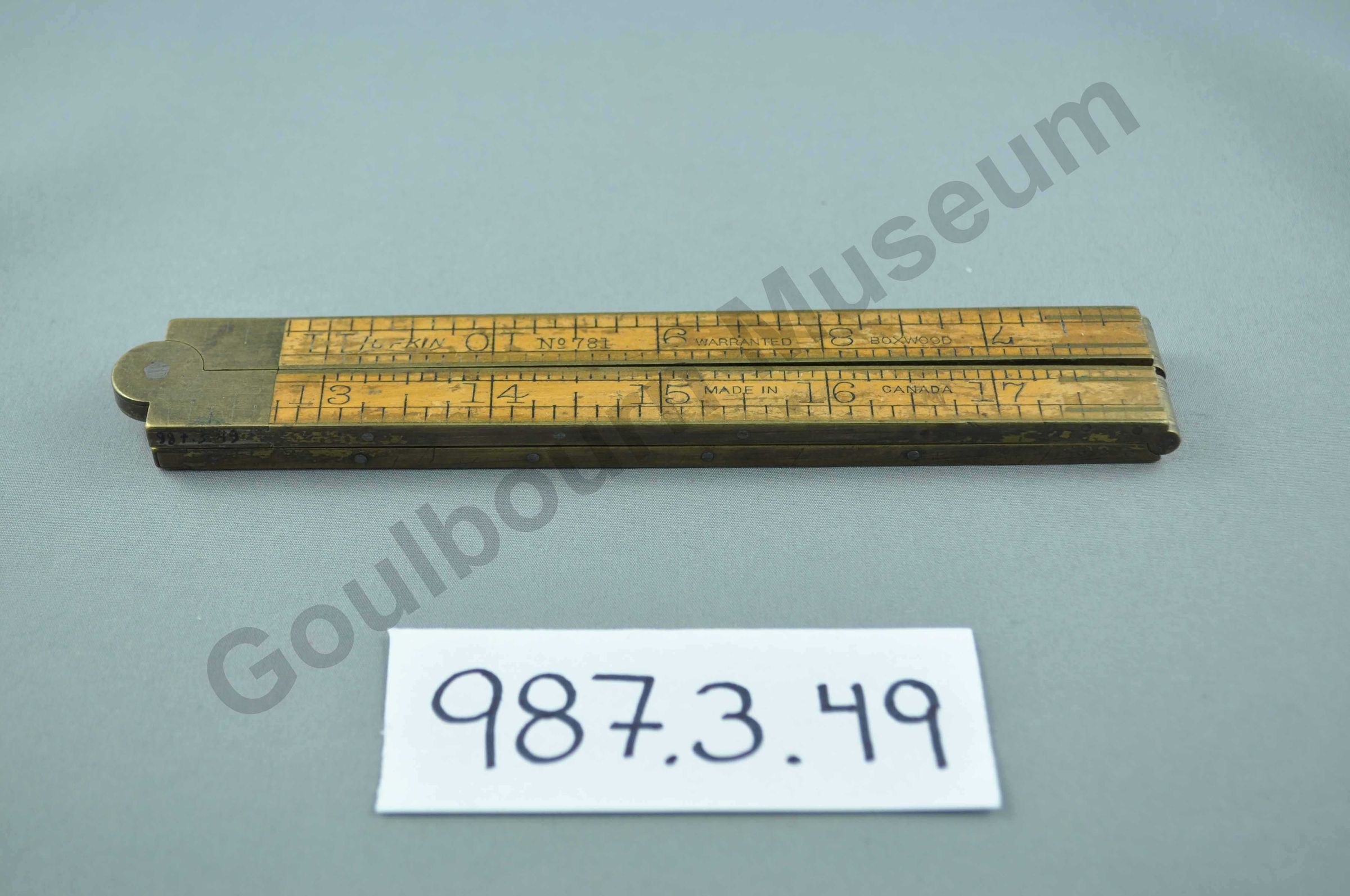 Wooden ruler with metal hinges, brass fasteners and edges with gradiations in imperial and metric which reads "Tufkin OT No. 781 Warranted Boxwood, Made in Canada".Context