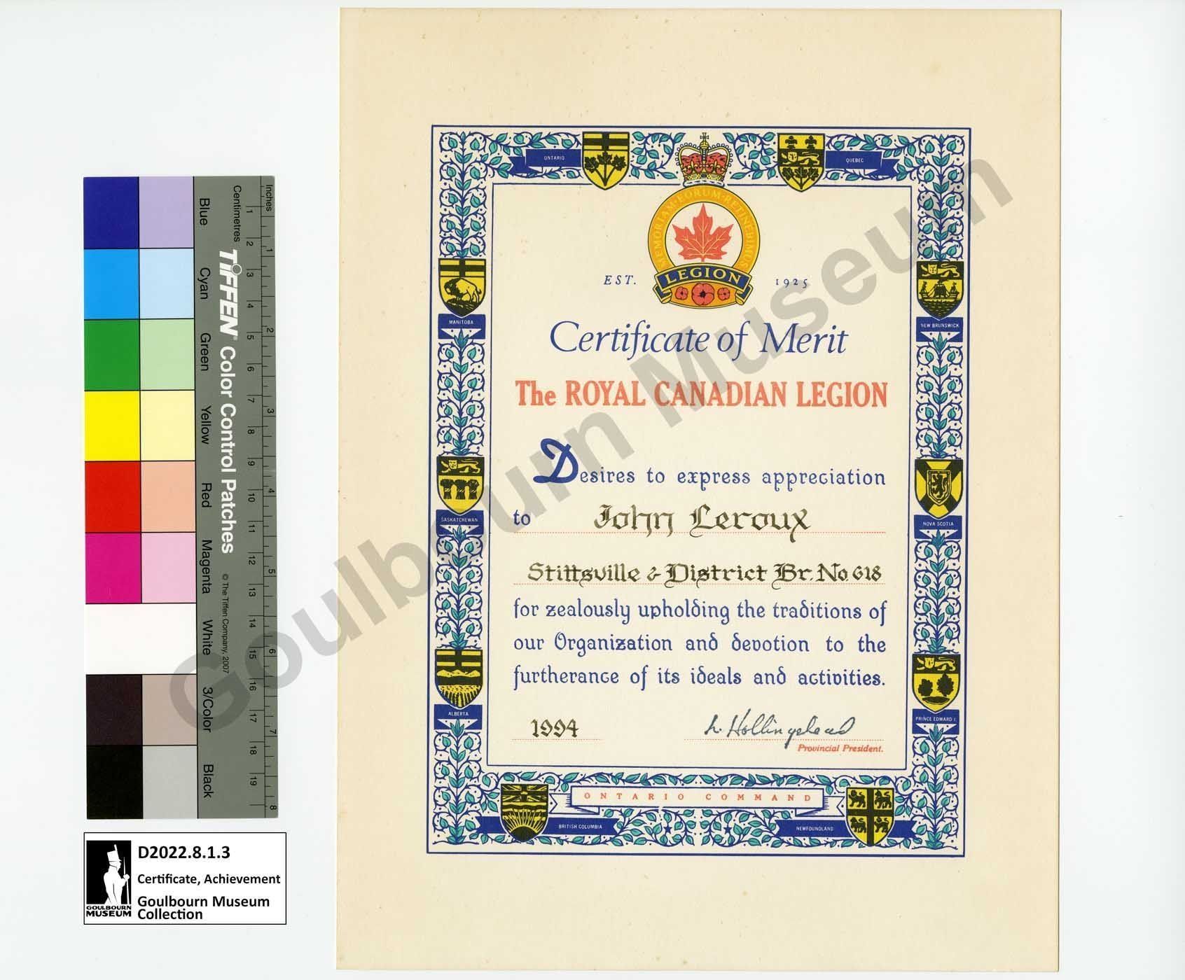 Certificate of Merit presented by the Royal Canadian Legion to John Leroux in 1994. The document has a colour border made up of an outside thin line in blue, an interior repeating vine motif in blue and green, and evenly spaced provincial shields in black and yellow. The bottom of the border has a banner with the words "Ontario Command" and the border has an inner thin line of blue. The certificate has a Royal Canadian Legion crest at the top centre and the certificate reads, "EST. 1925" "Certificate of Merit" "The Royal Canadian Legion" "Desires to express appreciation to John Leroux Stittsville & District Br. No. 618 for zealously upholding the traditions of our Organization and devotion to the furtherance of its ideals and activities." "1994" [Indistinguishable signature] "Provincial President."Context