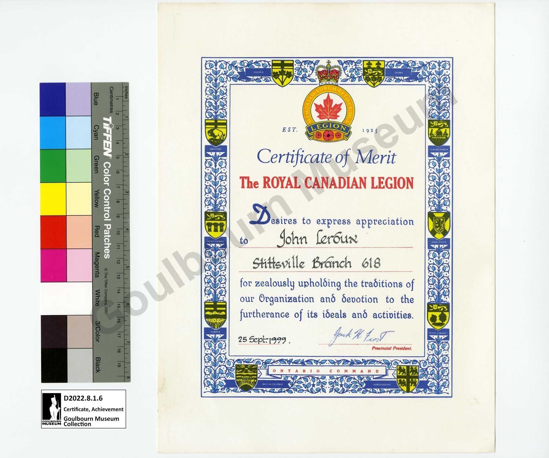 Certificate of Merit presented by the Royal Canadian Legion to John Leroux in 1999. The document has a colour border made up of an outside thin line in blue, an interior repeating vine motif in blue and light blue, and evenly spaced provincial shields in black and yellow. The bottom of the border has a banner with the words "Ontario Command" and the border has an inner thin line of blue. The certificate has a Royal Canadian Legion crest at the top centre and the certificate reads, "EST. 1925" "Certificate of Merit" "The Royal Canadian Legion" "Desires to express appreciation to John Leroux Stittsville Branch 618 for zealously upholding the traditions of our Organization and devotion to the furtherance of its ideals and activities." "25 Sept 1999" [Indistinguishable signature] "Provincial President."Context