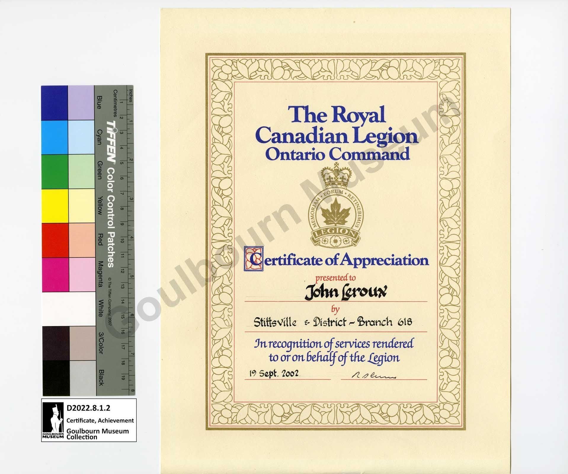 Certificate of appreciation awarded to John Leroux by the Royal Canadian Legion on September 19, 2002. The document has a border consisting of an outside line of gold metallic, a thin inner line of red, a repeating floral pattern in gold metallic, and then an inside thin line of red. The document has a central crest of the Royal Canadian Legion printed in gold metallic. The document reads, "The Royal Canadian Legion Ontario Command" "Certificate of Appreciation" "presented to" "John Leroux" "by" "Stittsville & District - Branch 618" "In recognition of services rendered to or on behalf of the Legion" "19 Sept. 2002" [indistinguishable signature].Context