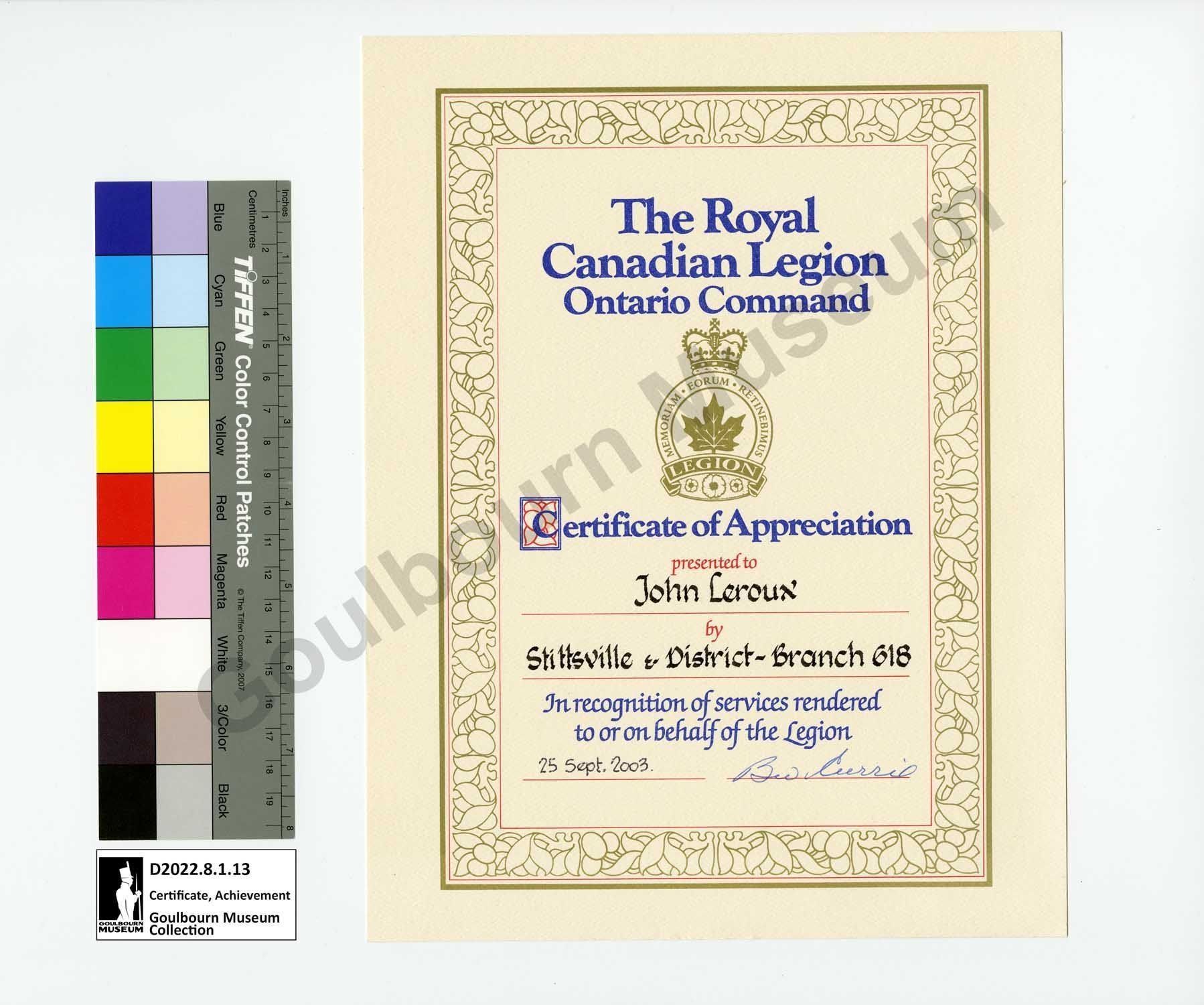 Certificate of appreciation awarded to John Leroux by the Royal Canadian Legion on September 25, 2003. The document has a border consisting of an outside line of gold metallic, a thin inner line of red, a repeating floral pattern in gold metallic, and then an inside thin line of red. The document has a central crest of the Royal Canadian Legion printed in gold metallic. The document reads, "The Royal Canadian Legion Ontario Command" "Certificate of Appreciation" "presented to" "John Leroux" "by" "Stittsville & District - Branch 618" "In recognition of services rendered to or on behalf of the Legion" "25 Sept. 2003" [indistinguishable signature].Context