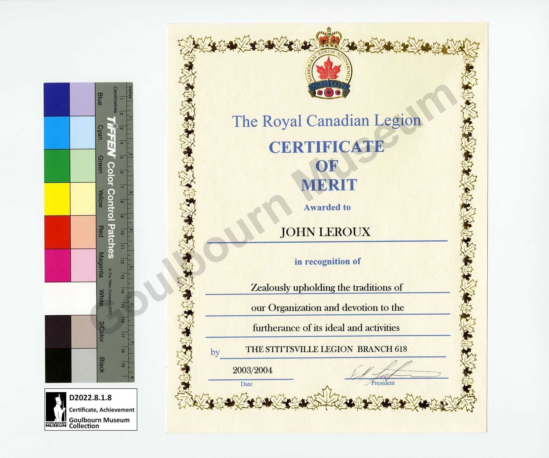 Certificate, Achievement: Royal Canadian Legion John Leroux 2003 2004Entry/Object ID
