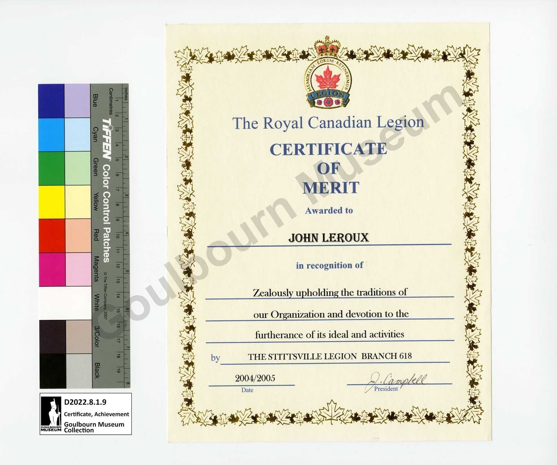 Certificate, Achievement: Royal Canadian Legion John Leroux 2004 2005Entry/Object ID