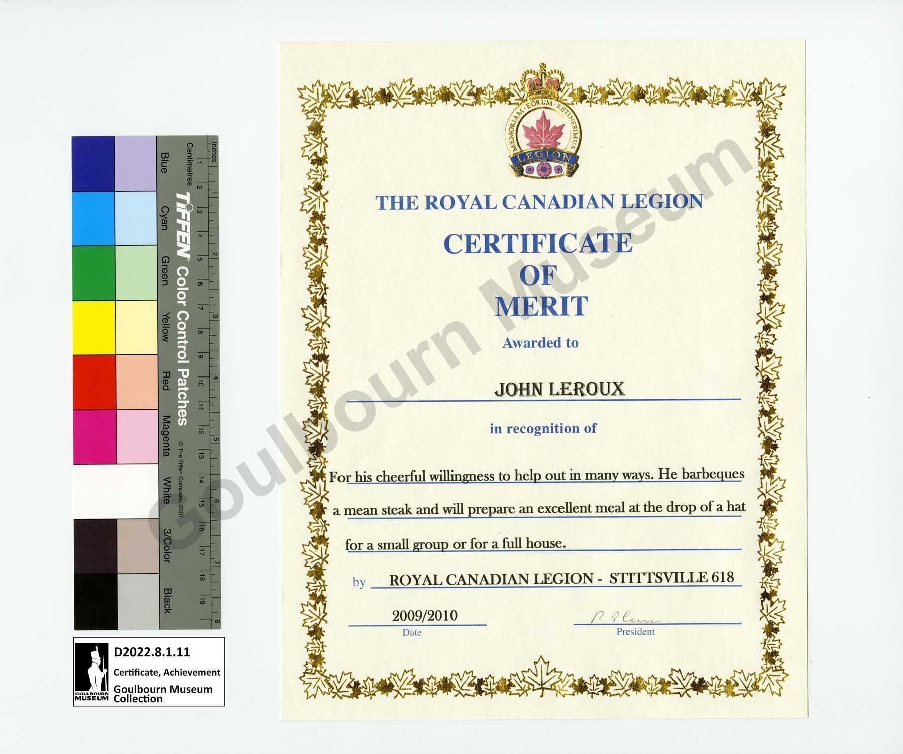 Certificate of Merit presented by the Royal Canadian Legion to John Leroux for 2009 - 2010. The document has a repeating maple leaf pattern border in metallic gold. At the top of the document is the Royal Canadian Legion crest with details in colour and metallic gold. The document reads, "The Royal Canadian Legion" "Certificate of Merit" "Awarded to" "John Leroux" "in recognition of" "For his cheerful willingness to help out in many ways. He barbeques a mean steak and will prepare an excellent meal at the drop of a hat for a small group or for a full house." "by ROYAL CANADIAN LEGION - STITTSVILLE 618" "2009/2010" "Date" [indistinguishable signature] "President"Context