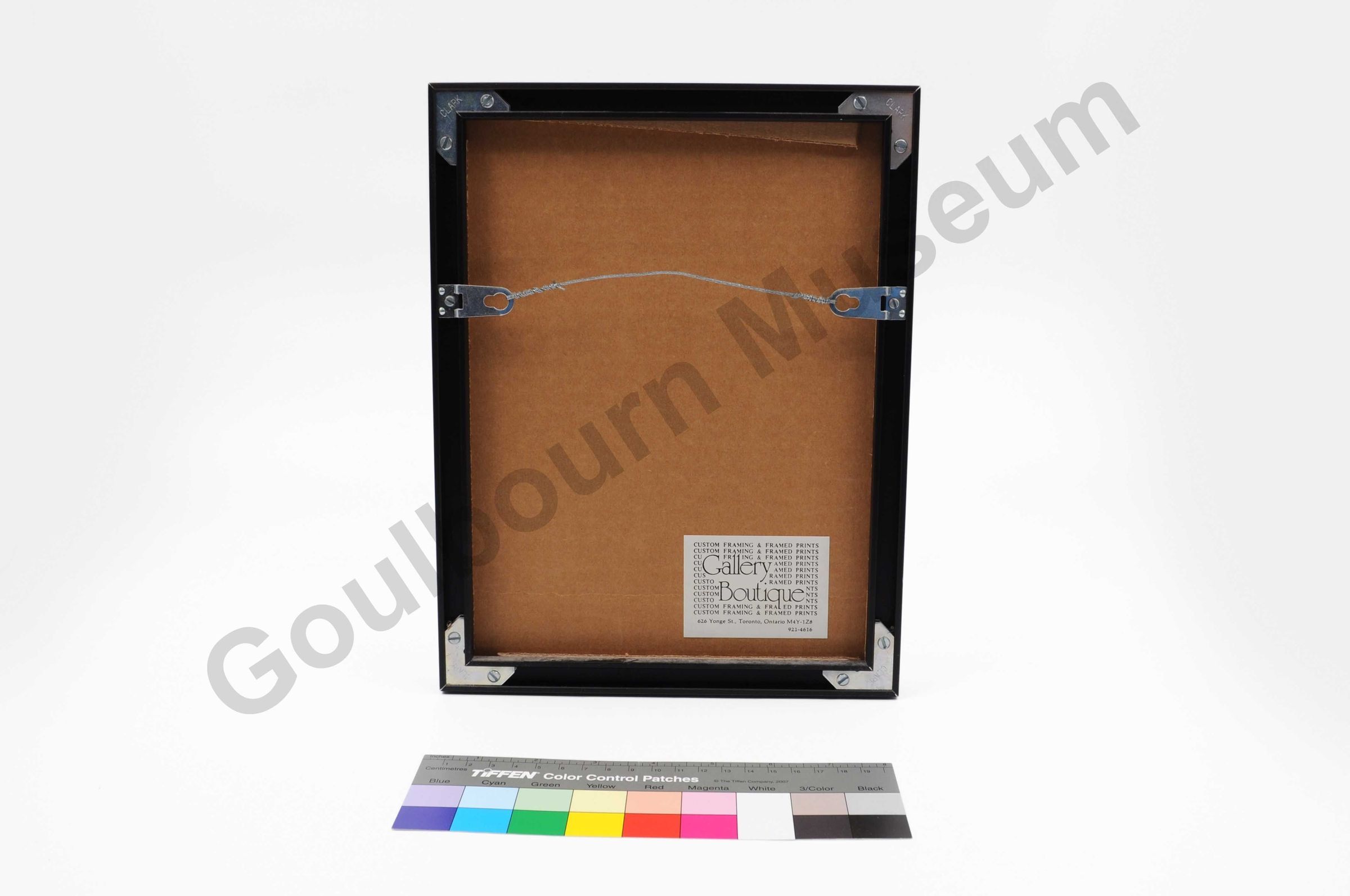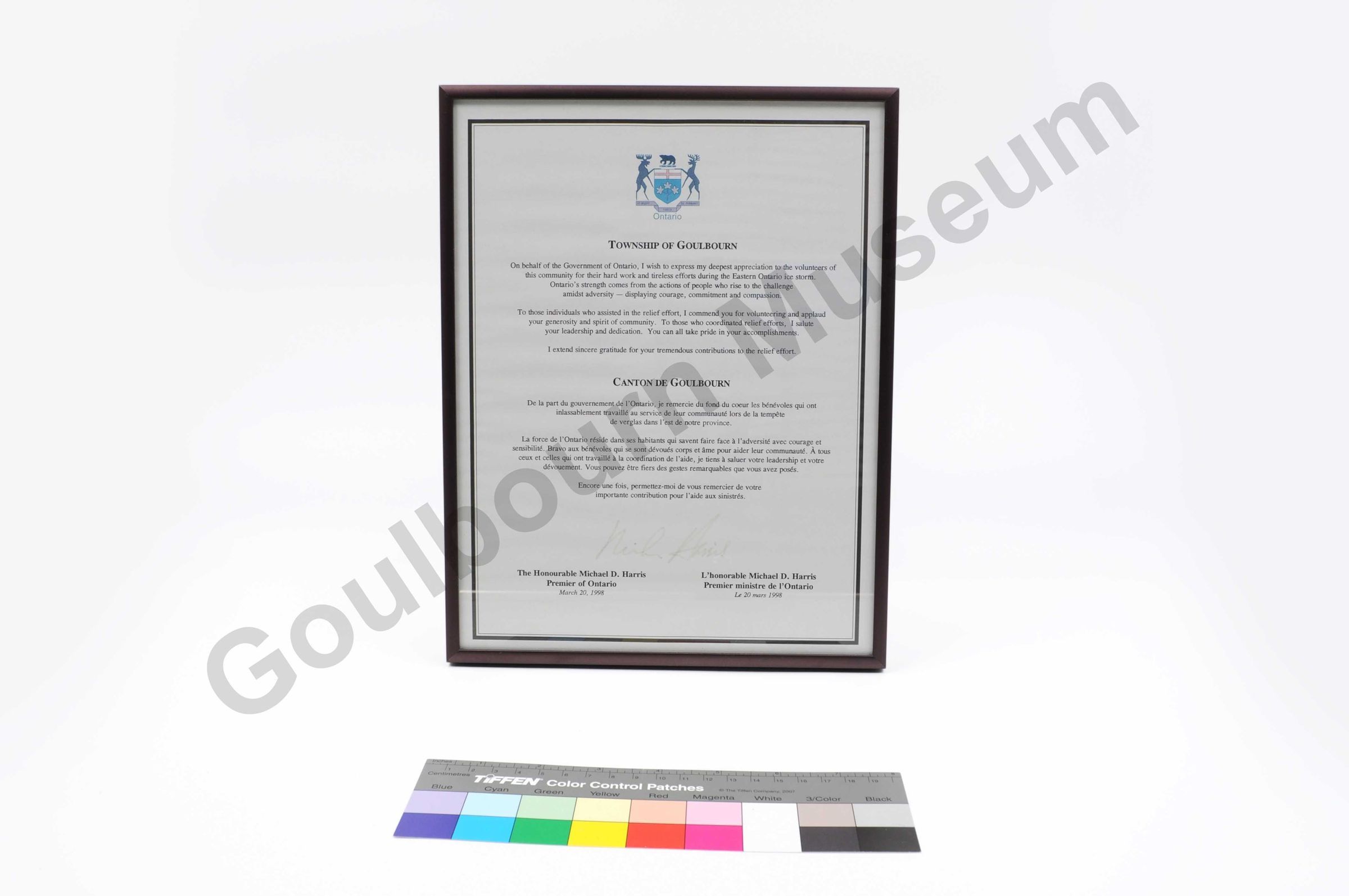 This item is a rectangular metal framed commemorative certificate celebrating the Goulbourn Township volunteers during the ice storm. At the top of this framed item is a coloured coat of arms of Ontario. Under this is the typed words in English and French (under the English font) of thanks and recognition towards the Volunteers of Goulbourn Township for their assistance in the Ice Storm of 1998. At the bottom of the item is the signature of the premier of Ontario - The Honourable Michael D. Harris. The reversed side of the item shows a cardboard backing under the metal frame. On both sides of the frame is the hardware that holds the thin metal wire that runs horizontally across the frame to support it on the wall when hung. In the bottom right corner of the reversed side of the frame is a white rectangular label depicting "Custom Framing & Framed Prints - Gallery Boutique."Context