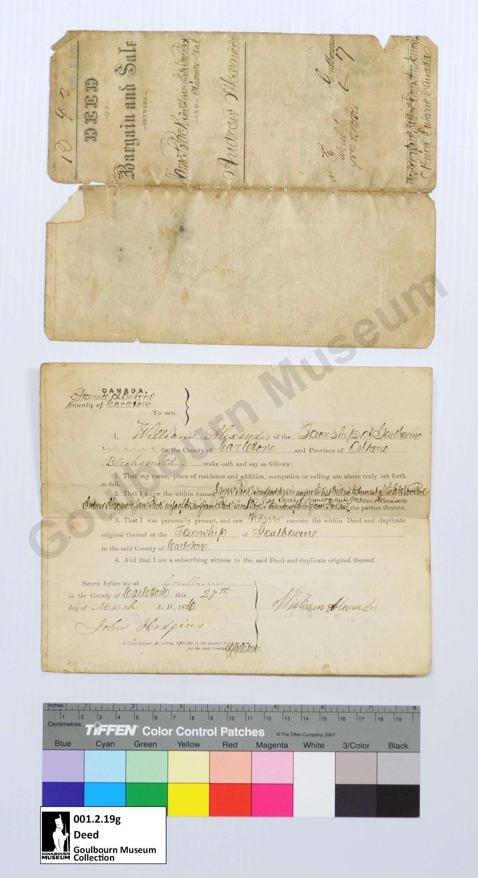 Deed of Bargain and Sale between James Pack Son & Devisee of late Isaac Pack and Andrew Alexander, March 27, 1876.Collection