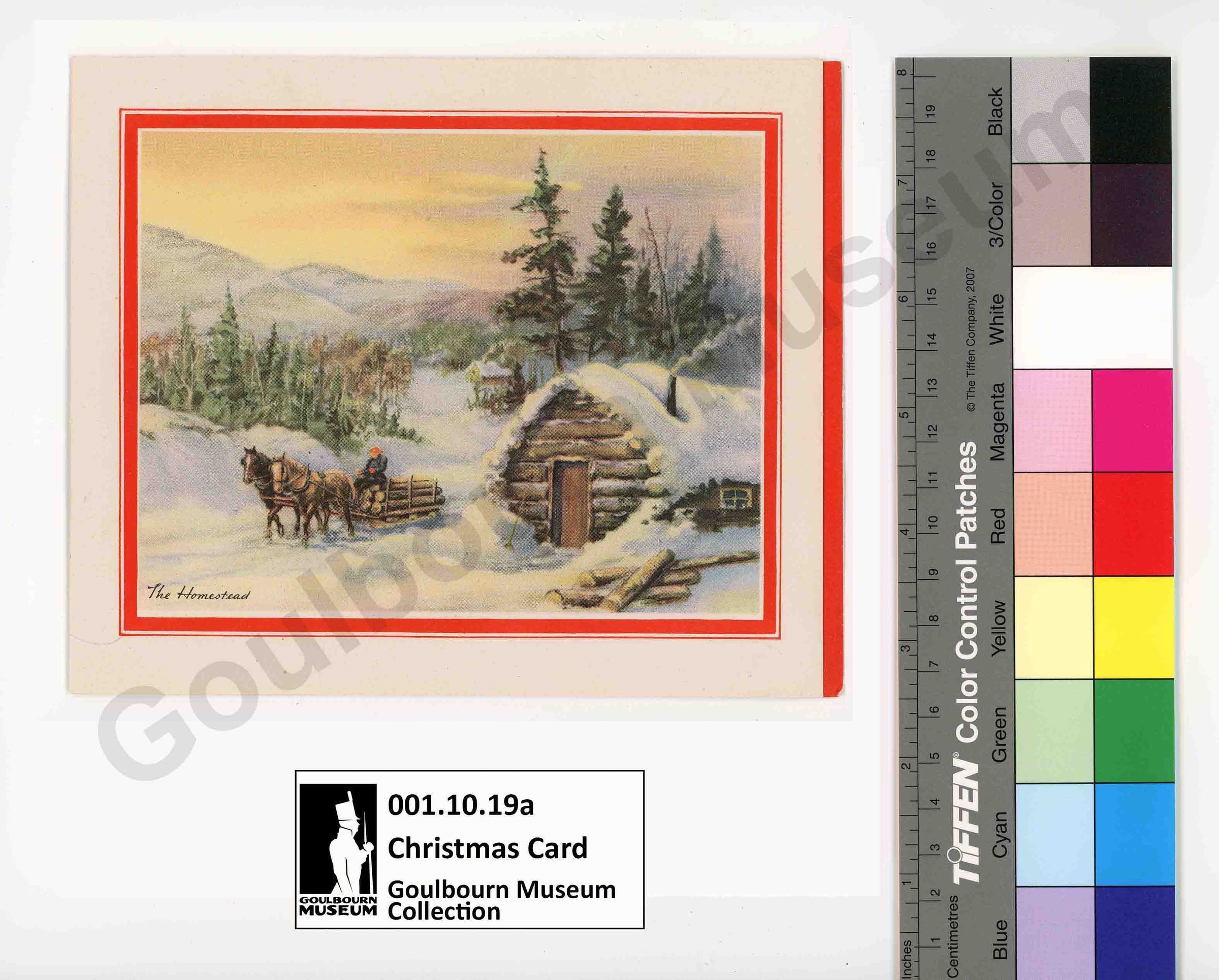 A Christmas and New Year "The Homestead" greeting card. On the front is a colour illustration of a winter scene with two horses pulling a man on a sled filled with logs, adjacent to a snowy log cabin.