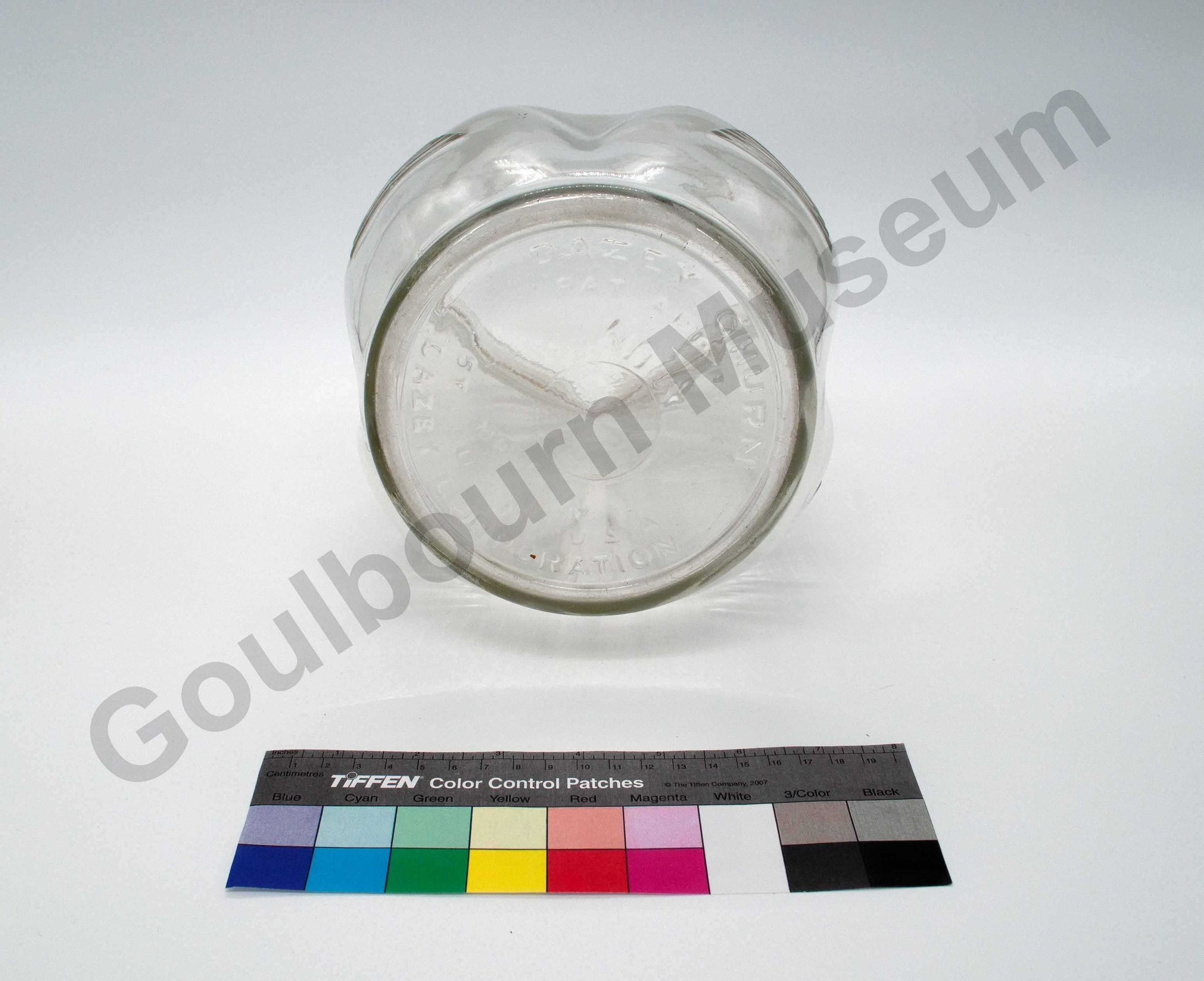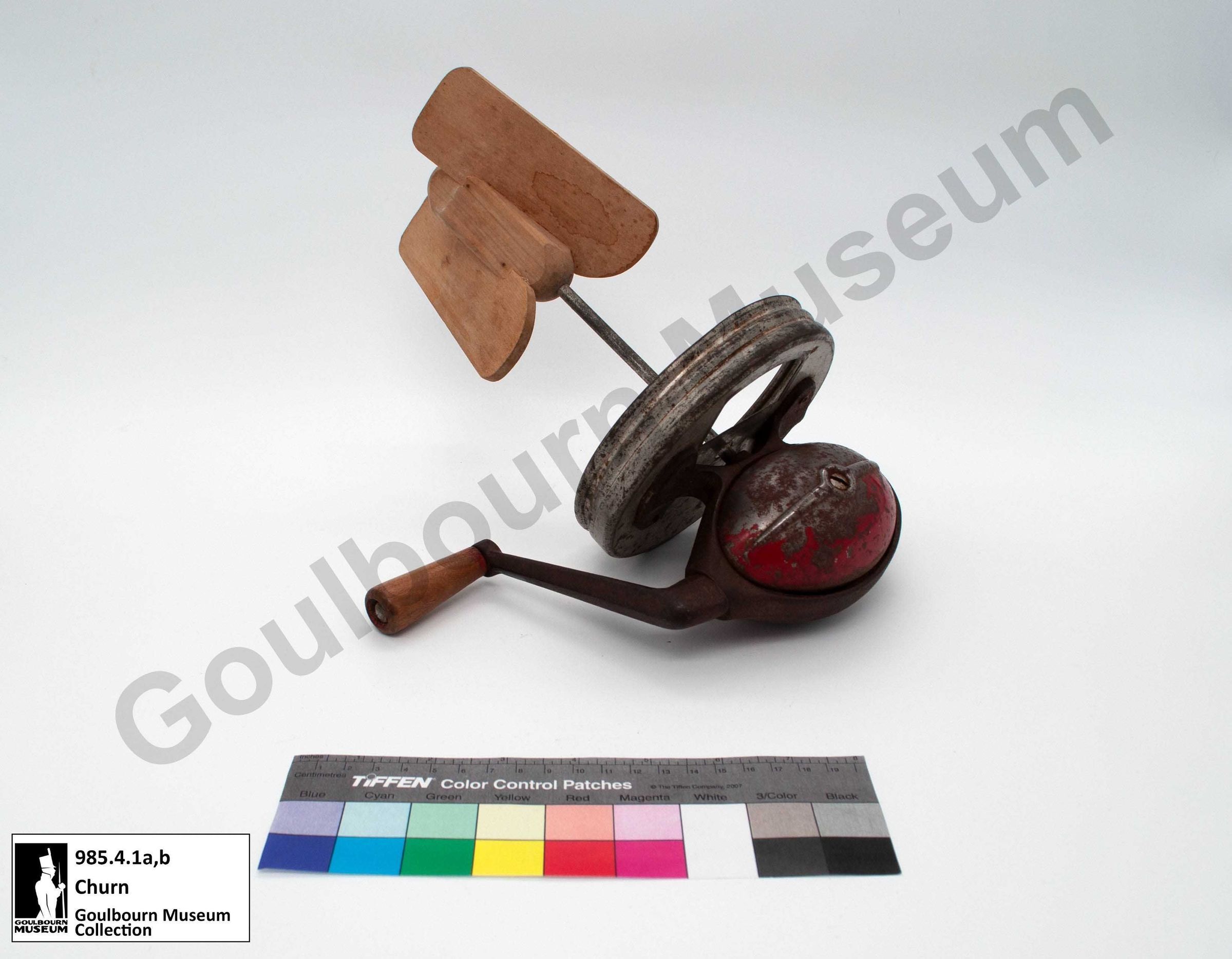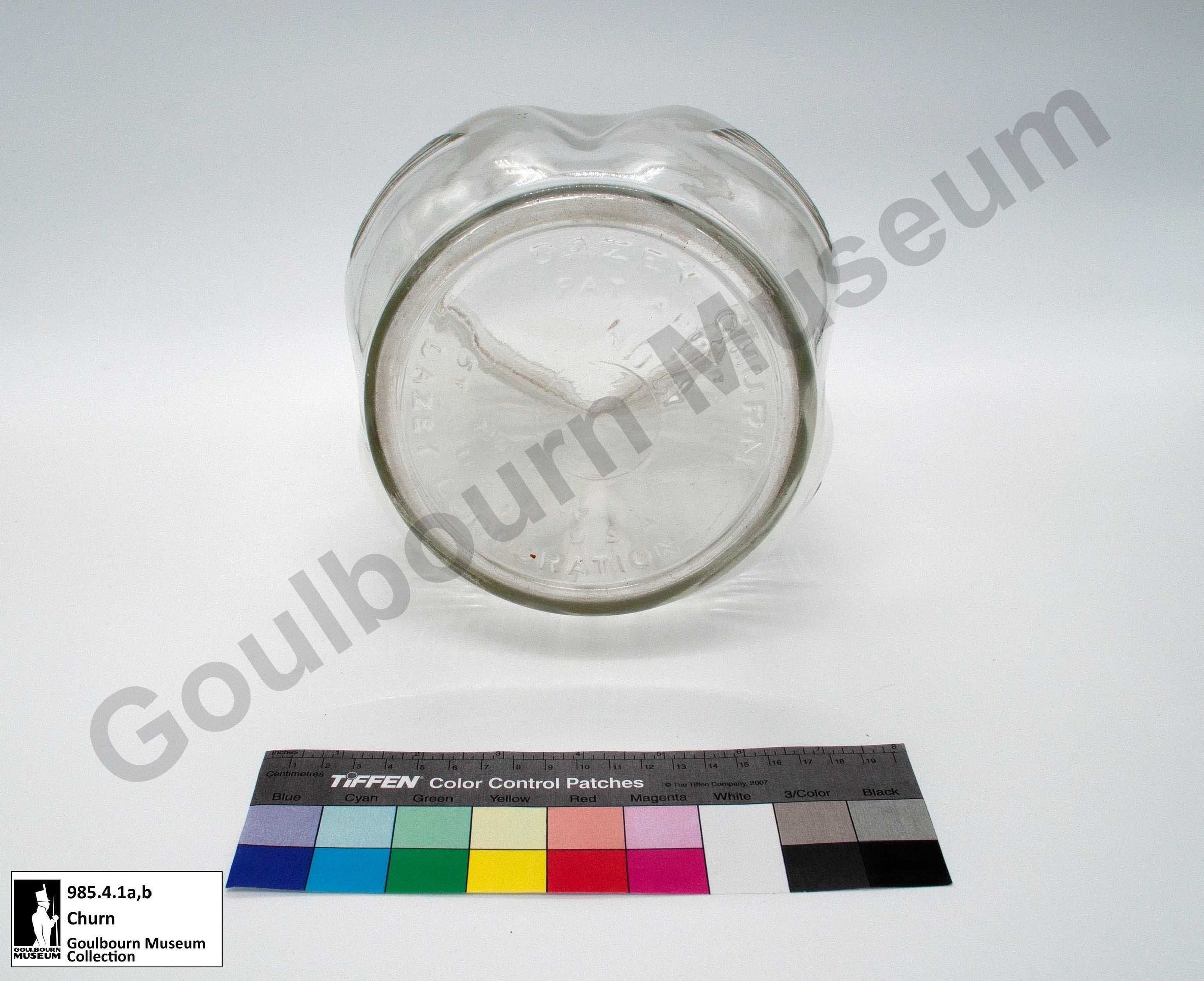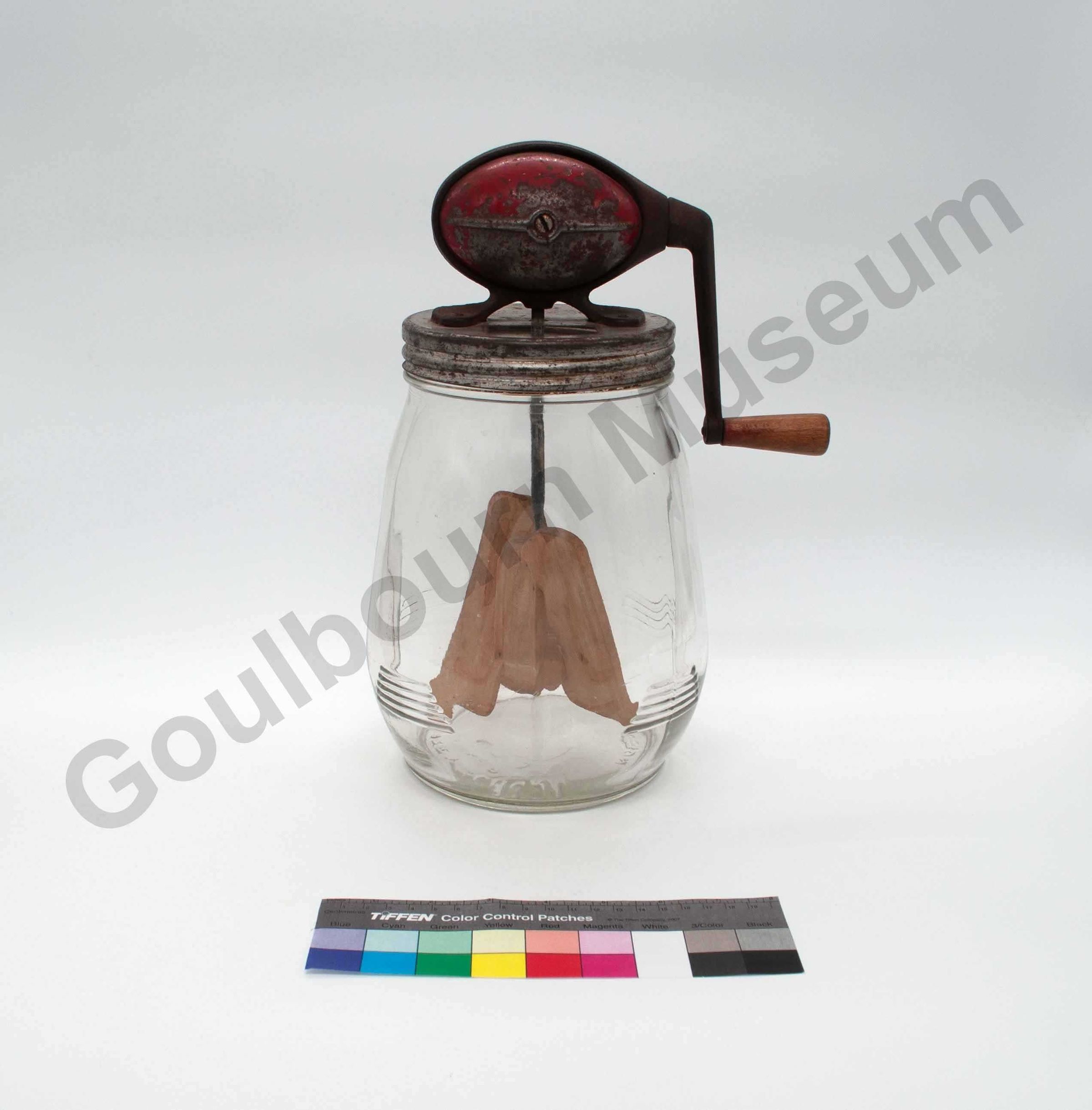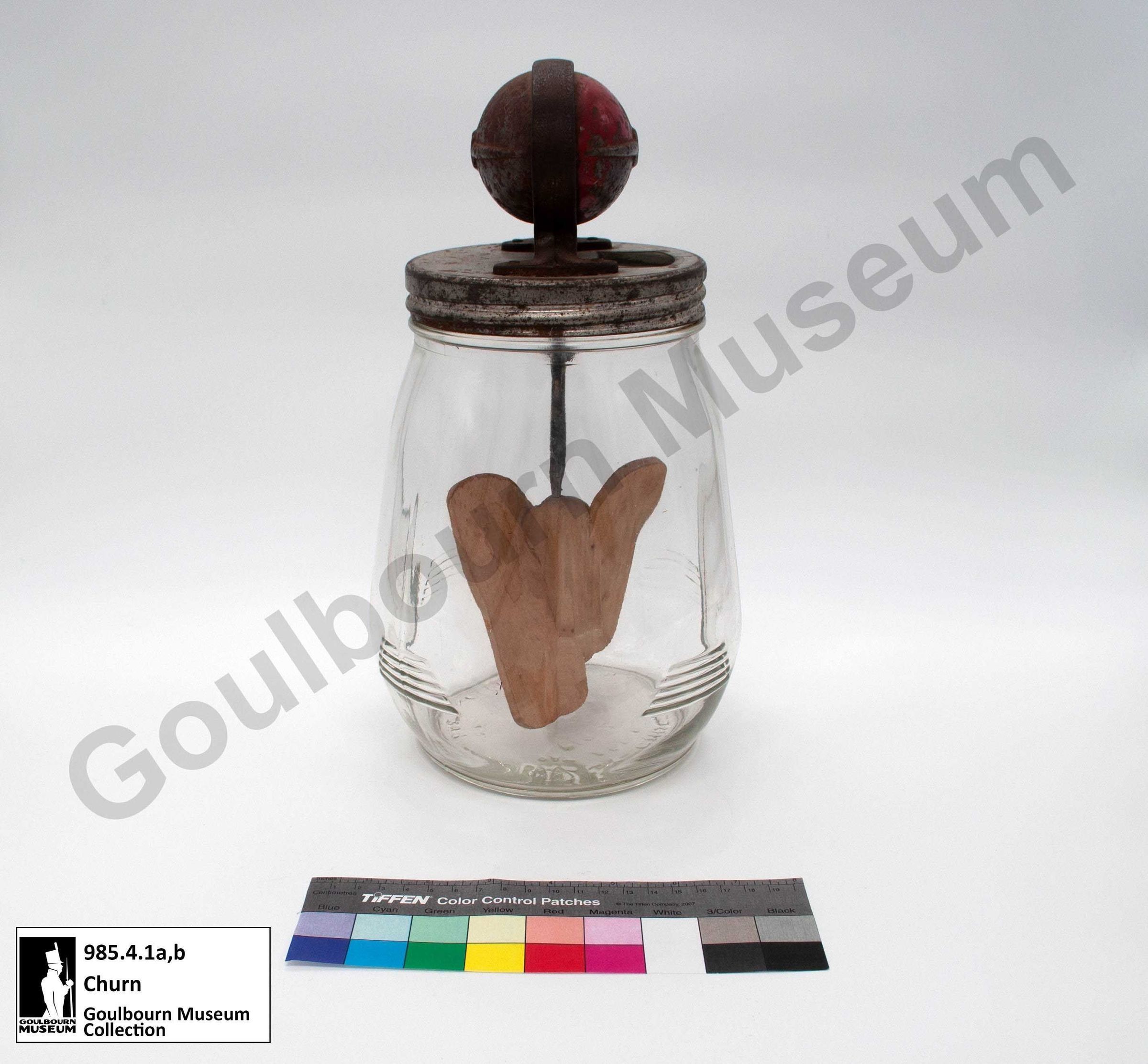 This Dazey Churn is used to churn butter and consists of two main parts: a) lid with red metal crank and wood handle and paddle and b) clear glass jar.