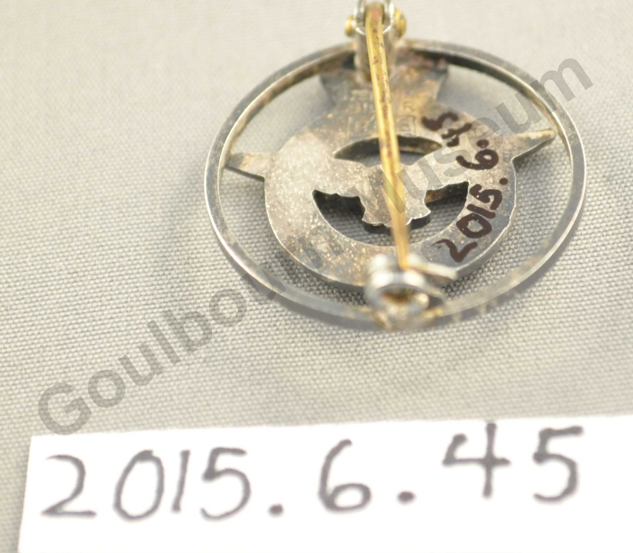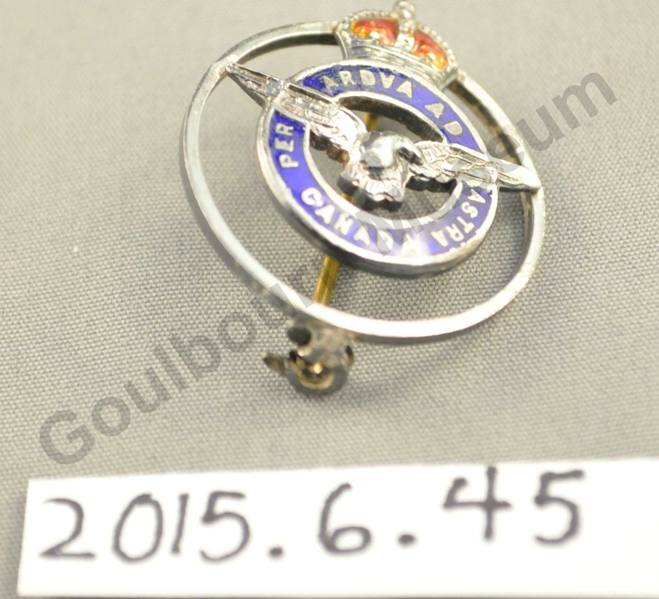 Circular metal pin comprised of two circles. The exterior circle is a thin 0.1cm circle, bound by the interior emblem on the proper left and right. The interior circle is a much thicker blue metal circle measuring 0.2cm, with text circling the interior reading "Ardva Ad Astra Canada Per". The top holds a red crown, and the middle portrays a metal bird stretching its wings across the entire pin. There is a pin fastener on the back.Lexicon