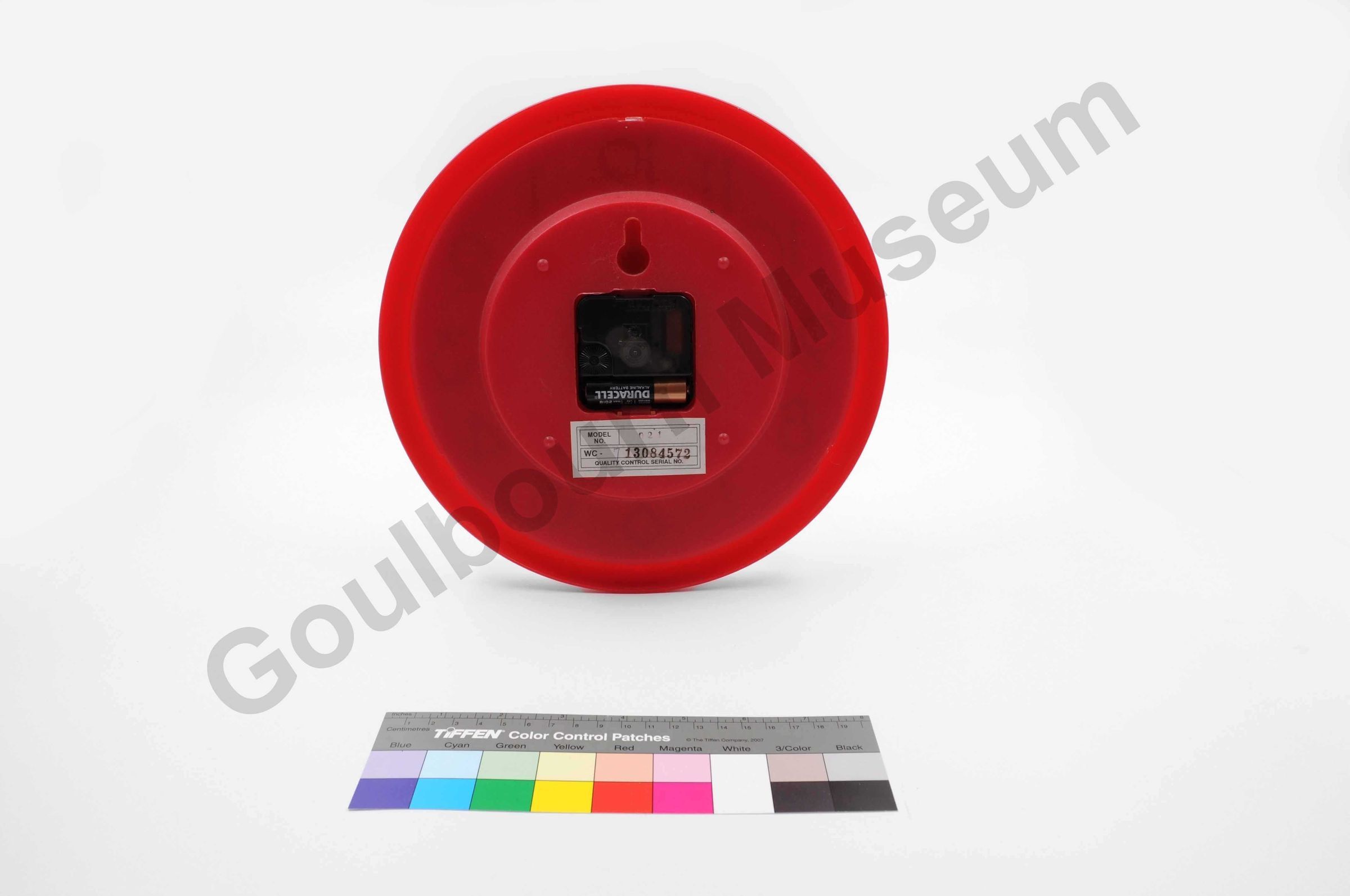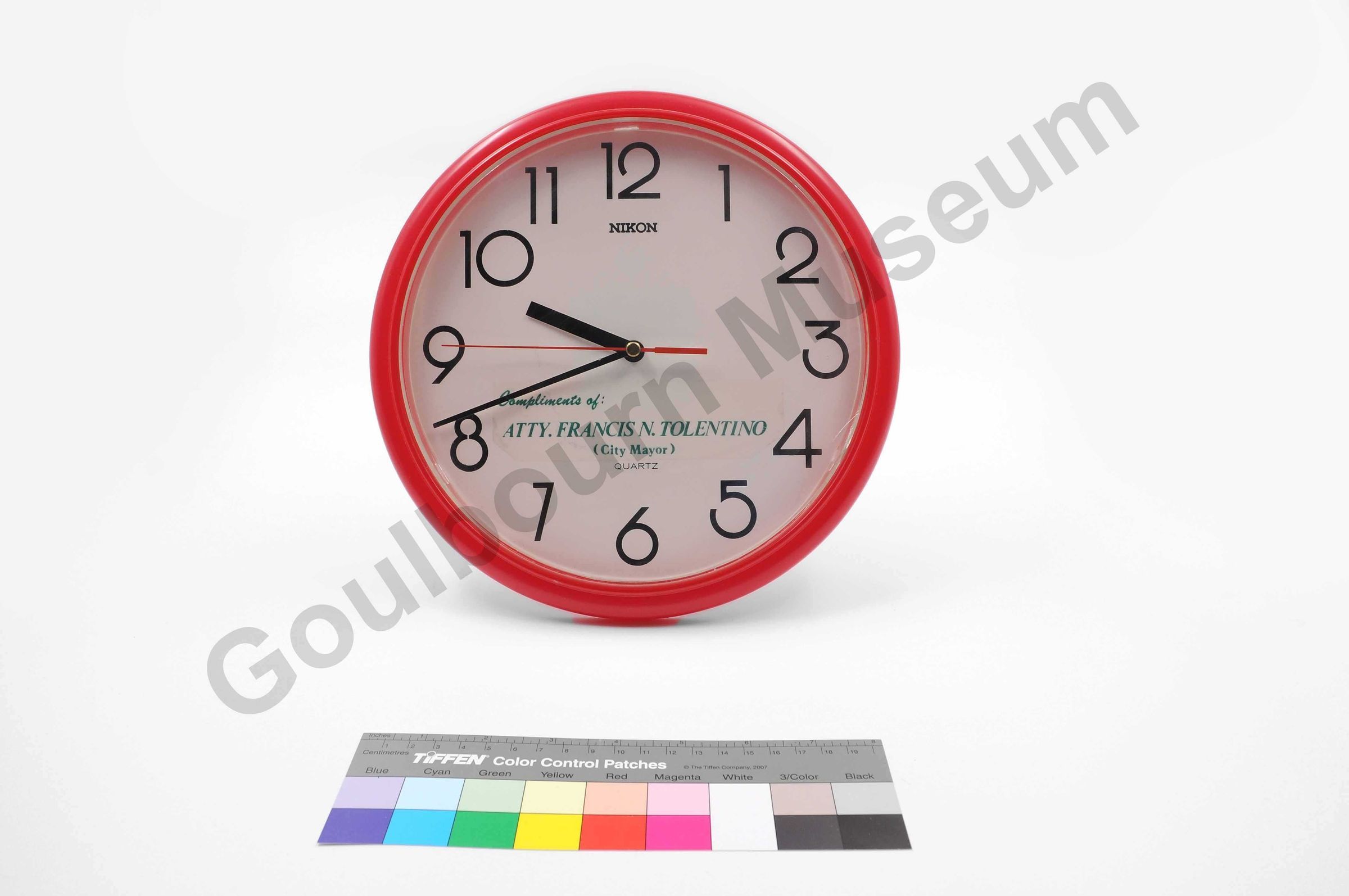 This item is a circular wall clock with a circular red plastic frame surrounding the clock face. In the middle of the clock face, written in green coloured font is, "Compliments of: Atty. Francis N. Tolentino (City Mayor)." Under the number 12 on the clock face is the word, "NIKON" while above the number 6 is the word "QUARTZ." The clock has three time hands, one short thicker black coloured hour hand, one long thin black coloured minute hang, and one long slight red coloured second hand. On the reversed side of the clock is a hole for hanging the clock. Under this are the mechanical components of the clock and space for a AA style battery. Under the battery, a white label displays the model no. (a faded) 021 and a WC-713084572. Quality Control Serial No.Context