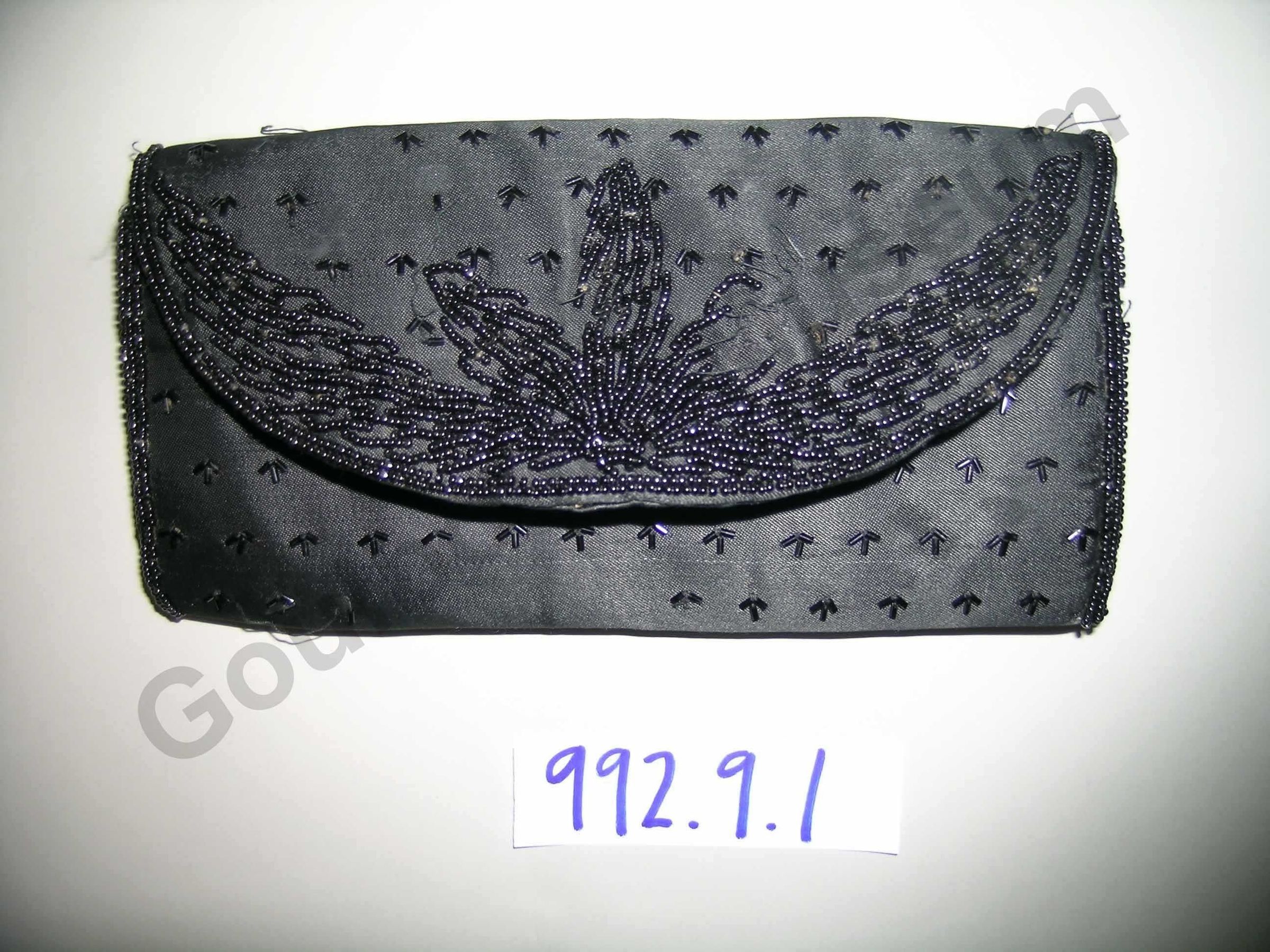 Black satin clutch with beaded design; the interior contains a small pocket, suitable for storing cards. A label sewn to the interior reads: "Styled by Du-val, Made in Japan."
