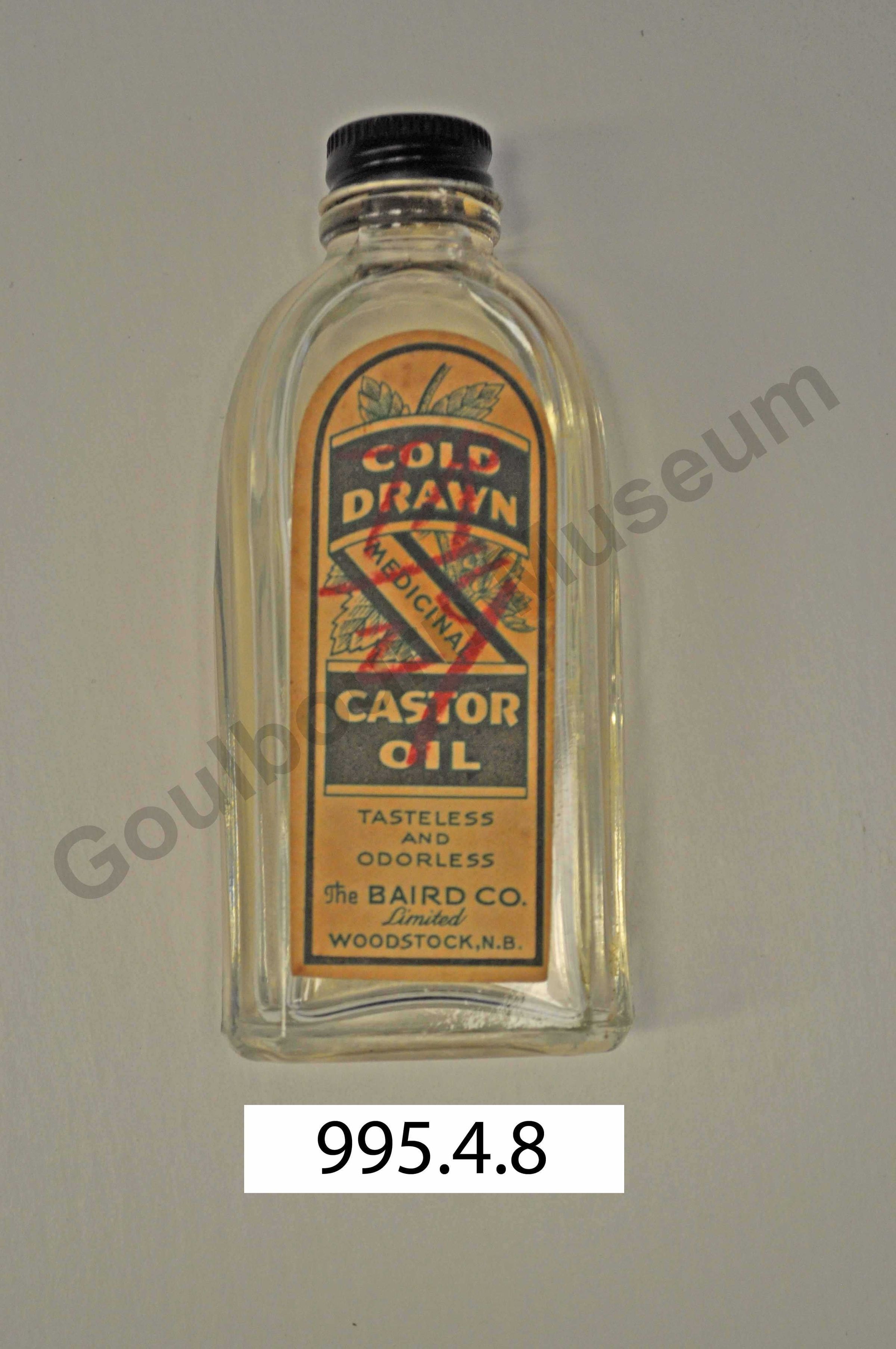 One Clear glass bottle with a black aluminum cap. Label on bottle reads: Cold drawn Medicinal Castor Oil Tasteless Odorless The Bird Co. Limited Woodstock N.B.