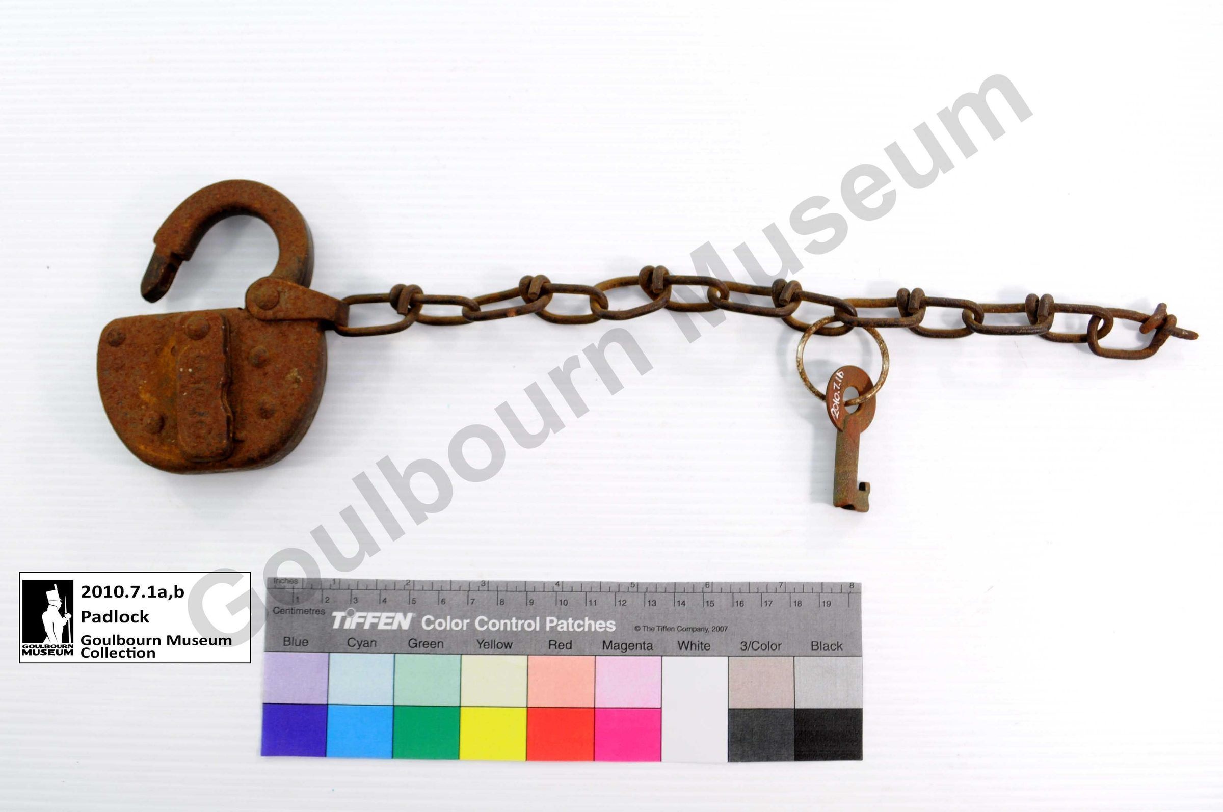 Padlock, chain and key used on a shed at the Stittsville CPR station.Collection