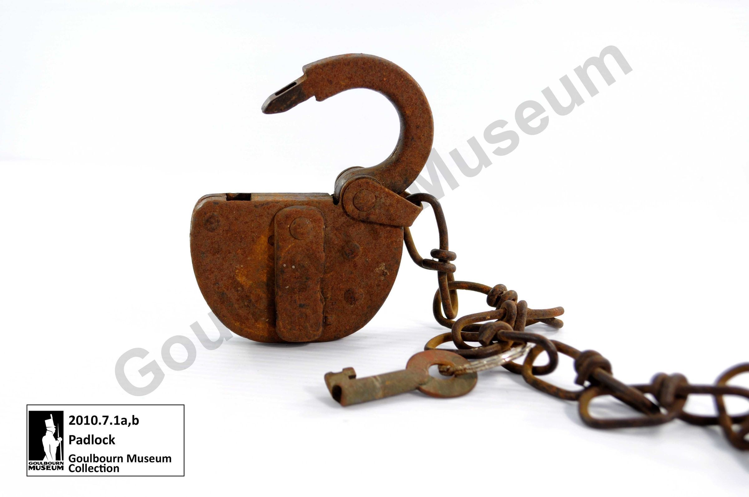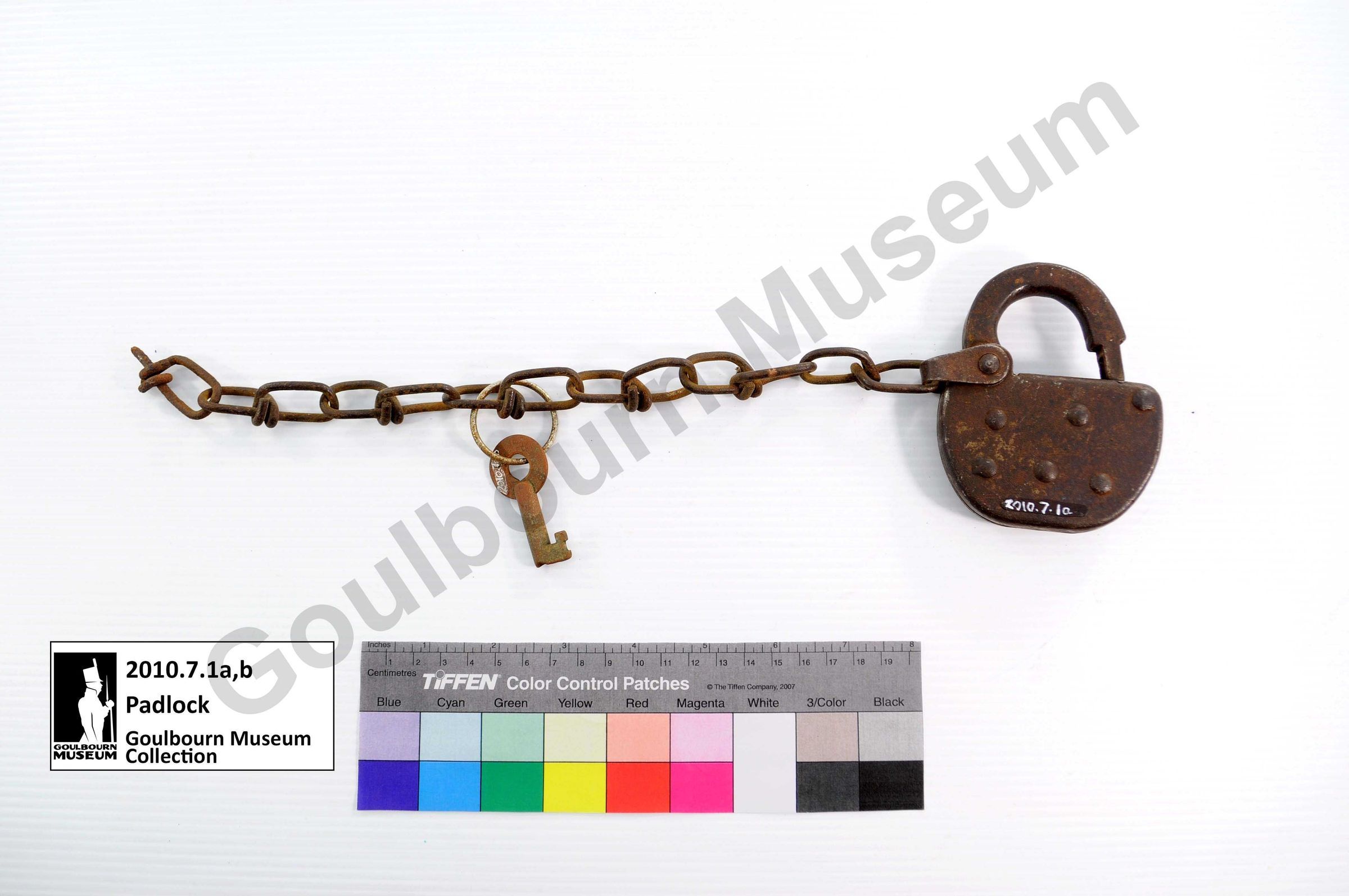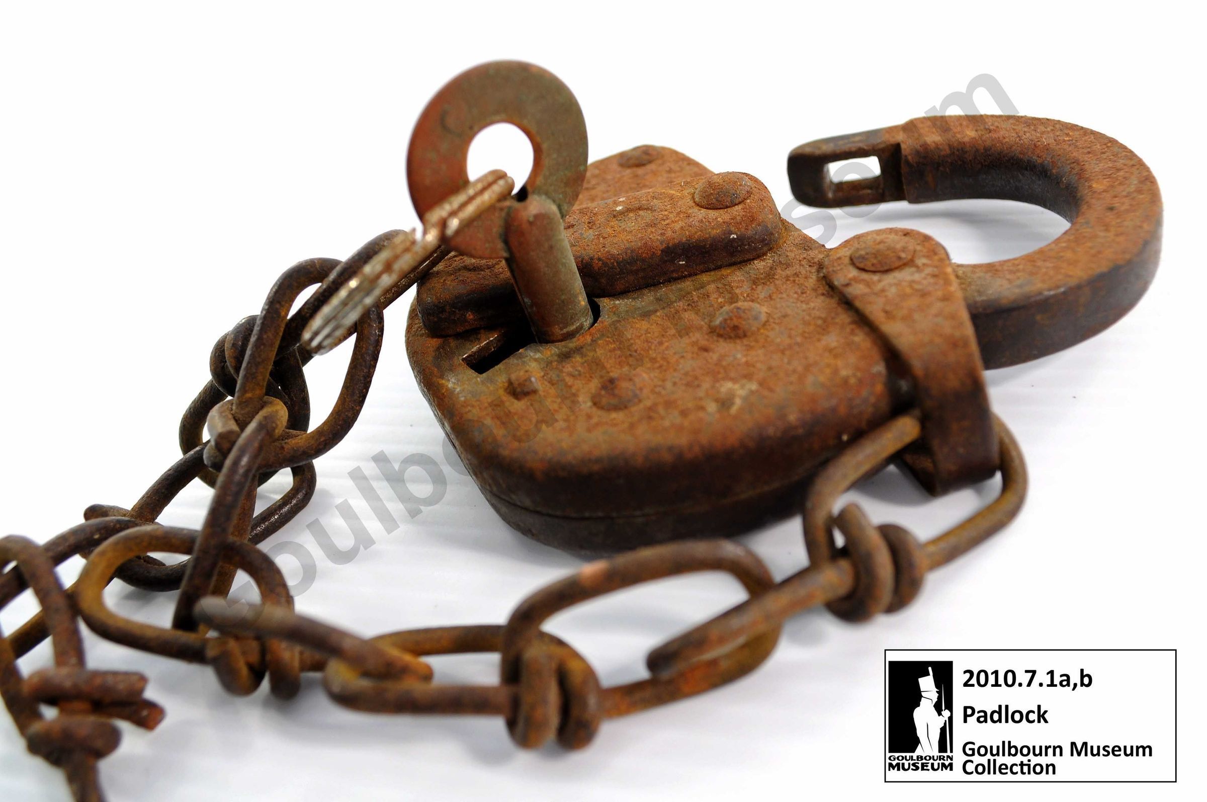 One iron padlock with chain links and key ring attached. The front of the lock has "CPR" inscribed on the keyhole cover. The lock was used on a shed at the Stittsville CP Rail station. The padlock is attached to a chain. The key is also attached to the chain. The padlock is component “a,” and the key is component “b”.Context