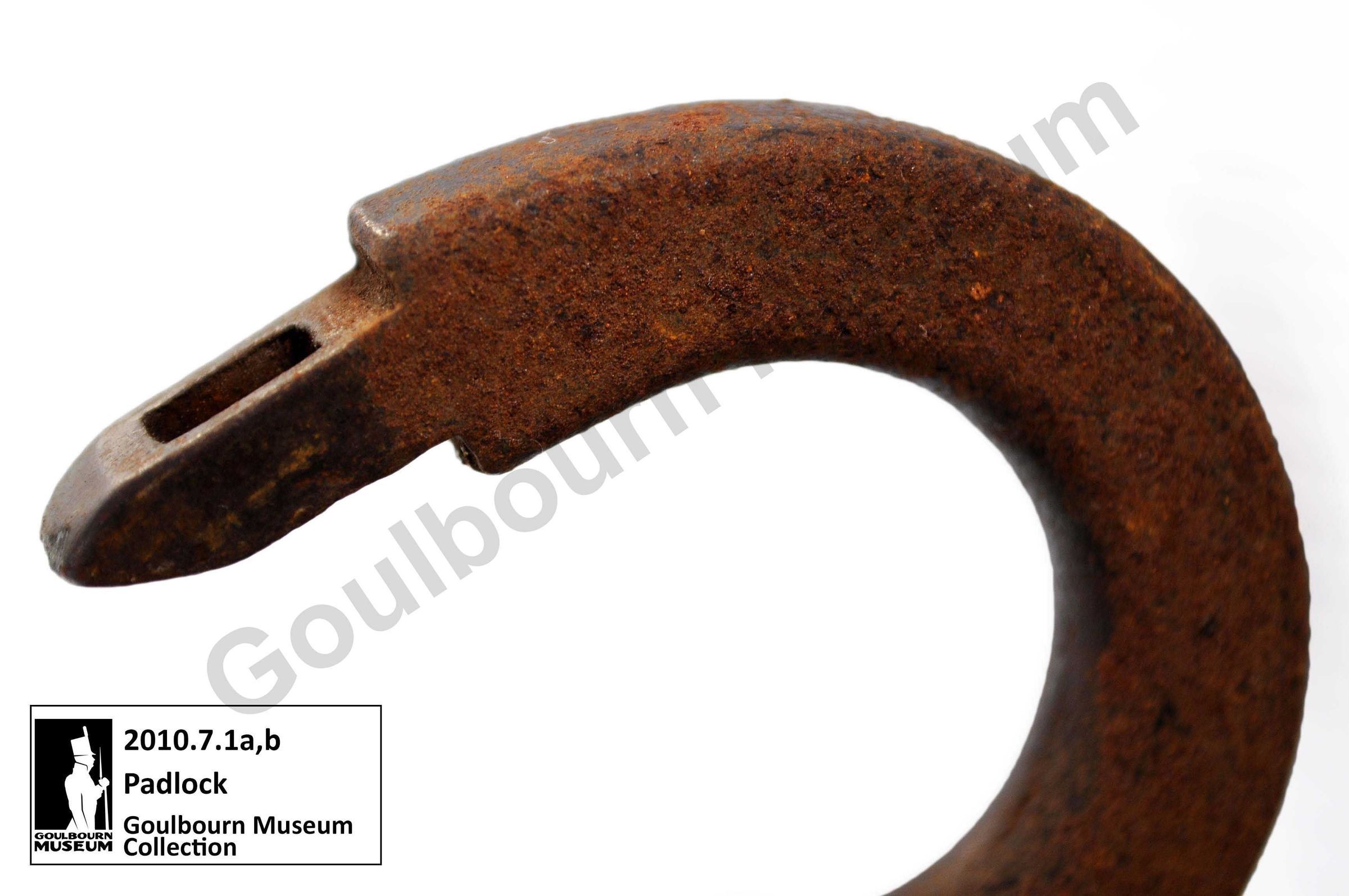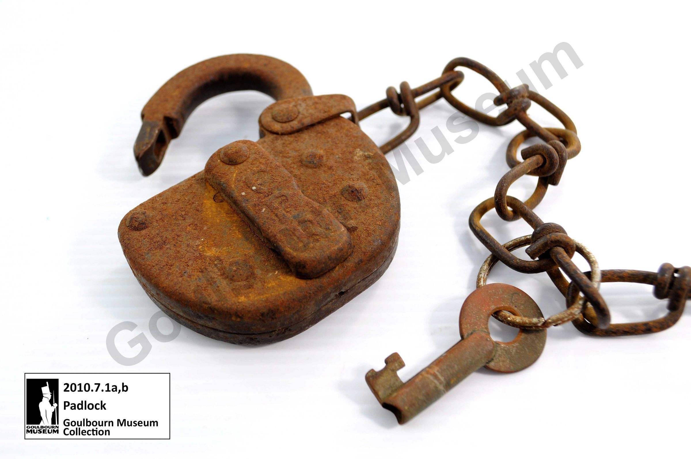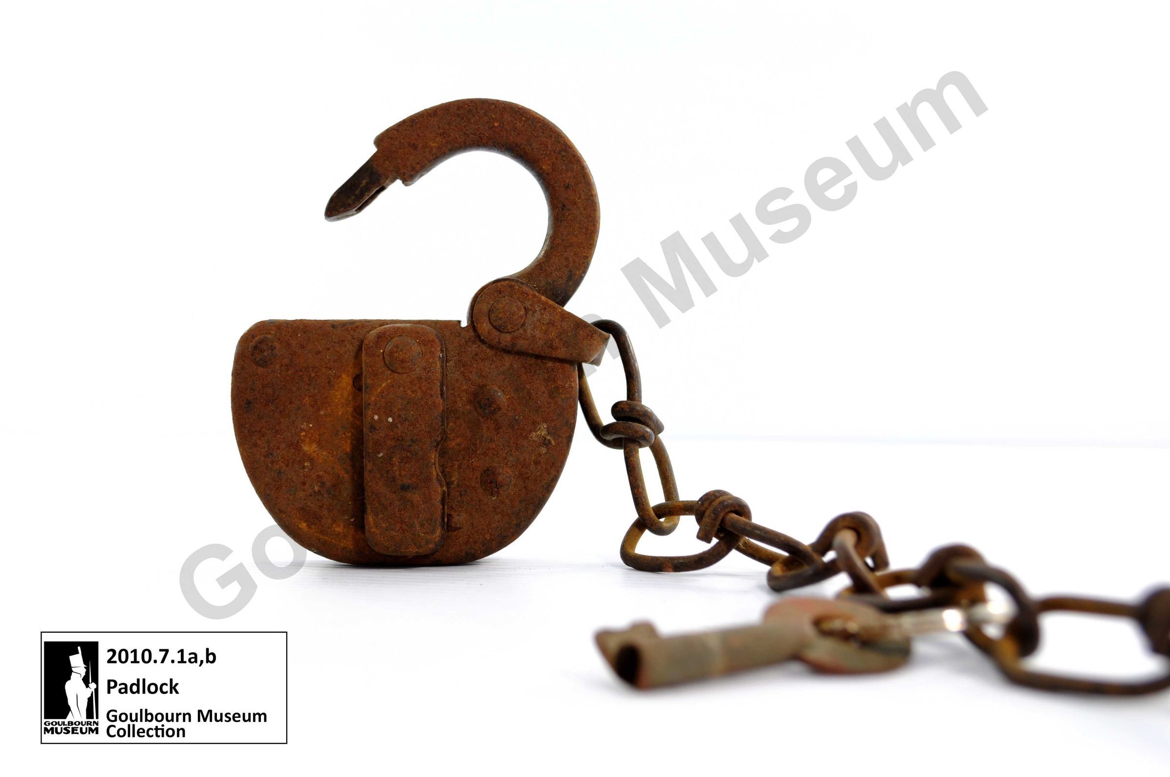 One iron padlock with chain links and key ring attached. The front of the lock has "CPR" inscribed on the keyhole cover. The lock was used on a shed at the Stittsville CP Rail station. The padlock is attached to a chain. The key is also attached to the chain. The padlock is component “a,” and the key is component “b”.Context