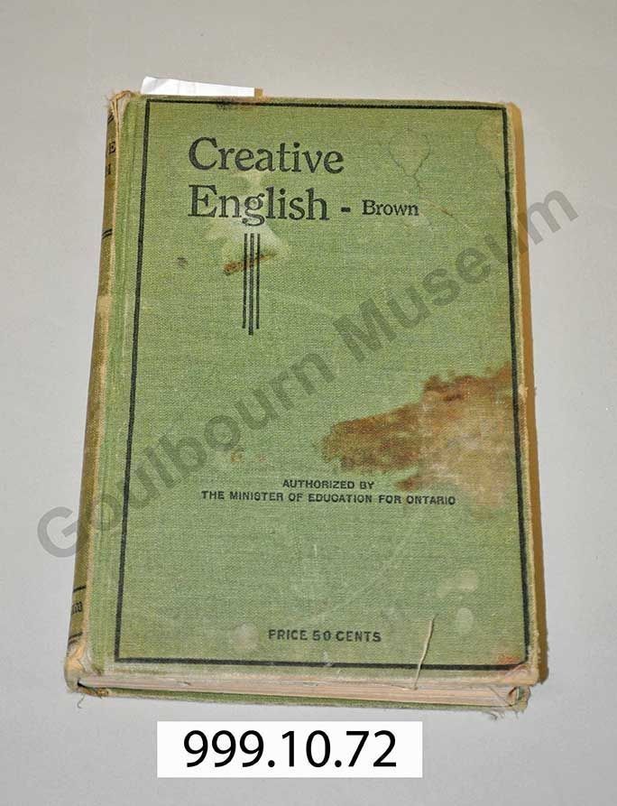 Green textbook with black ink which reads "Creative English - Brown. Authorized by the Minister of Education for Ontario".