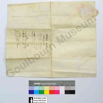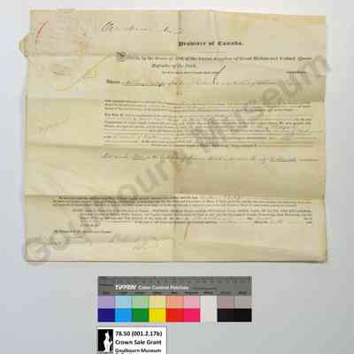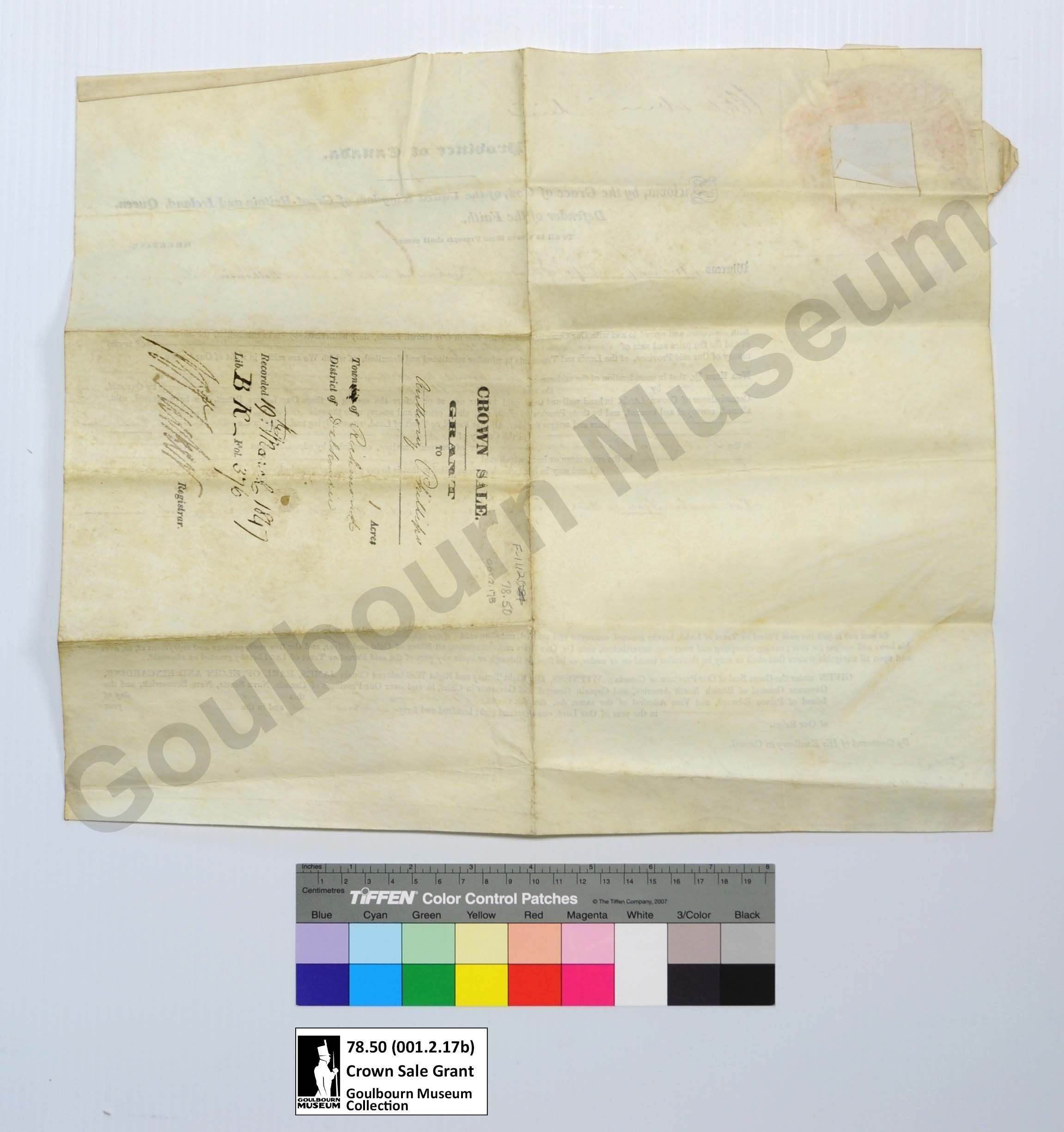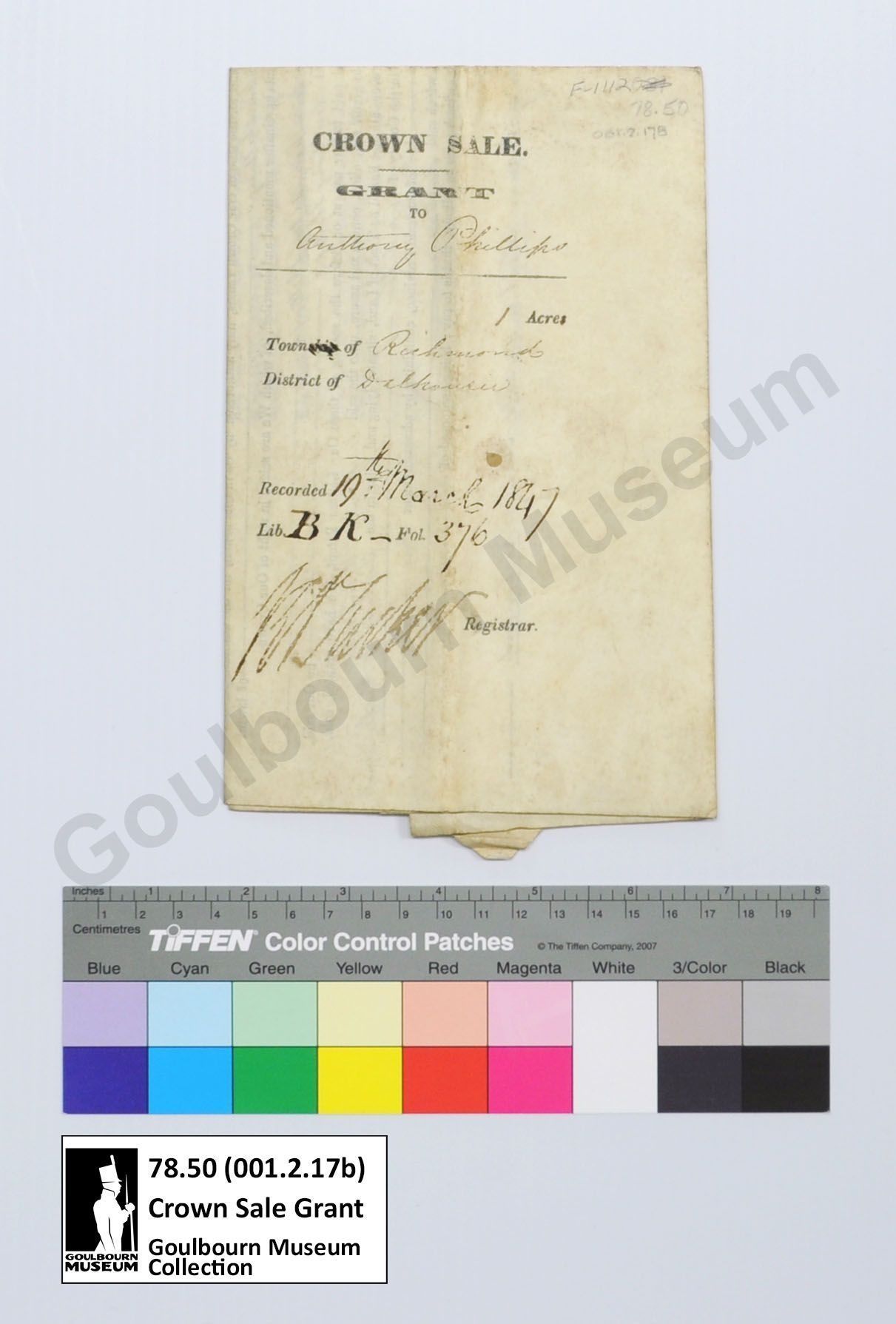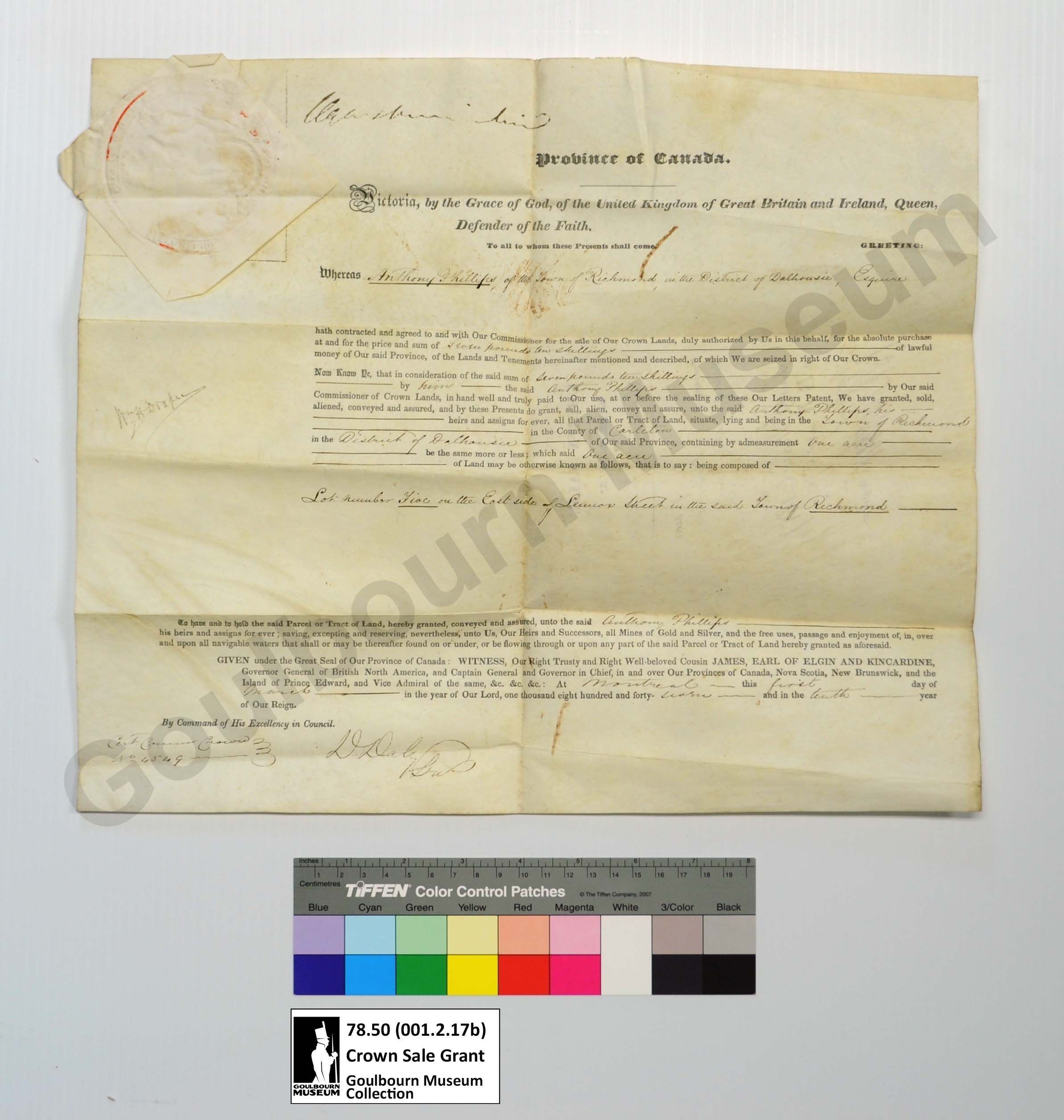 Province of Canada Crown Sale Grant presented to Anthony Phillips for one acre, lot number 5 on the east side of Lennox Street of the Town of Richmond.Collection