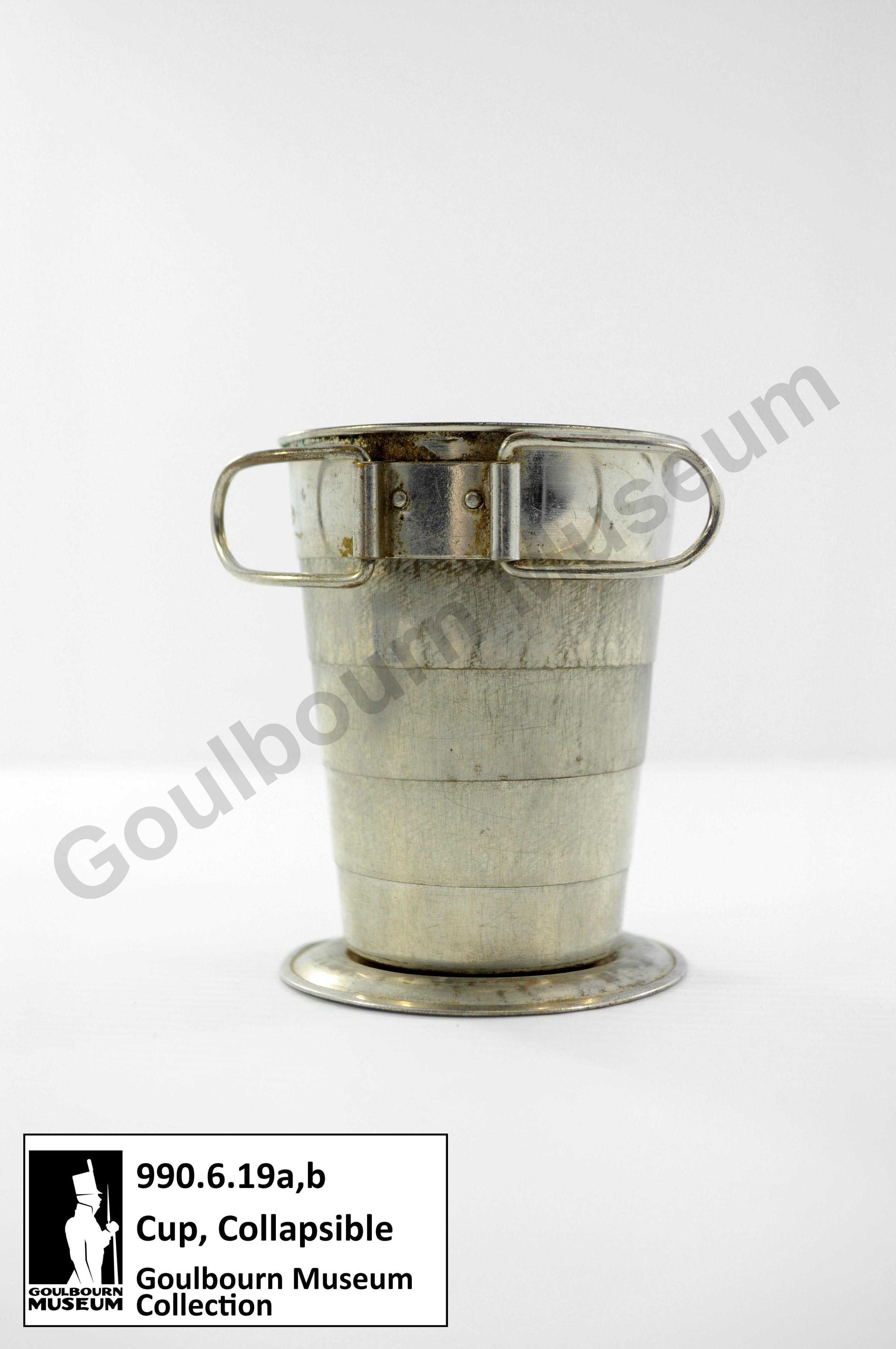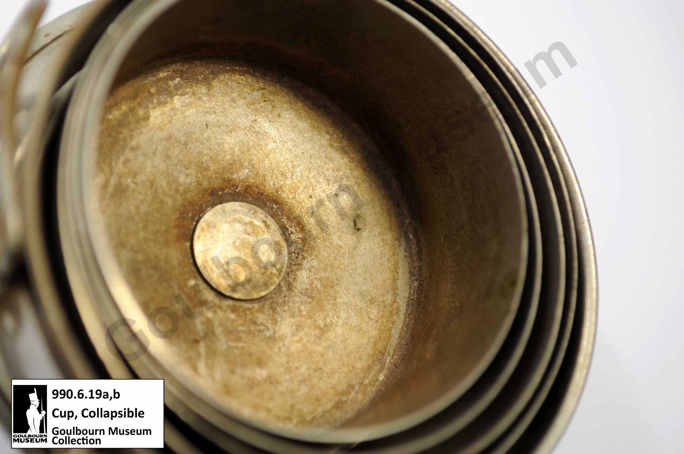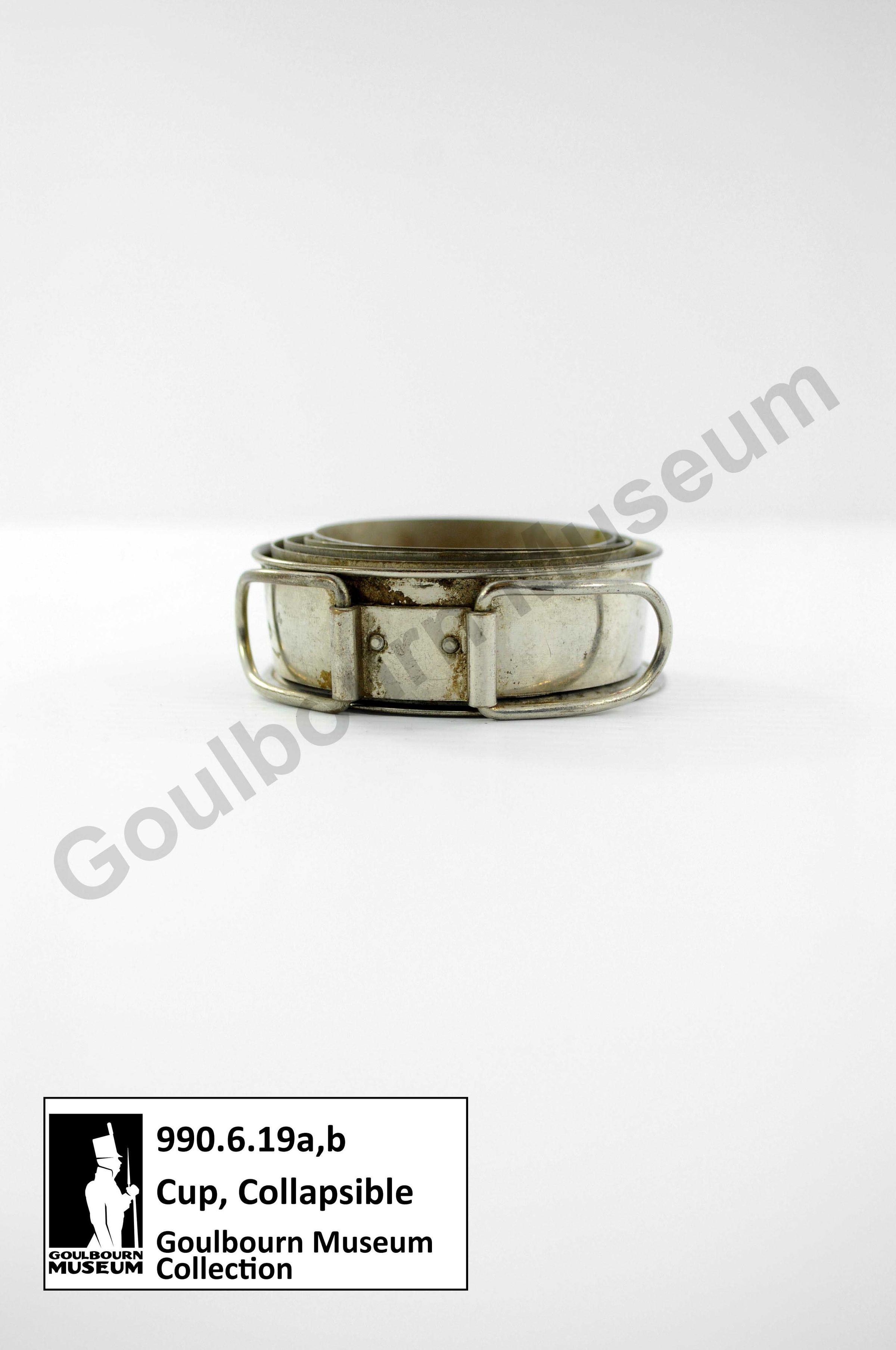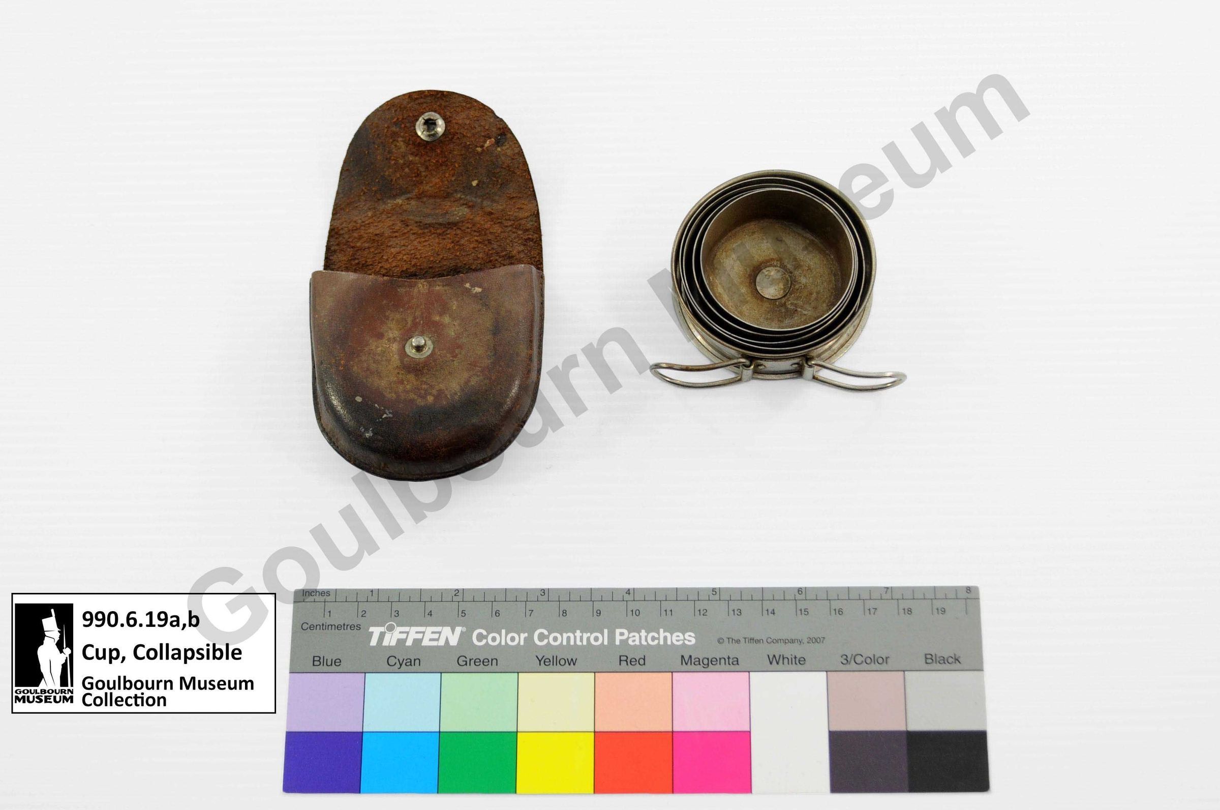 This object is a collapsible metal drinking cup 990.6.19a with an accompanying leather carrying case 990.6.19b. The cup is light grey in color and is comprised of 5 telescoping bands. The top band features a pair of metal tension buckles which, when closed, cause the cup to retain its extended shape. The bottom of the cup features a circular, rimmed, base with a slight slope leading outwards and downwards from the center. A circular attachment piece at the bottom of the cup's interior affixes the collapsing section to the metal base. The leather carrying case is pouched shape with a folding cover. The cover snaps to the body of the case by a metal snap fastener. The exterior leather is varying shades of mottled brown. The exterior leather of the case is smoother than the interior. The interior leather is more uniform in color, a slightly reddish brown, and appears rough in texture.Context