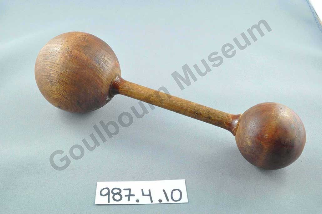 Darning Eggs: One on each end (large & small) attached together. Wooden sock darning tool consisting of a tapered handle with wooden shperes at either end. Stained red brown and has a lacquer finish.