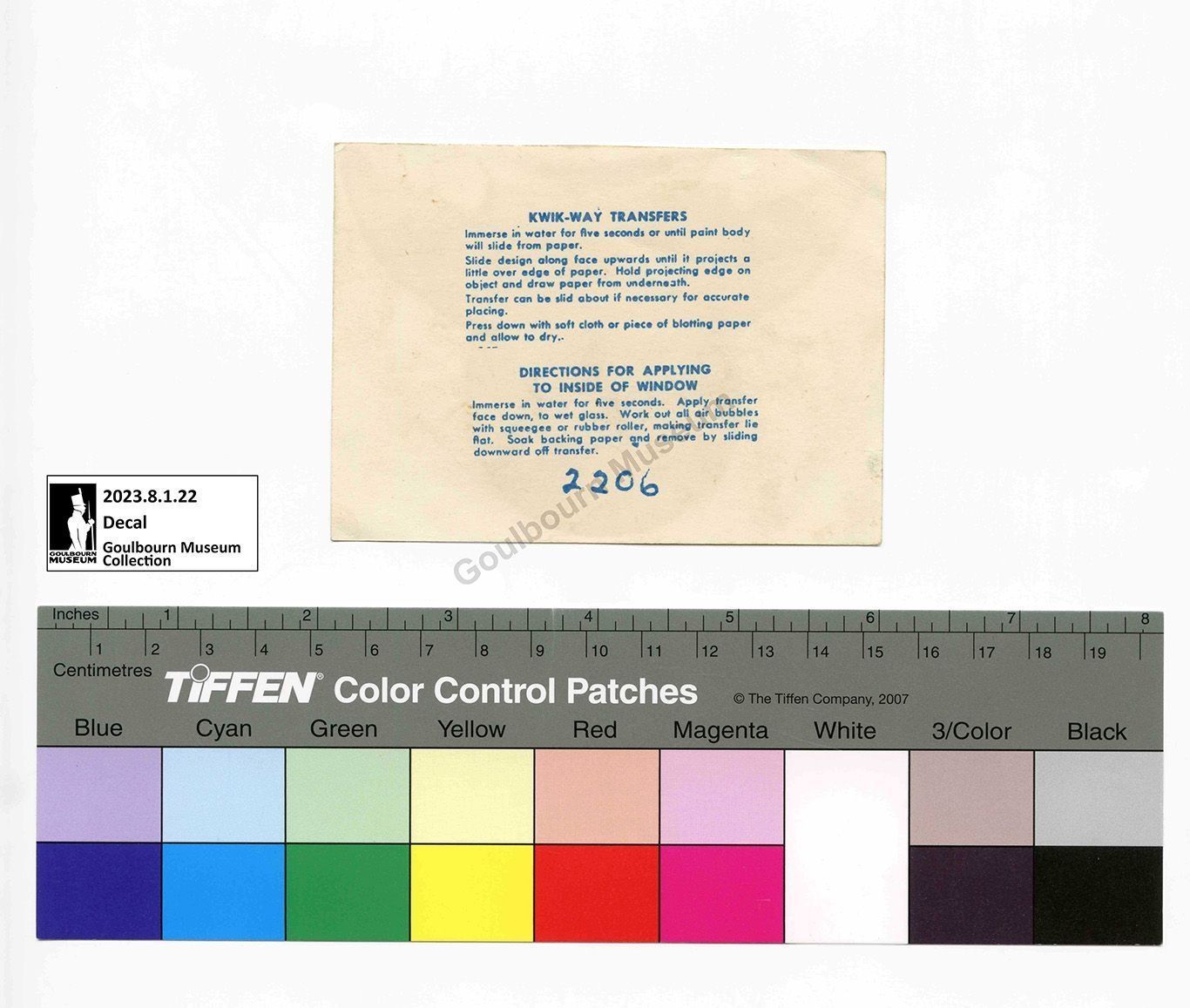 Horizontal rectangular paper with transfer decal. Image on decal includes the RCAF eagle it wings open and extending upward. The eagle is yellow with dark blue feather, face and feet detailing all outlined in dark blue. Centered above the eagle, between its open wings, is small red rectangle with bold yellow all caps text "member". The eagle's feet hold a red half circle, bottom down, outlined in yellow with bold yellow all caps text "RCAF" running horizontally across the red circle. A secondary dark blue half circle contains the red half circle and starts behind and halfway down the bird. The blue half circle is outlined in yellow and contains all caps text "ground observers corps" this text runs just below the red half circle along the interior circumference of the blue. The back of the rectangular paper contains blue printed text in the center of the paper that sits slightly unsquared.Context