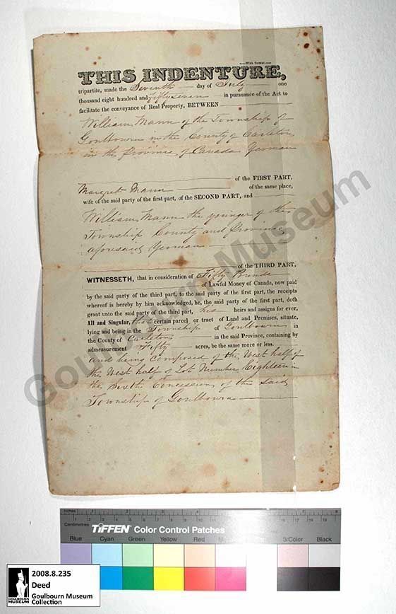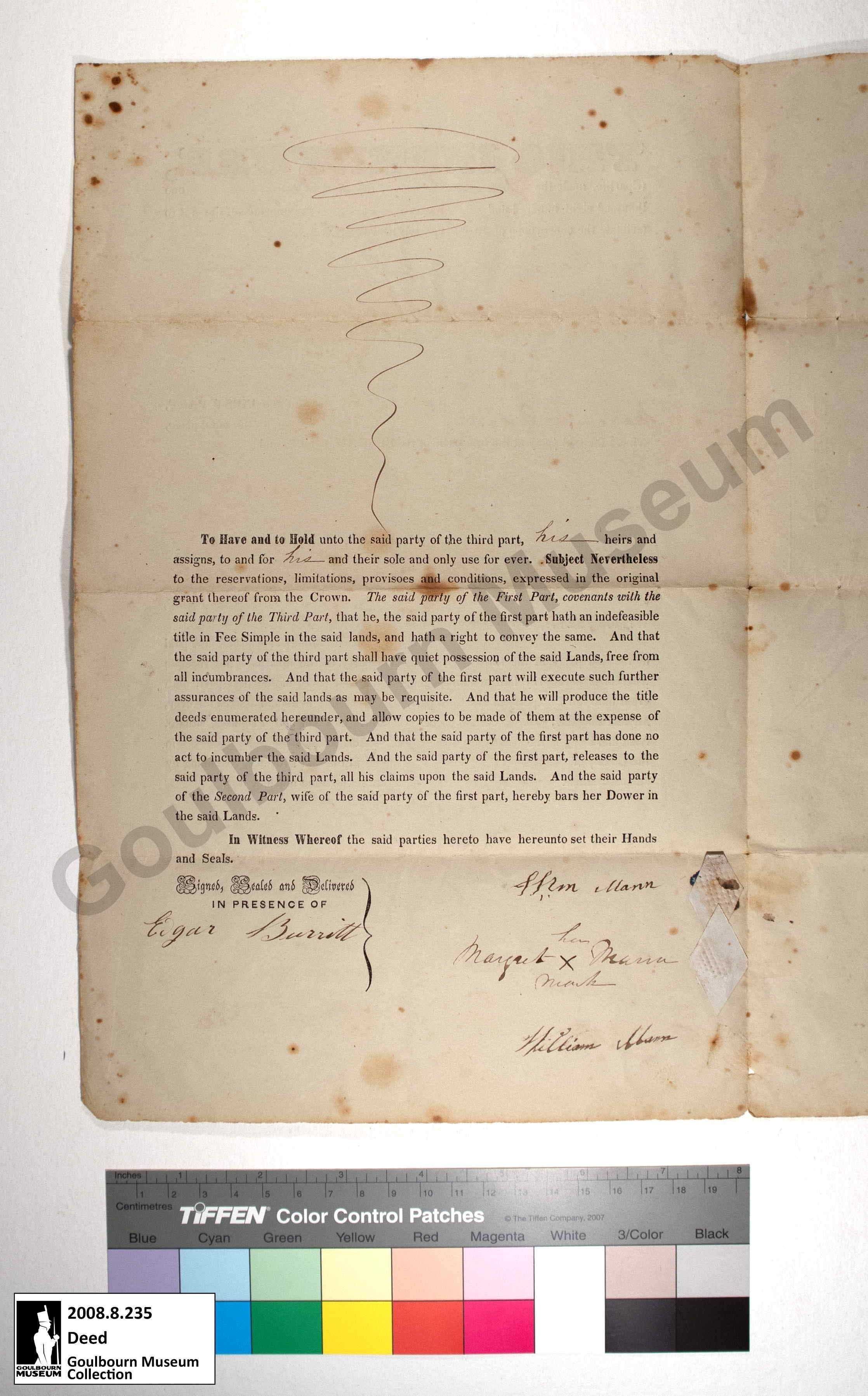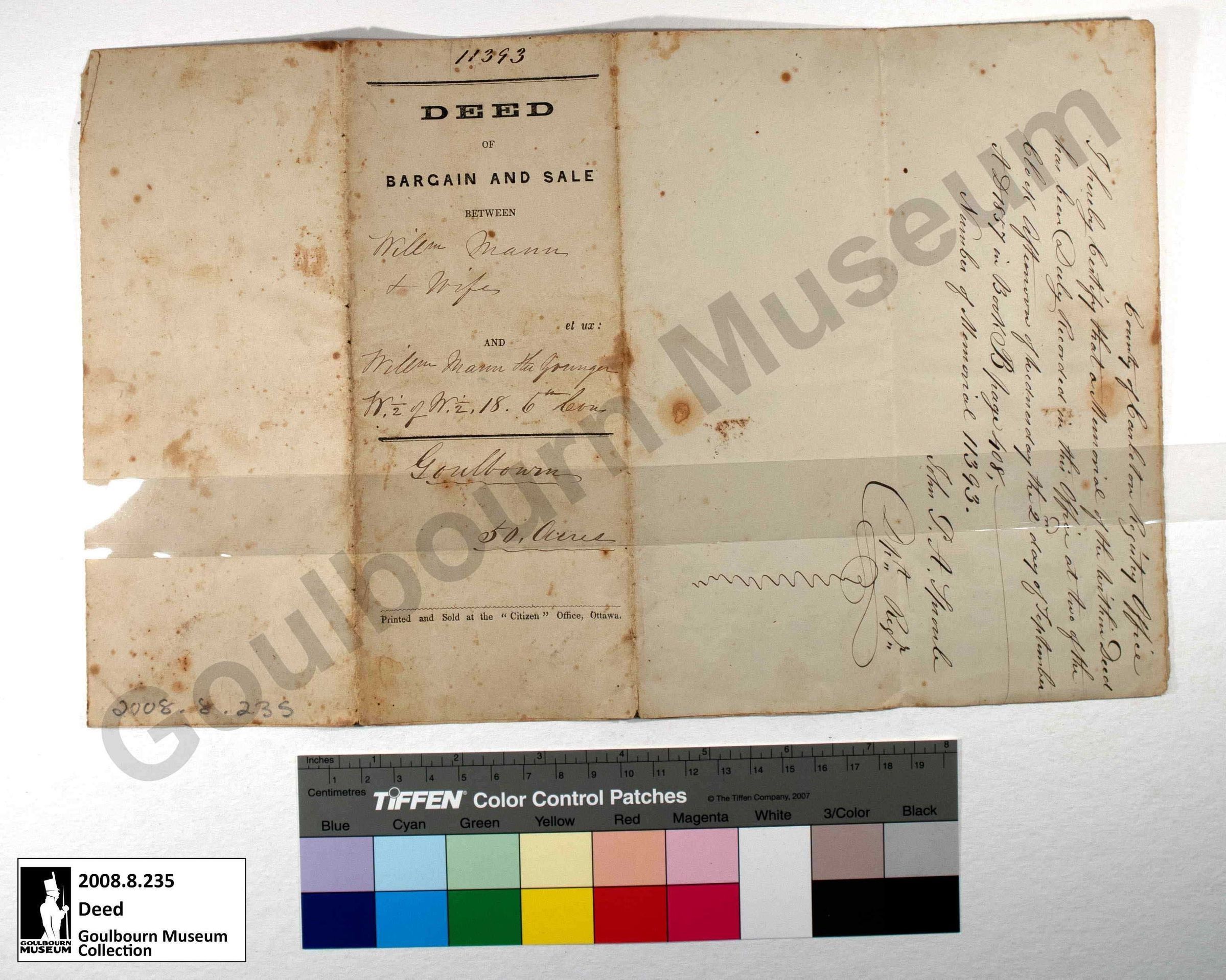 The artefact is a pamphlet copy of a Deed of Bargain and Sale between William Mann, his wife, and William Mann the Younger. The transfer was conducted on July 7th, 1857. It dictated the transfer of a portion of Lot 18 Concession 6 for a sum of fifty pounds.Collection