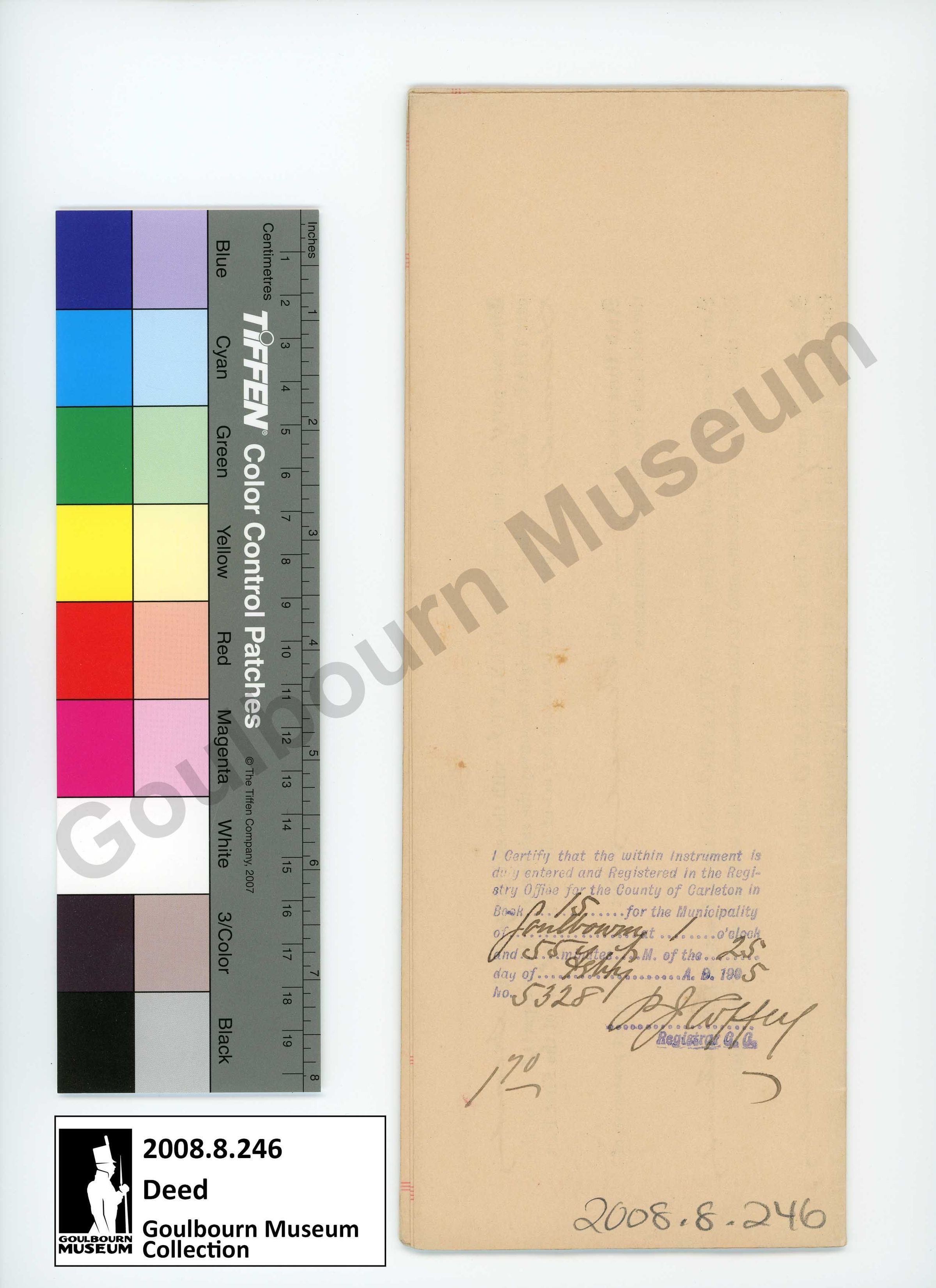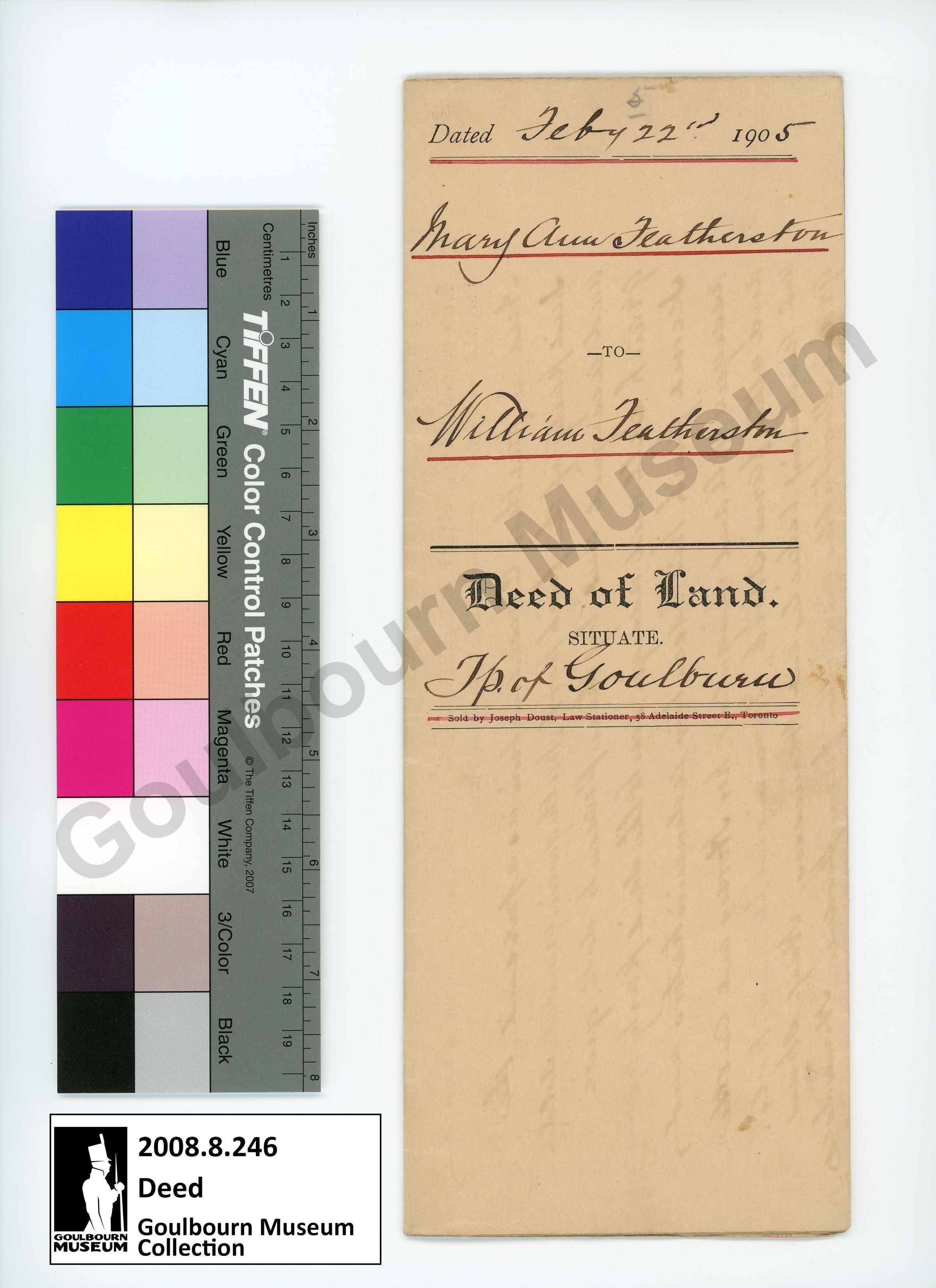 Land deed between Mary Ann Featherston and William Featherston. The front cover reads, "Dated Feb 22nd 1905 Mary Ann Featherston to William Featherston Deed of Land situate TP [abbreviated Township] of Goulbourn Sold by Joseph Doust, Law Stationer, 58 Adelaide Street E., Toronto". The reverse reads, "I certify that the within instrument is duly entered and registered in the registry office for the county of Carleton in Book 15 for the Municipality of Goulbourn at 1 o'clock and 55 minutes P.M. of the 25 day of February A.D. 1905 No 5328 P.J. Coffey, Registrar C.C."Collection