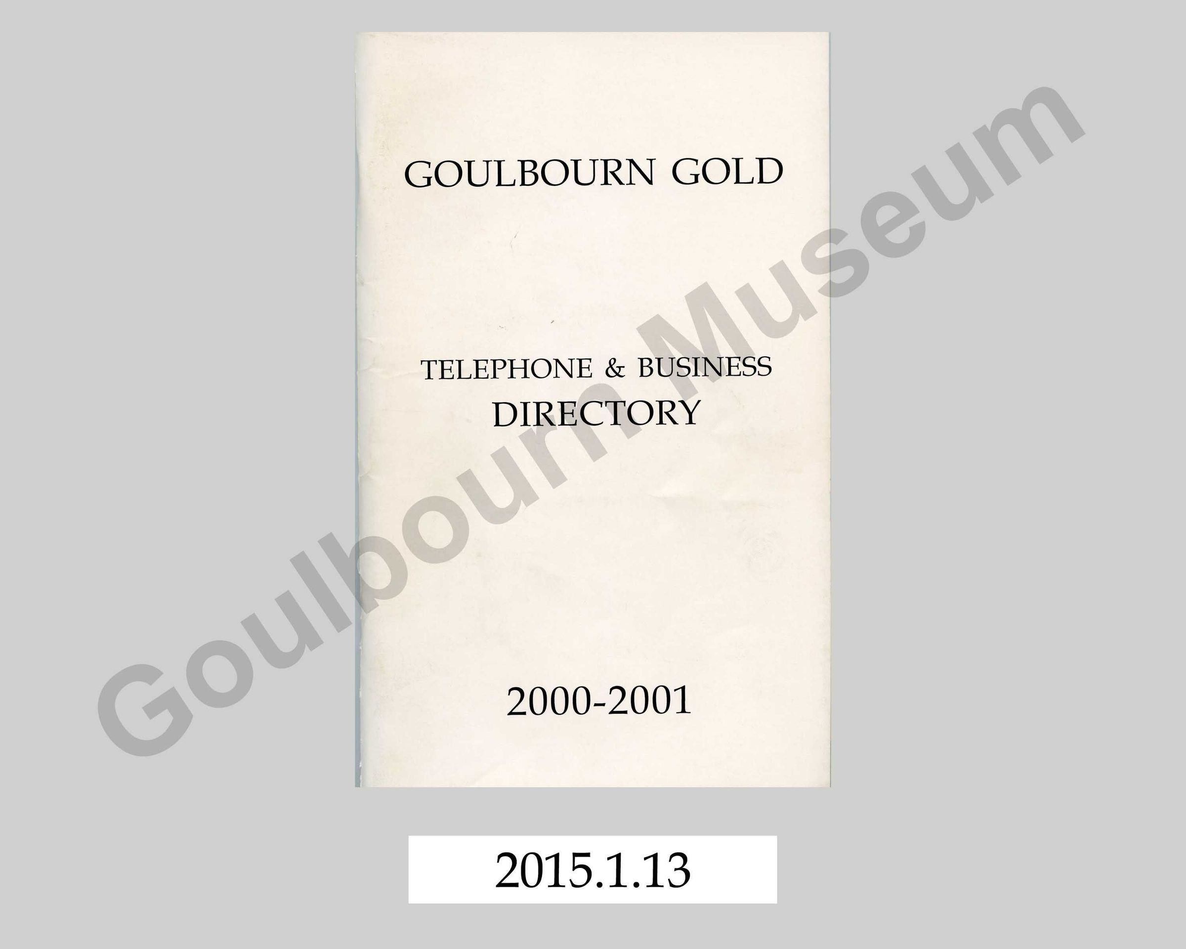One soft cover telephone directory entitled, "Goulbourn Gold Telephone & Business Directory 2000-2001." The book is bound in a soft cardstock cover, which is white in colour on the front and back. The book is composed of 176 numbered pages that are composed of a grey coloured newsprint paper. Inside the book are the following features: business directory, lined notes page, municipal directory, Stittsville residential directory, Richmond residential directory, Munster residential directory, Ashton residential directory, lined notes page, and advertisements from local businesses are incorporated with residential listings.Context