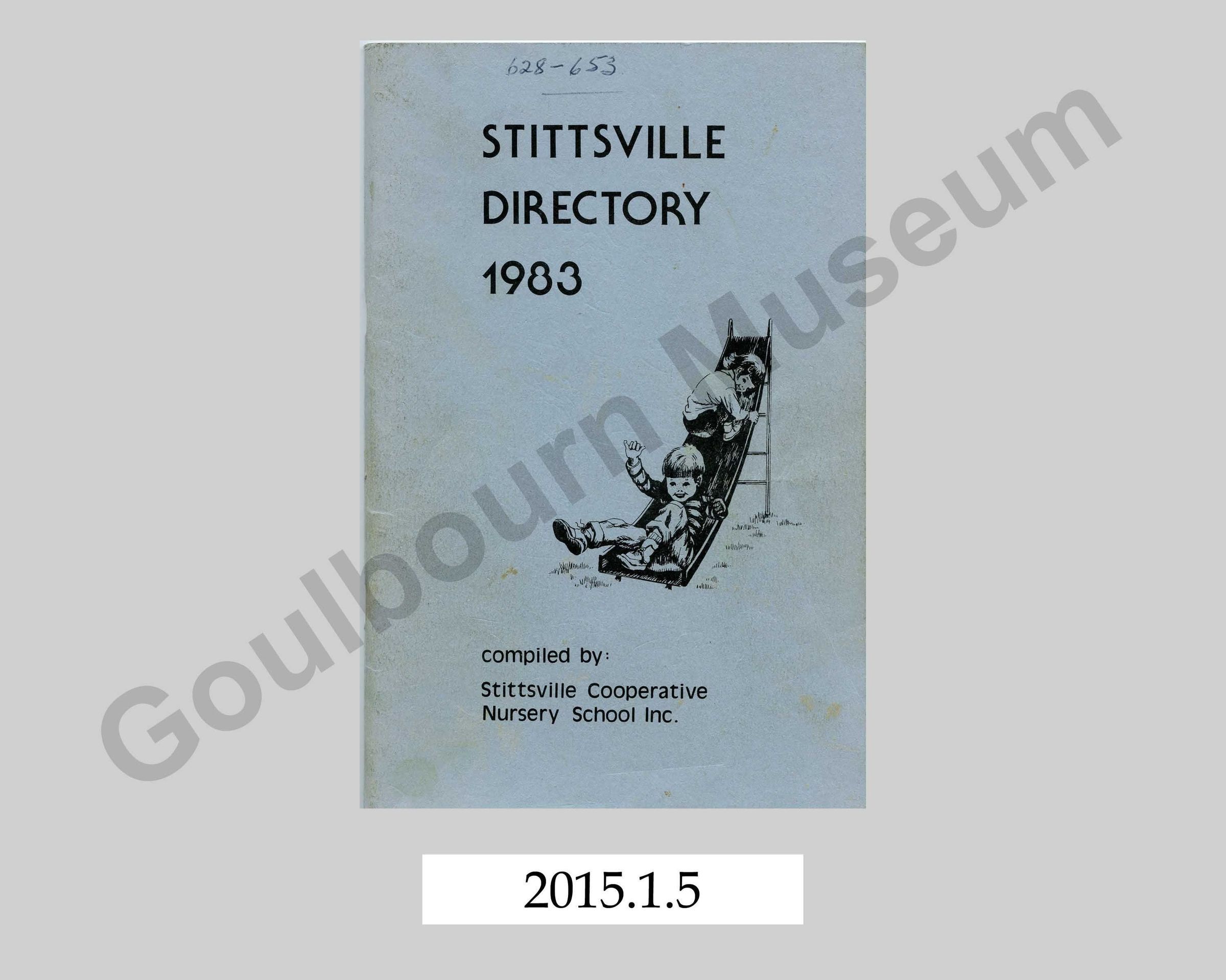 One soft cover telephone directory entitled, "Stittsville Directory 1983." The book is bound in a soft cardstock cover, which is blue in colour on the front and back with decoration and printing in a black coloured ink. The book consists of 80 numbered pages that are composed of white paper. Inside the book are the following features: important telephone numbers, alphabetical residential directory of Stittsville with advertisements for local businesses, the center of the book has a map of Stittsville, classified section with a directory of local businesses, a Stittsville street directory, a thank you from the Stittsville Nursery School , and advertisements from local businesses are incorporated throughout the publication.Context