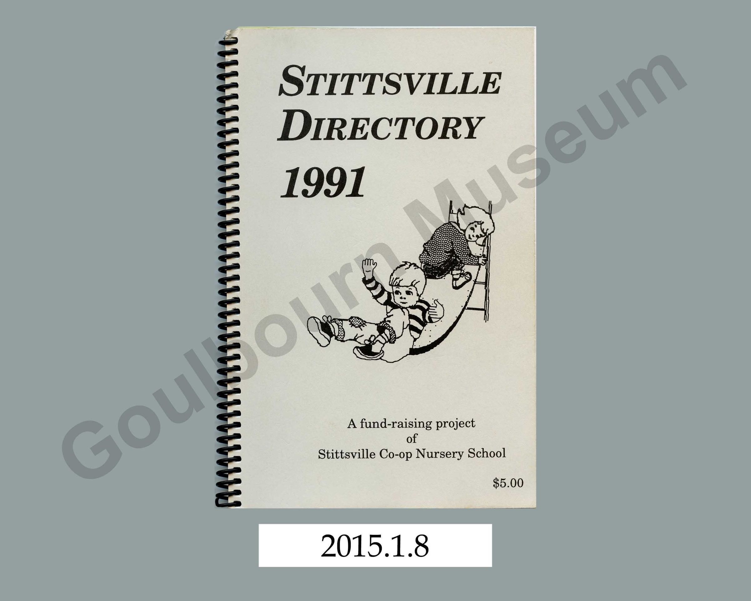 One soft cover telephone directory entitled, "Stittsville Directory 1991." The book is spiral bound with a soft cardstock cover, which is grey in colour on the front and back with decoration and printing in a black coloured ink. The book consists of 107 numbered pages that are composed of white paper and yellow coloured paper. Inside the book are the following features: letter from the Stittsville Cooperative Nursery School, table of contents, emergency telephone numbers, general information numbers (Churches, Clubs & Organizations, Schools, Township Offices, Transportation), classified index with a directory of local businesses, alphabetical residential directory of Stittsville, Stittsville street map, and advertisements from local businesses printed on yellow paper.Context