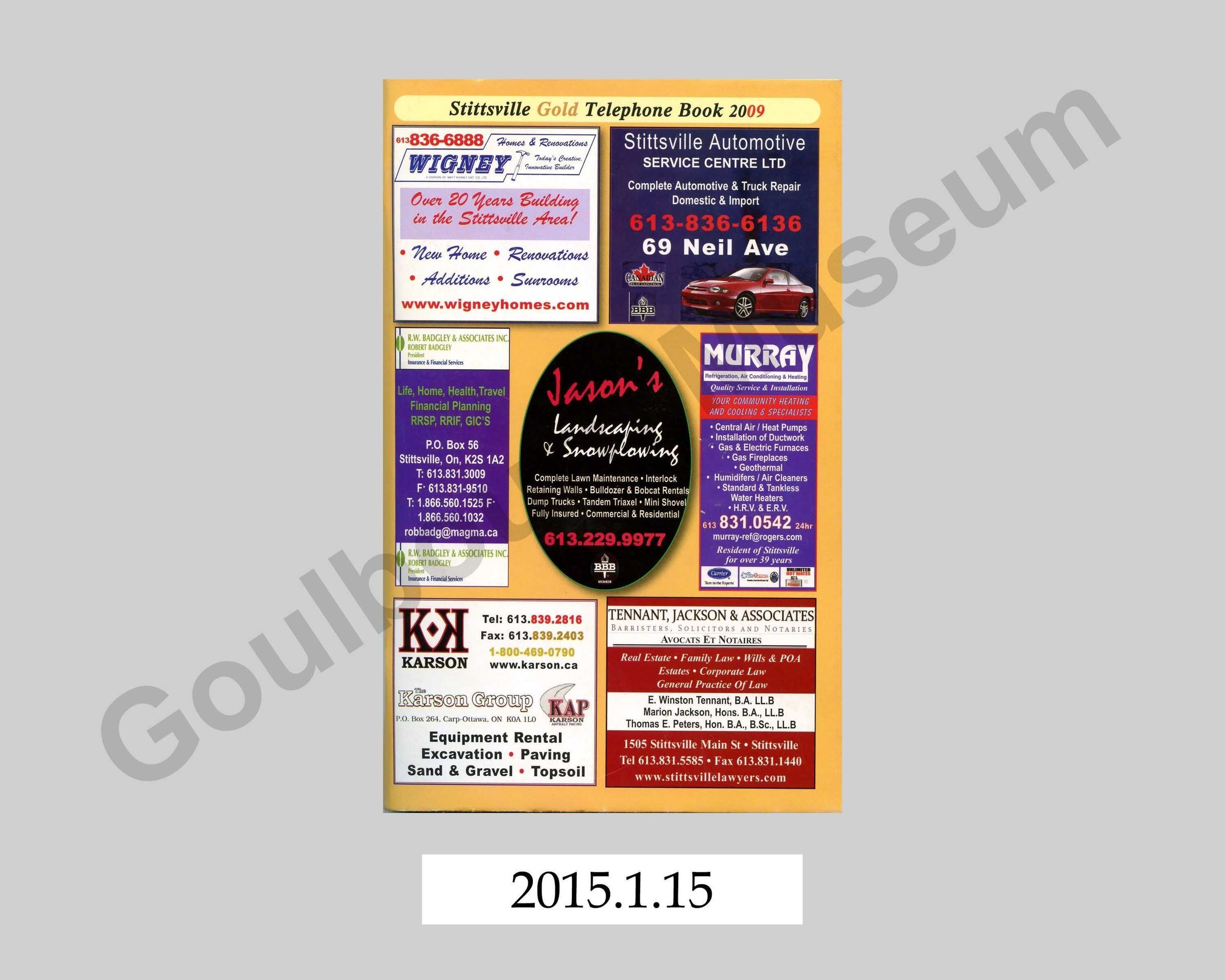 One soft cover telephone directory entitled, "Stittsville Gold Telephone Book 2009." The book is bound in a yellow coloured soft cardstock cover, which has been covered inside and outside with corporate advertisements. The book is bound along the spine with two metal staples. The book is composed of 160 numbered pages made of off-white newsprint style paper. Along the right side of each page is a coloured bar (blue, yellow, green and red), which indicates the purpose and content of the pages in the book. Page one includes a brief history of Stittsville; subsequent blue pages include information about churches, schools, postal codes, government numbers, and government services. Yellow pages include information about local businesses. Green pages include a directory of private individual's telephone numbers. Red pages include advertisements and space for the owner of the book to write their own frequently used telephone numbers.Context