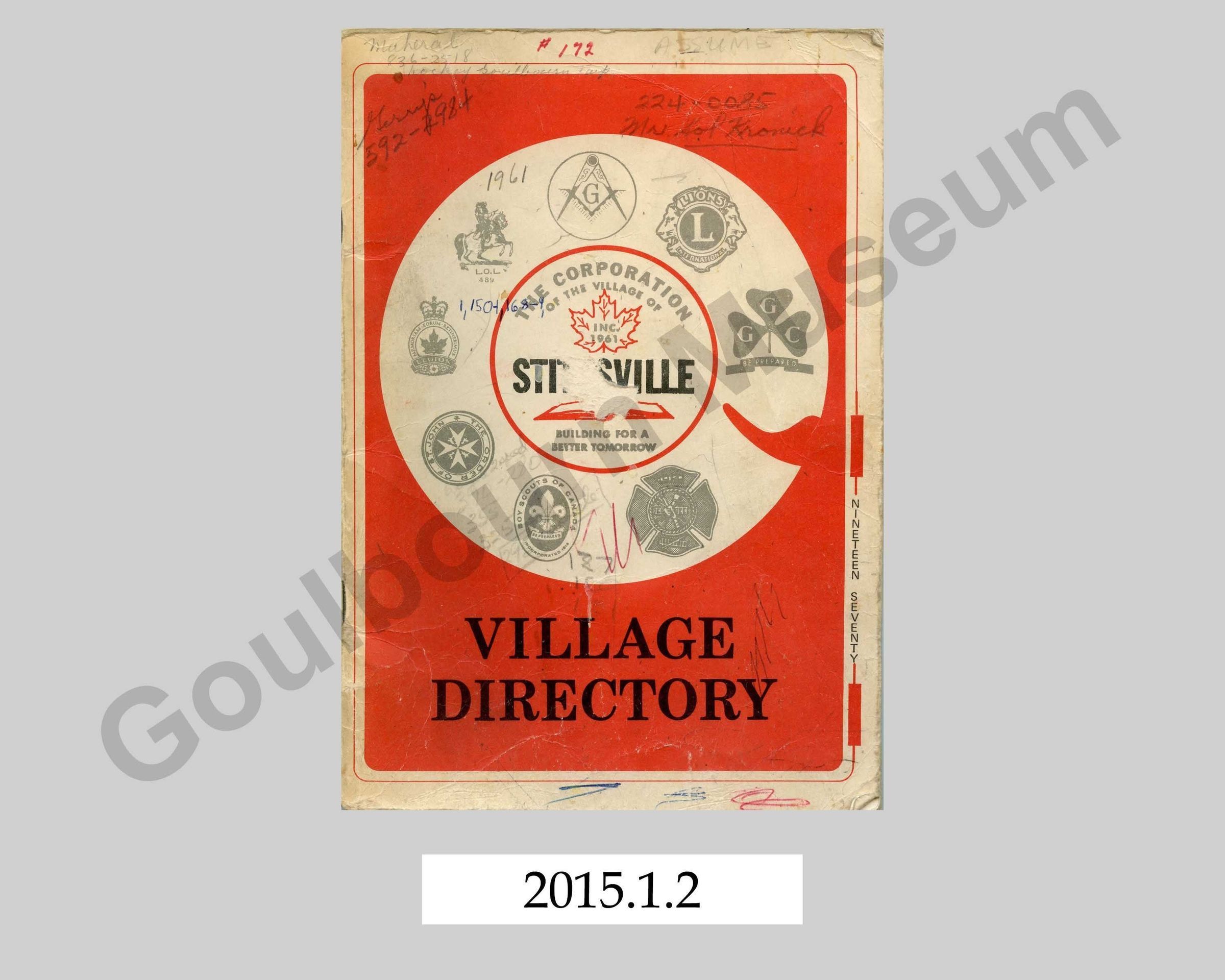 One soft cover telephone directory from 1970 entitled, "Village Directory." The book is bound in a white and orange coloured soft cardstock cover. On the front is a large circle containing local organization's logos arranged like a rotary phone dial. In the center of the circle is "The Corporation of the Village of Stittsville Building for a Better Tomorrow." Inside the book there is a foreword from the Village Council followed by a directory of Stittsville residents and local businesses.Context