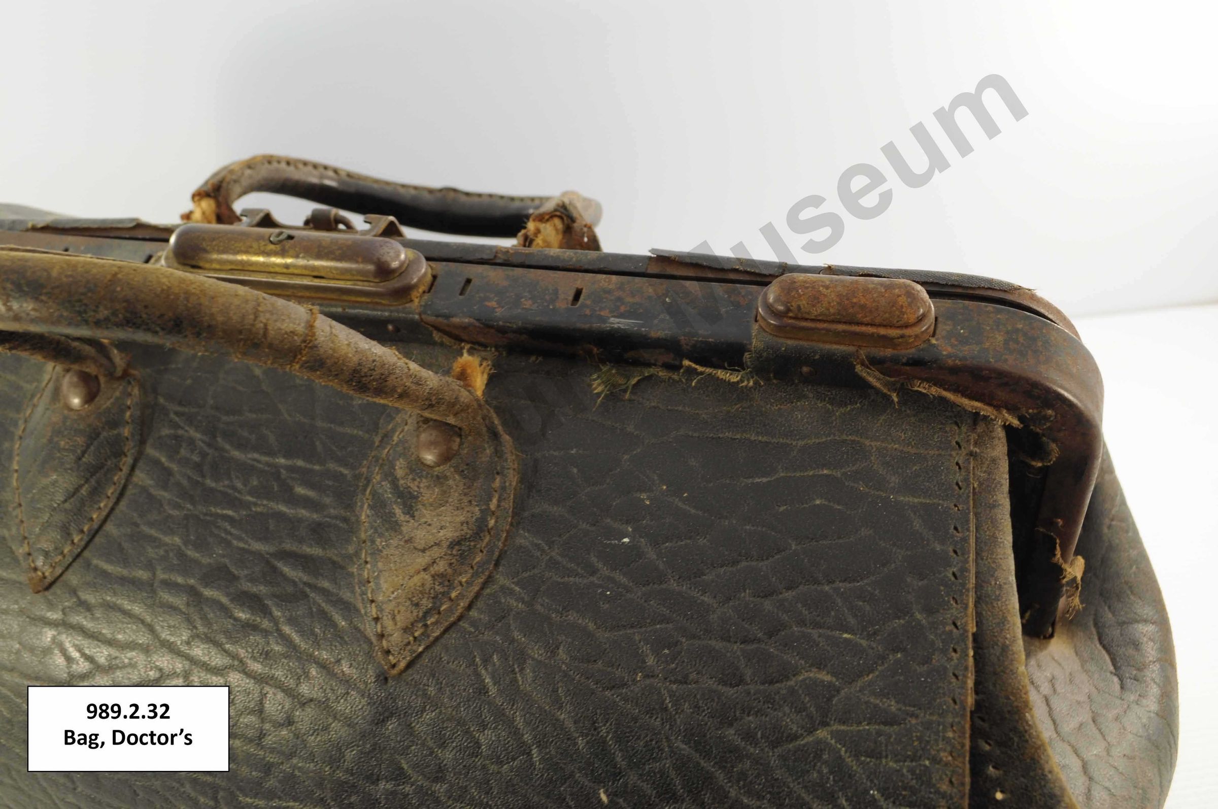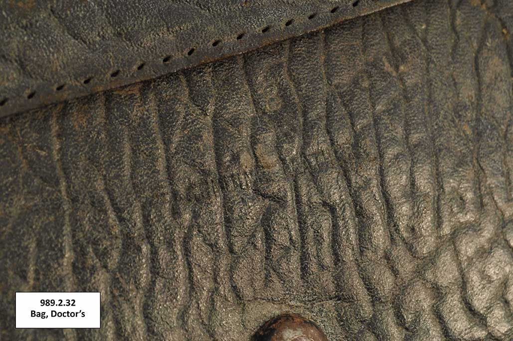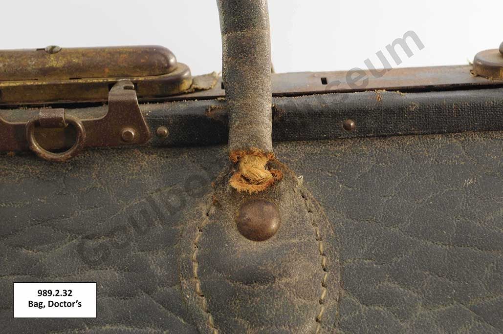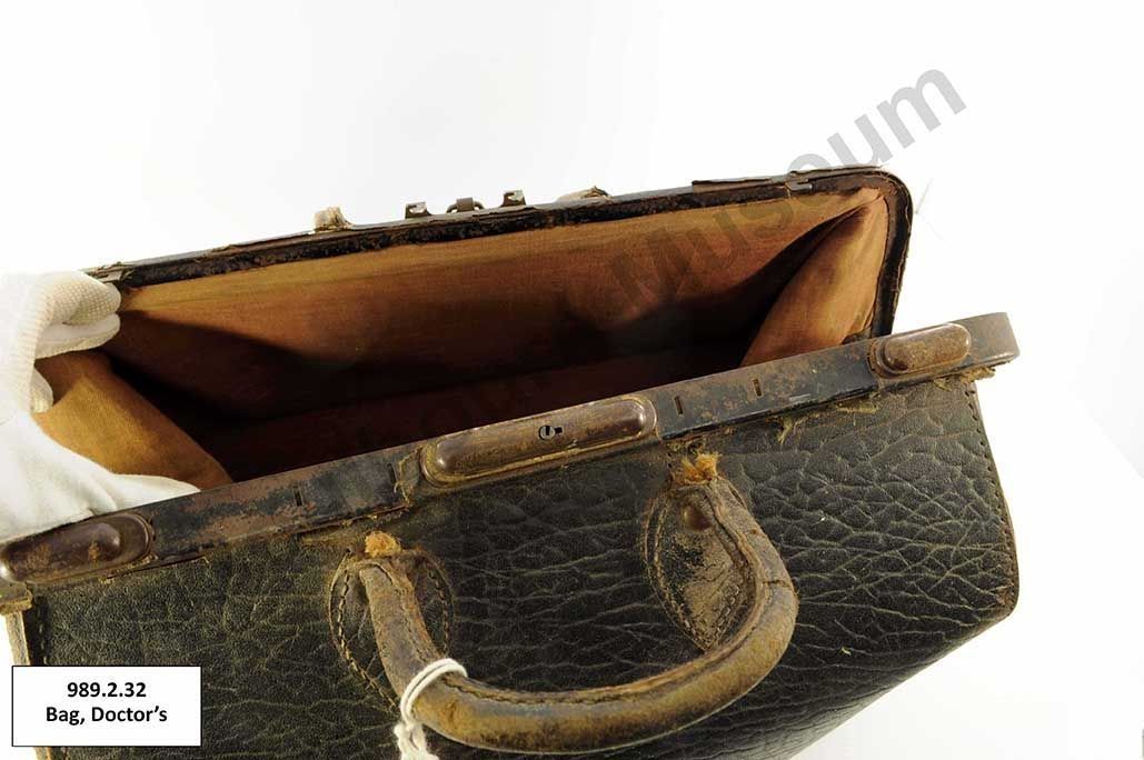 One black coloured leather doctor's bag lined with brown coloured fabric. The bag has two leather handles attached at the top of the bag. The opening of the bad is reinforced with metal components and closes with a metal clasp and lock. On the bottom of the bag are a series of five metal feet and embossed text that reads, "8" and "Genuine Leather."