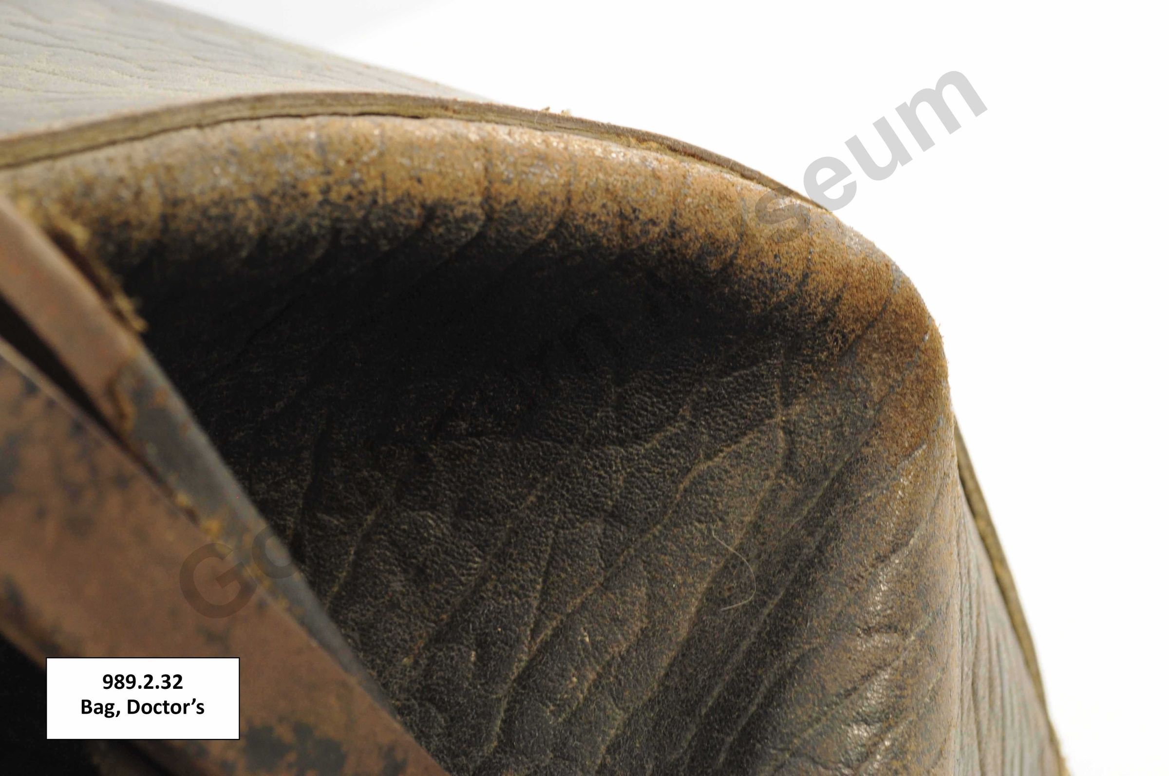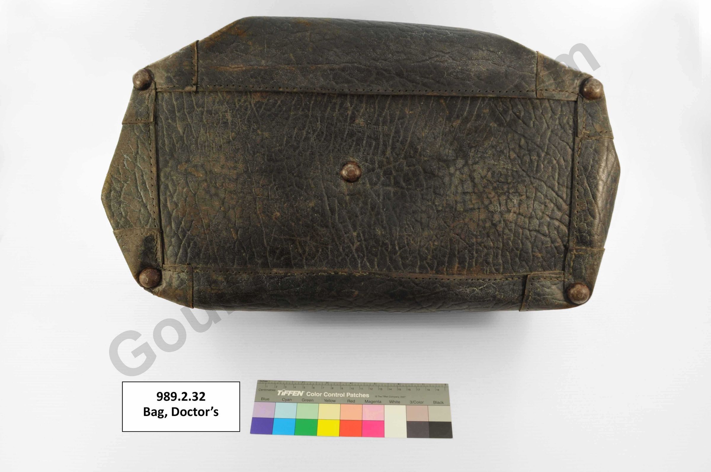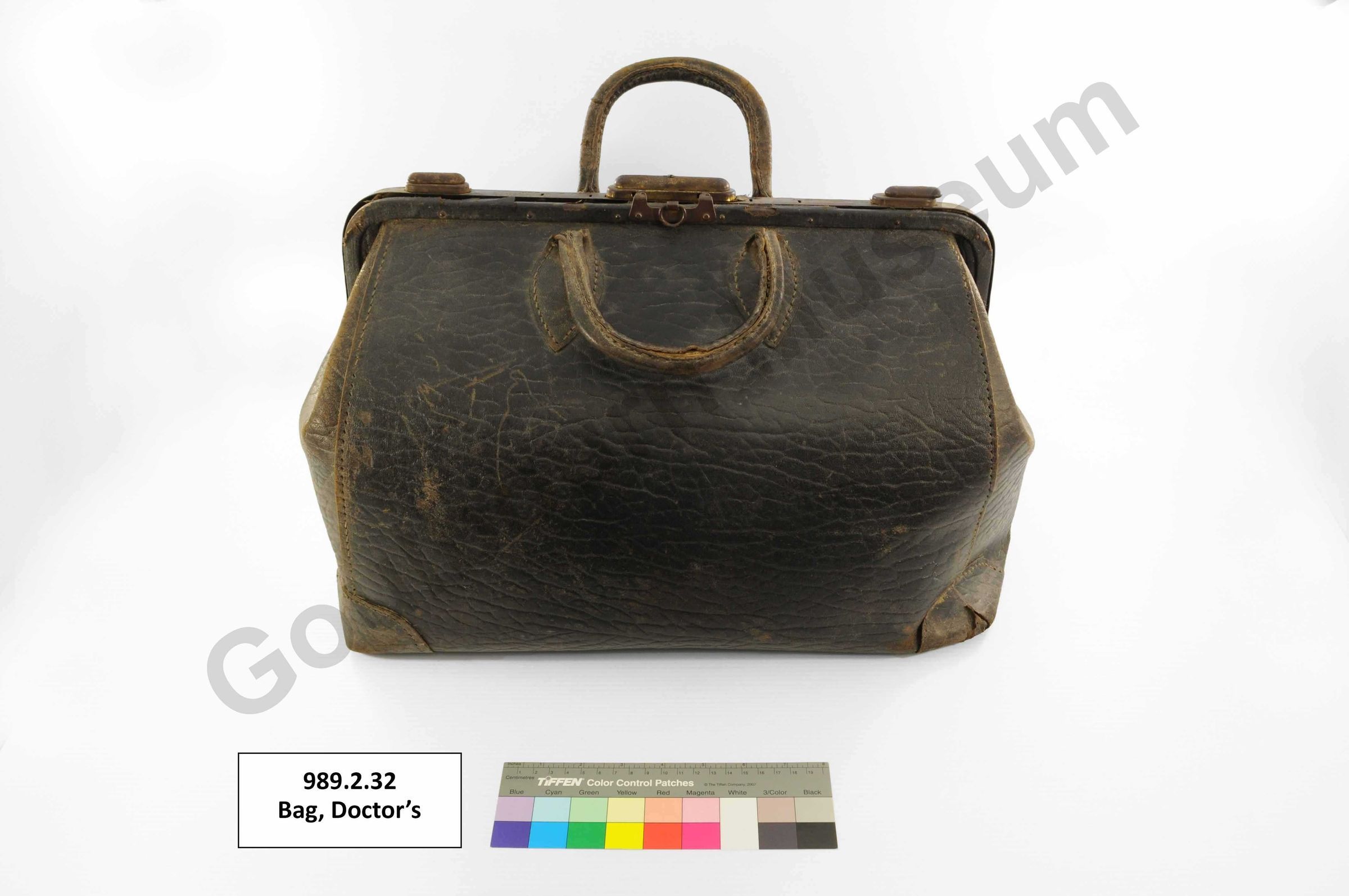One black coloured leather doctor's bag lined with brown coloured fabric. The bag has two leather handles attached at the top of the bag. The opening of the bad is reinforced with metal components and closes with a metal clasp and lock. On the bottom of the bag are a series of five metal feet and embossed text that reads, "8" and "Genuine Leather."