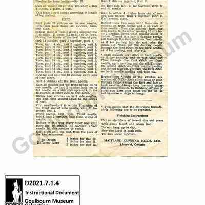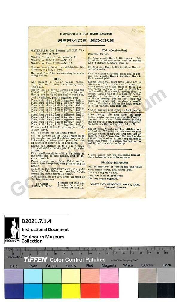 Digital Artifact: "Instructions for Hand Knitted Service Socks" owned by Sefton's mother and used for socks to send in care packages during his 1916-1918 service with the CEFContext