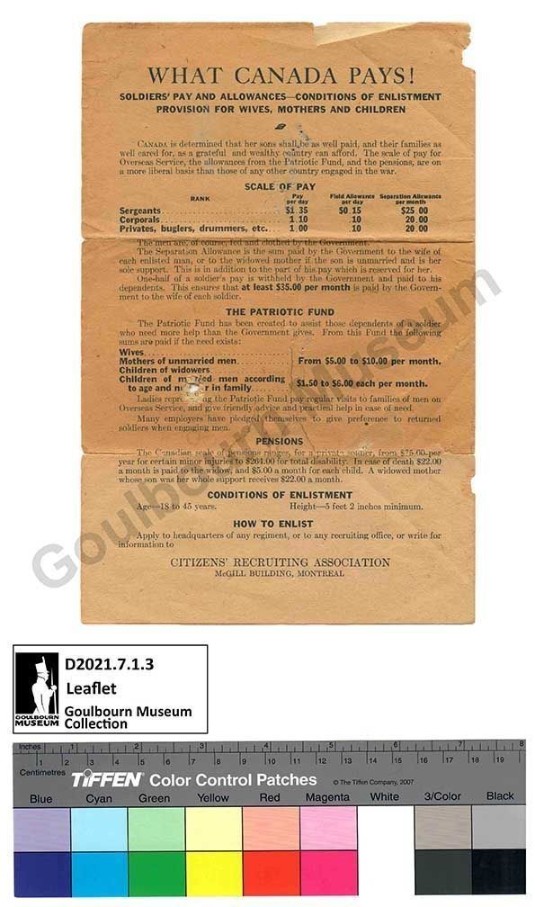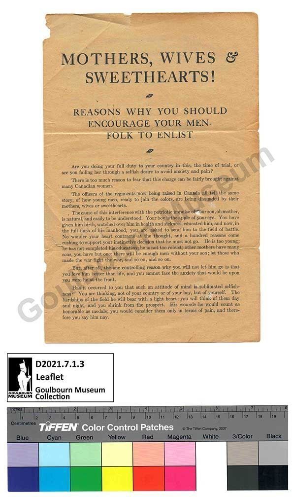 Digital Artifact: Recruitment propaganda "Mothers, Wives & Sweethearts! Reasons why you should encourage your men-folk to enlist". One page double sided leaflet.Context