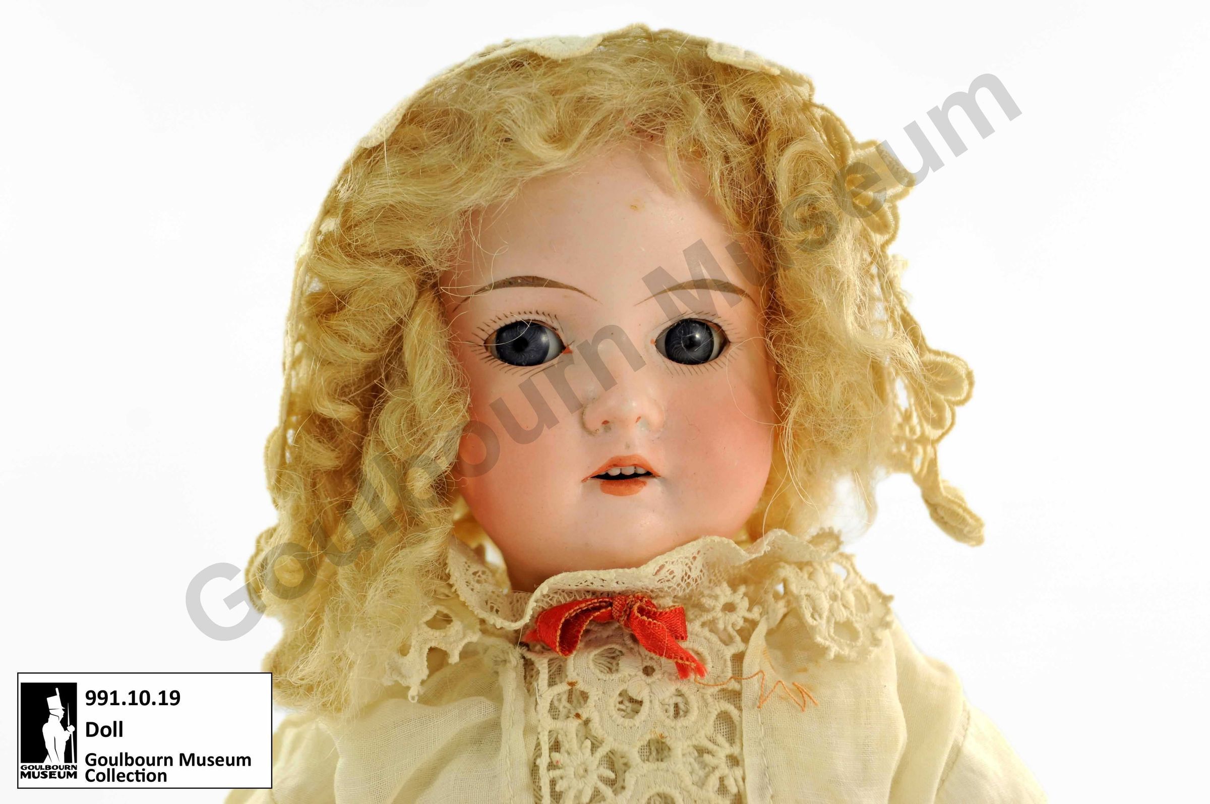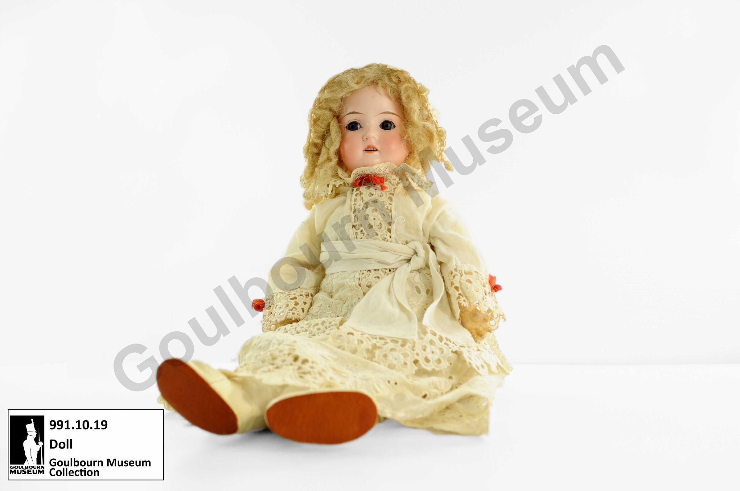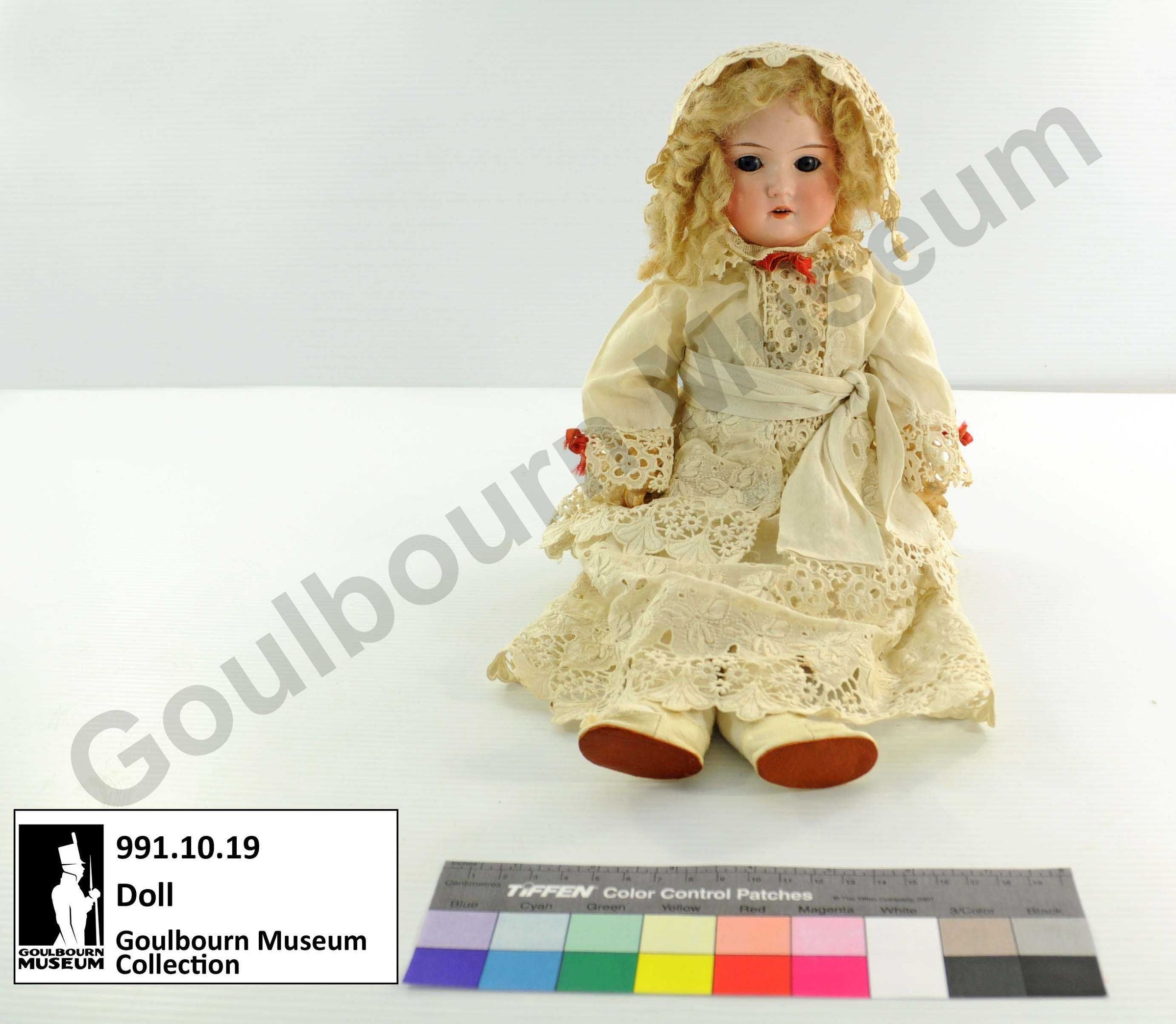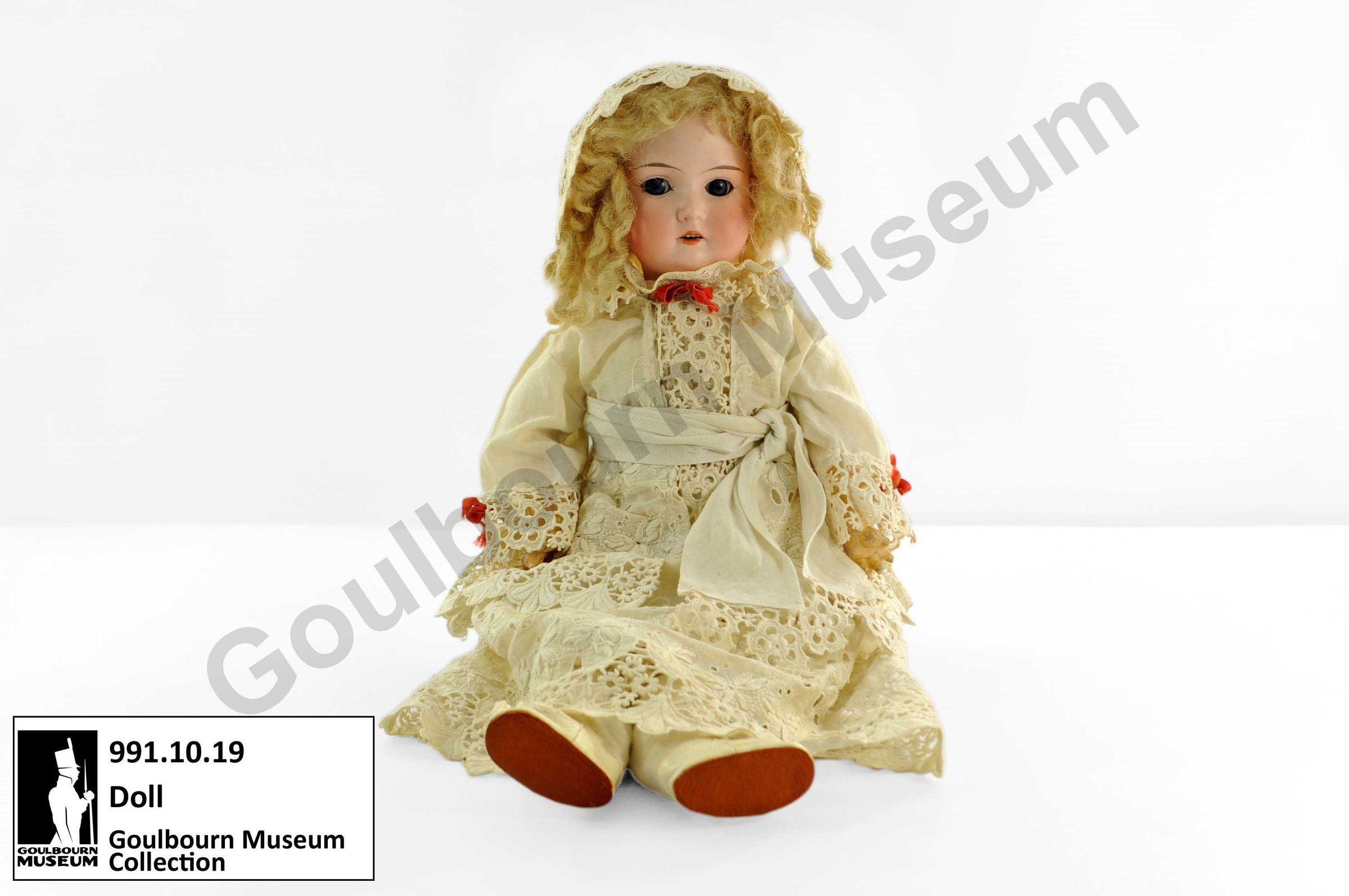 Doll composed of a bisque head and jointed composition body. The doll's head has blonde coloured hair attached to the crown styled in curls at shoulder length, a white eyelet lace bonnet rests on top of the hair, the two blue coloured eyes move to fully open when the doll is in upright position, and fully closed when the doll is laying flat. The doll is dressed in an off white coloured eyelet dress with full length sleeves and skirt, the dress has a tie around the bodice. The doll has several undergarments under the dress including white knitted stockings, white fabric petticoat, and white fabric bloomers. Two leather shoes are placed on the feet.Context
