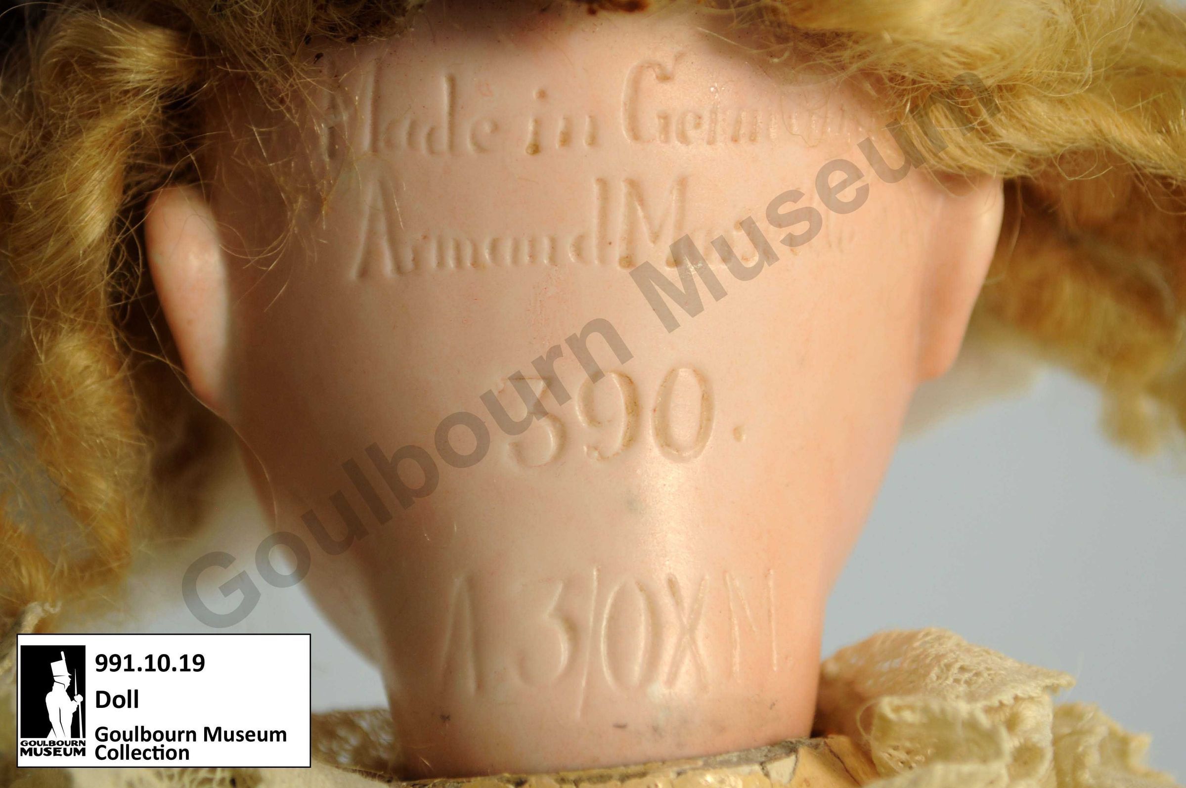 This story starts with the doll’s maker’s mark, “Made in Germany Armand Marseille 390.” Armand Marseille was one of the largest and best known bisque doll head manufacturers. From 1900 to 1930 it is estimated that Marseille produced 1,000 bisque doll heads a day. His company produced baby, child, women and character heads and purchased doll bodies from other manufacturers. This example from the Museum’s collection has a Marseille head that was paired with a jointed composition body. The doll was awarded in 1919 to it’s six year old owner, who was the winner of a race during a picnic event at Beech Bush .Lexicon