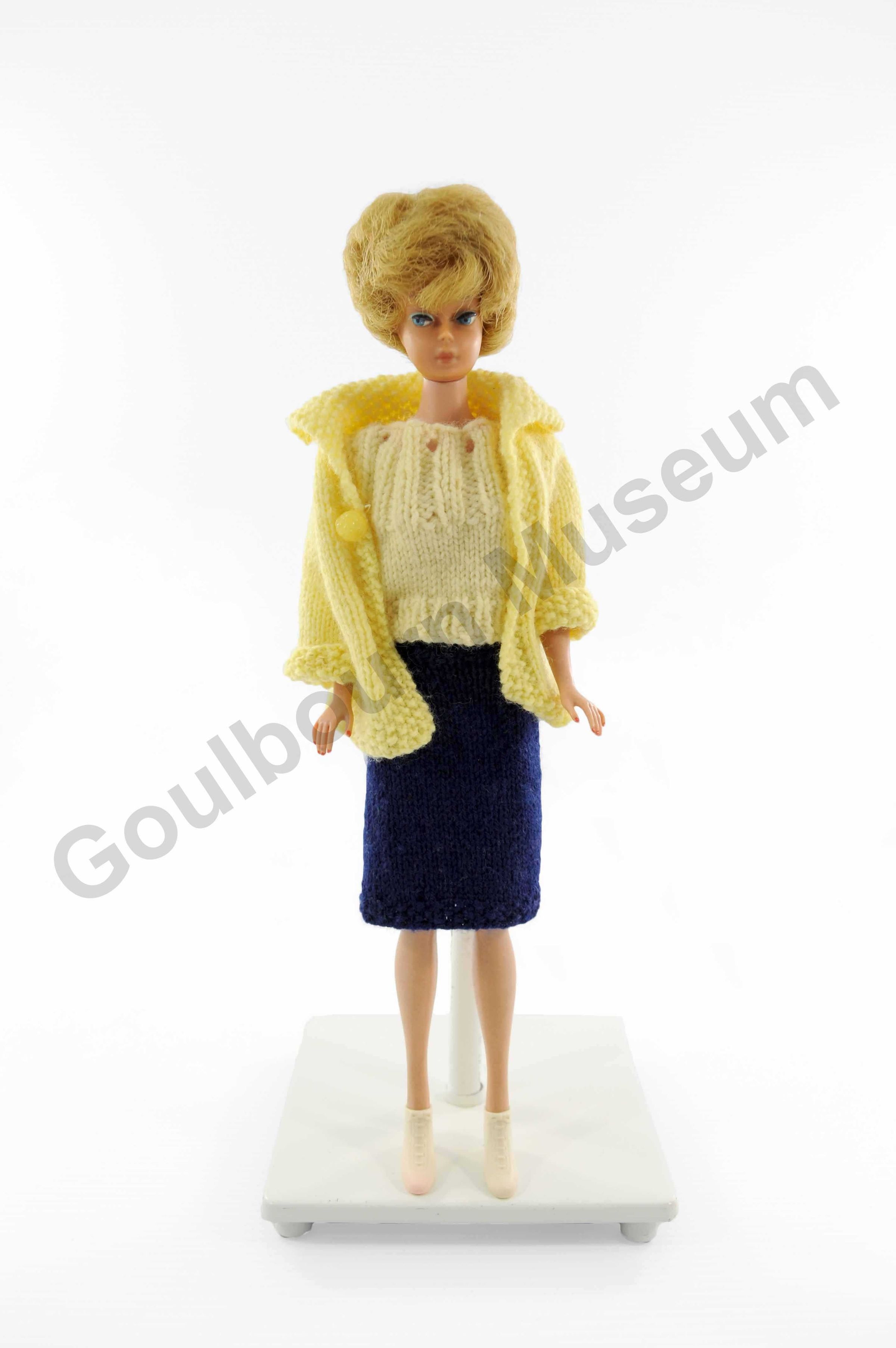 Barbie doll with short, blond hair. The doll is wearing a hand-knitted yellow sweater set & navy skirt with white plastic boots. No bendable limbs. Comes with a suitcase containing different clothing and accessories.