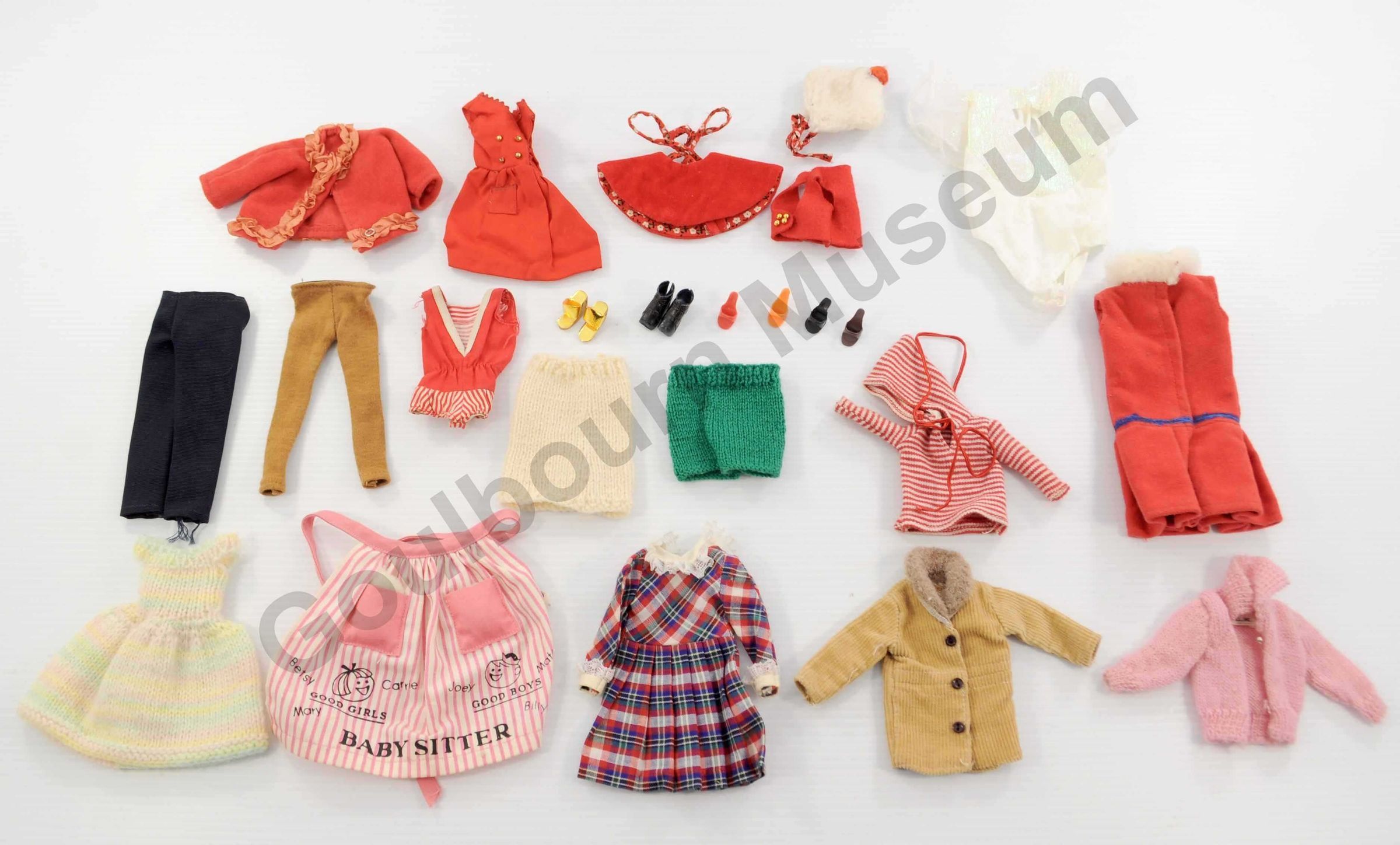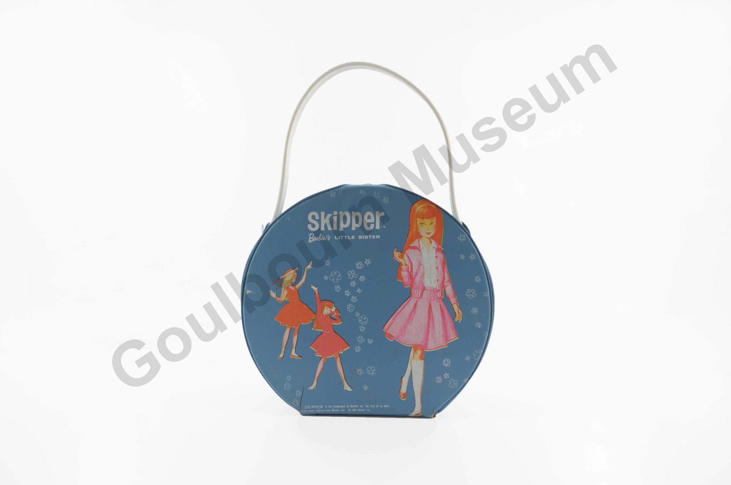 (b) with white handle. Front has "skipper, Barbies Little Sister" and depicts three versions of the doll in different outfits. Case contains; Pink stripped apron with pink pockets (says baby sitter, labelled for Barbie than Skipper), Plaid long sleeved dress (tagged for Skipper), the red 'sailor suit' bathing suit skipper was originally sold with, red felt dress with white 'fur' neck, red sundress, red vest, red velvet skirt with floral lining & straps & matching hat of white fur, red felt jacket (trimmed with ribbon), pink knit sweater, red striped hoody, blue pans, brown pants, brown corduroy coat with fur collar, pastel striped kitted dress, white knitted skirt, green knitted shorts, white nylon romper for a larger doll, footwear (a pair of black boots - Skipper's and pair of cork sandals - Barbie's, one black + brown + orange + red sandal - Barbie's).Lexicon