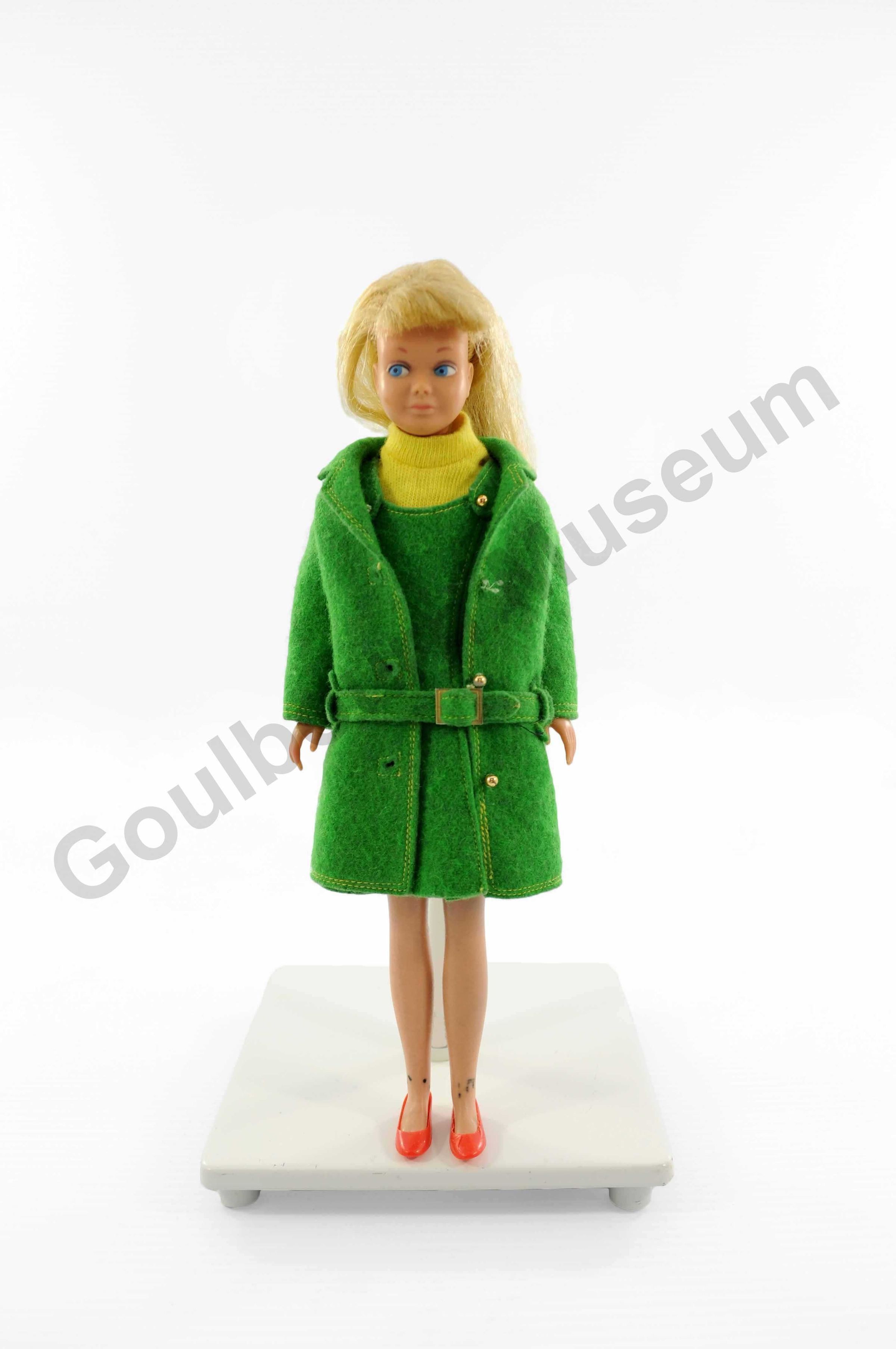 Vintage Skipper (a), Barbie's Little Sister doll (1964). Plastic doll with blue eyes, long blond hair, red plastic ballet flat shoes, green felt dress with metal buckle and bead buttons, green felt dress with beads at shoulder, yellow turtleneck shirt. Has round blue travelling case