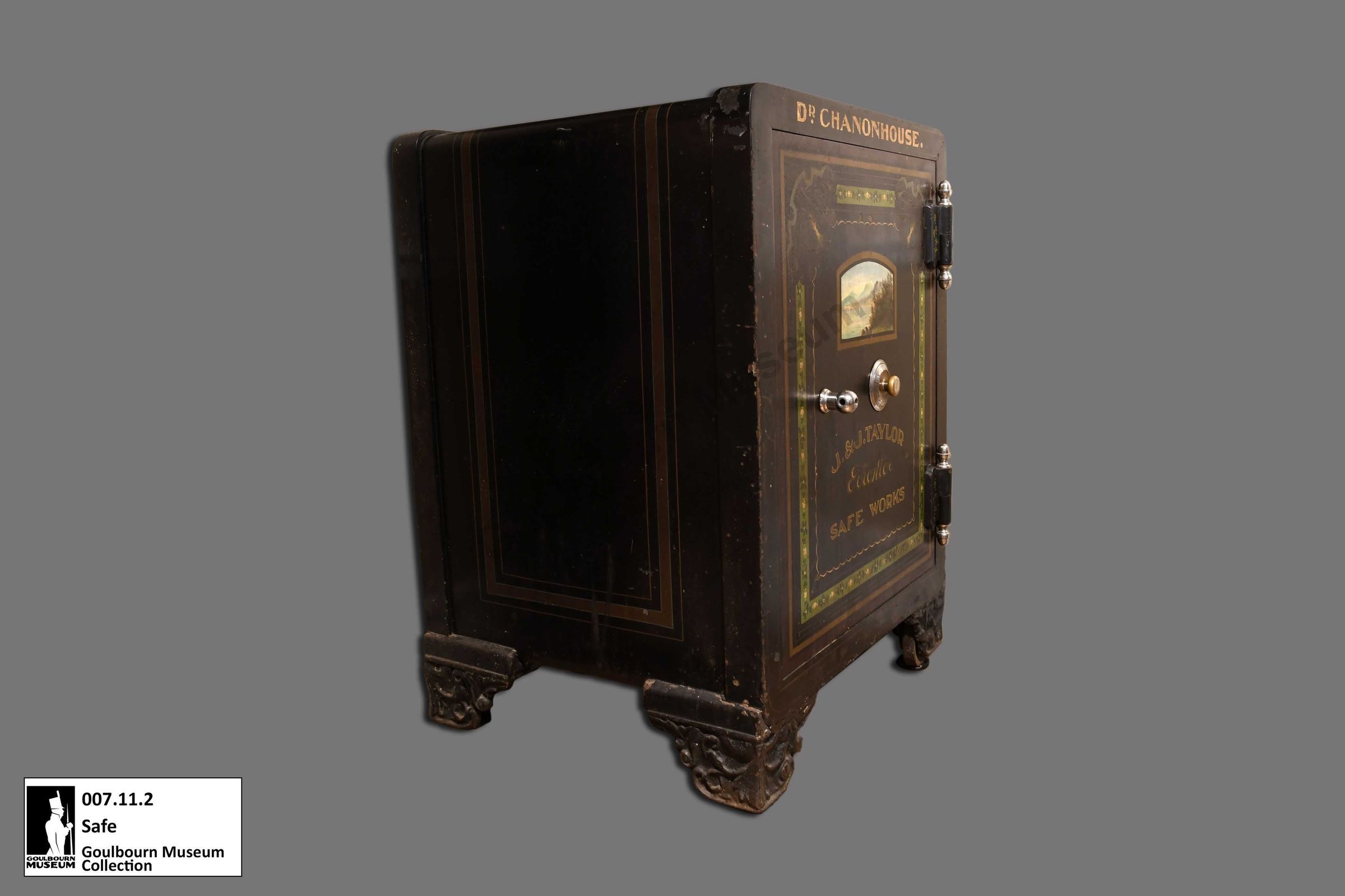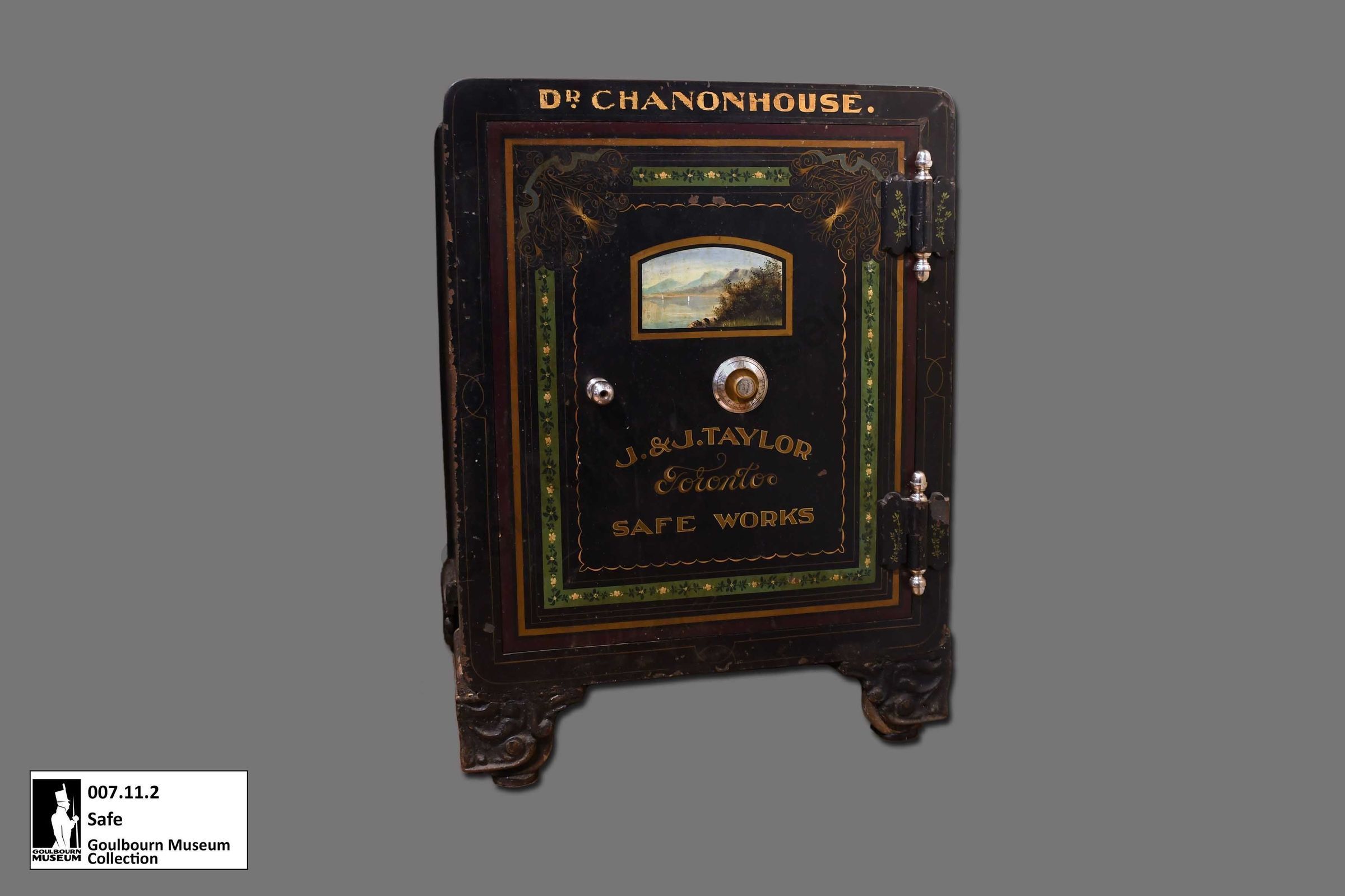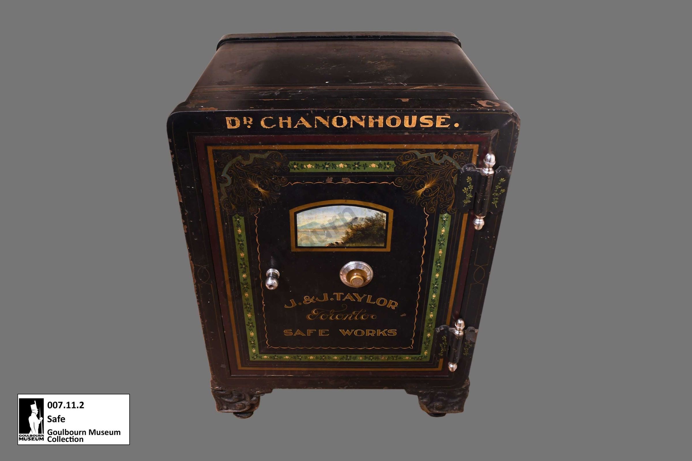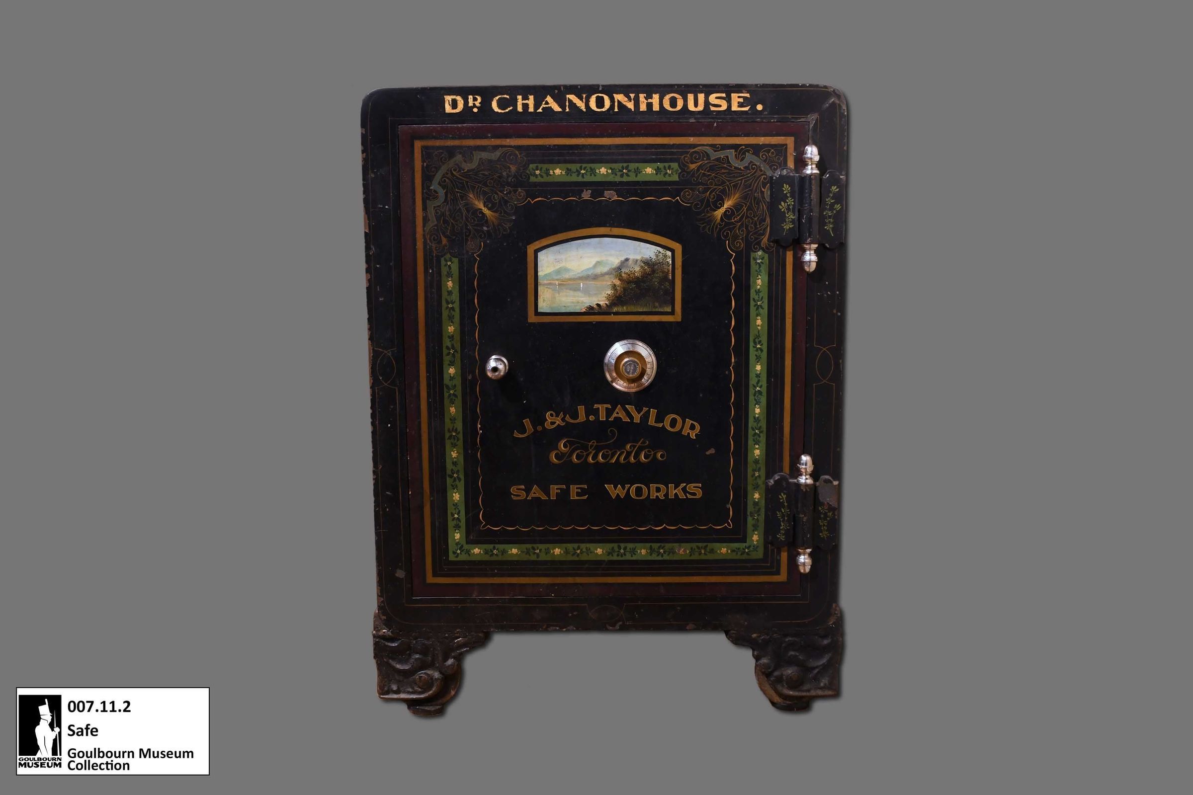 Black painted metal safe, "Dr. Chanonhouse" painted across the top front, pastoral scene and "J & J Taylor Safe Works" painted on front of door. Combination Lock on door. Inner wood door, concealing green felted wood partitions and two drawers. Four metal scroll work cast iron painted blacklegs.Collection