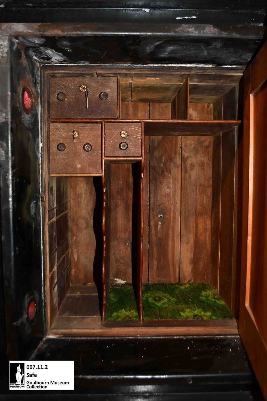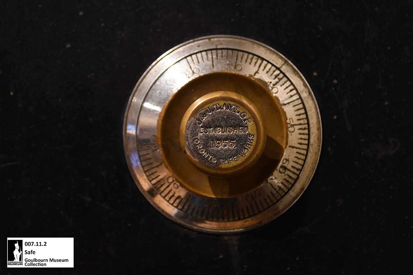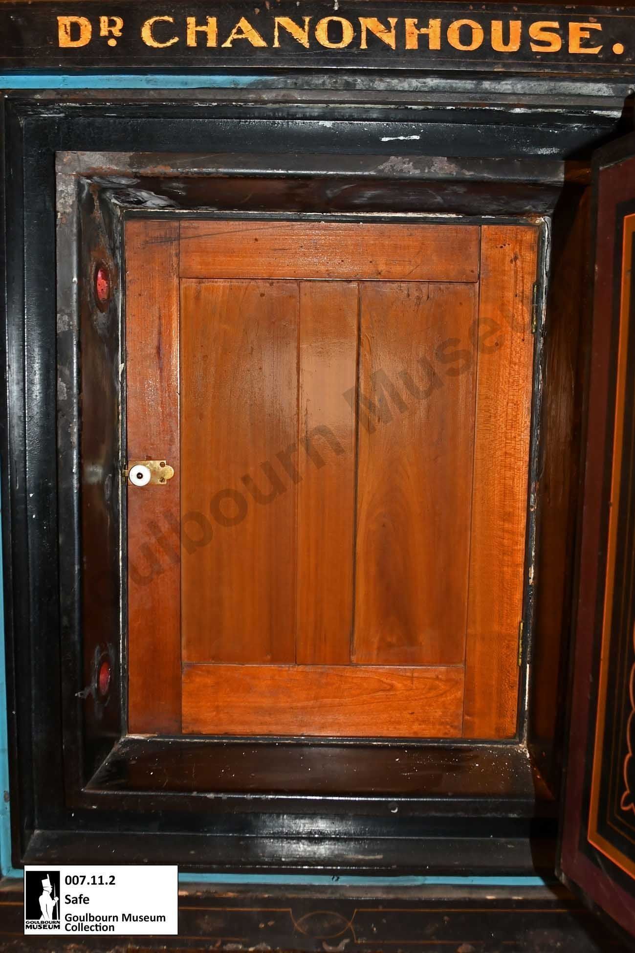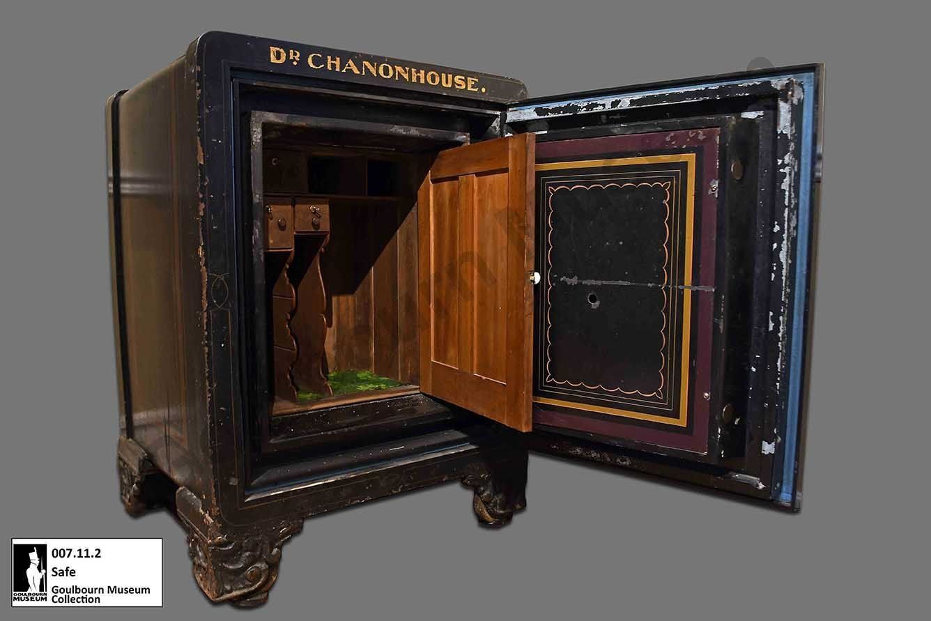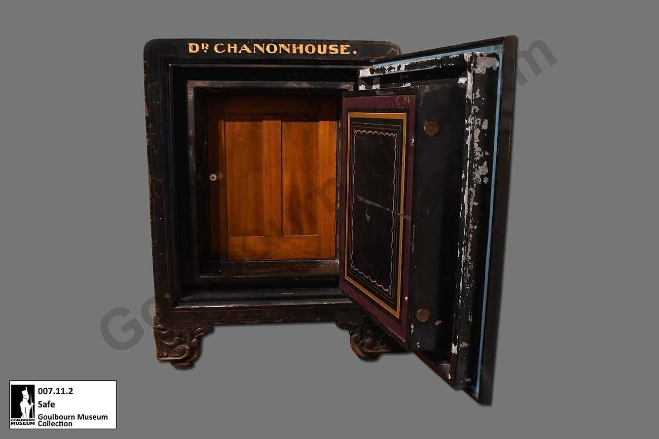 Black painted metal safe, "Dr. Chanonhouse" painted across the top front, pastoral scene and "J & J Taylor Safe Works" painted on front of door. Combination Lock on door. Inner wood door, concealing green felted wood partitions and two drawers. Four metal scroll work cast iron painted blacklegs.Collection