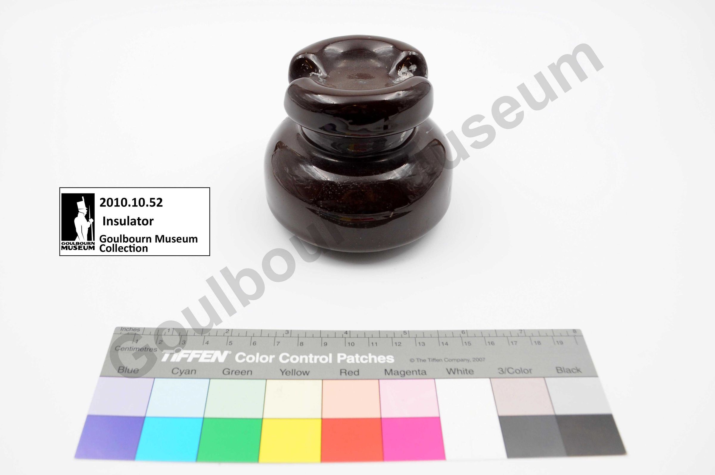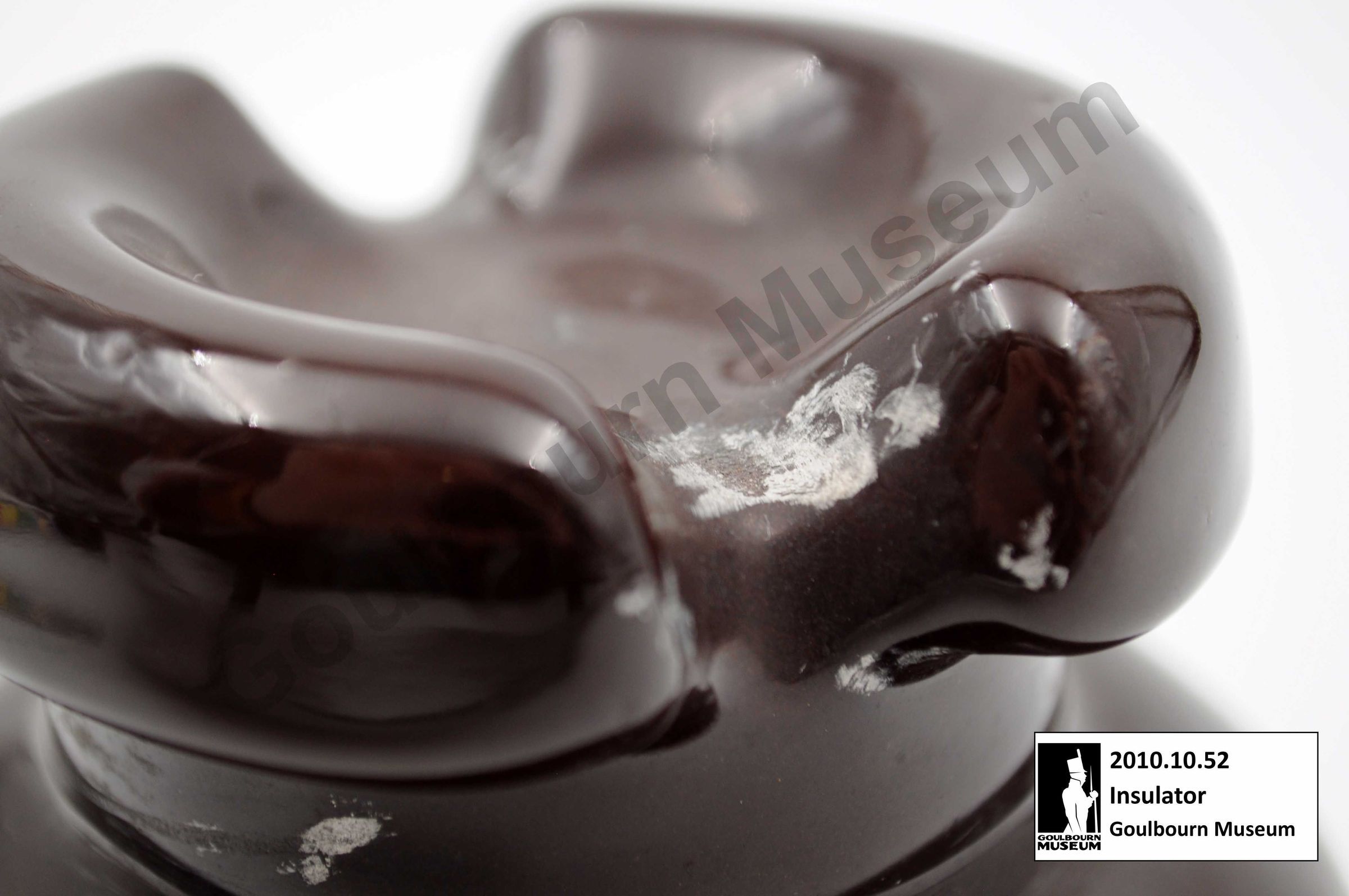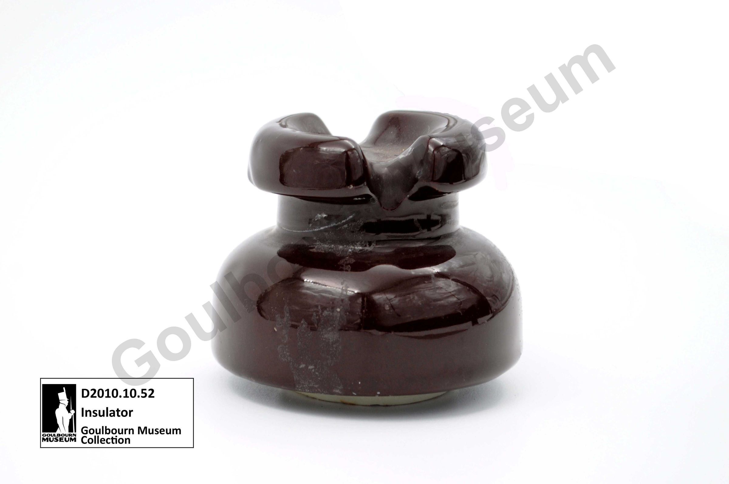 Dark brown screw top-shaped ceramic insulator with round sides.Context