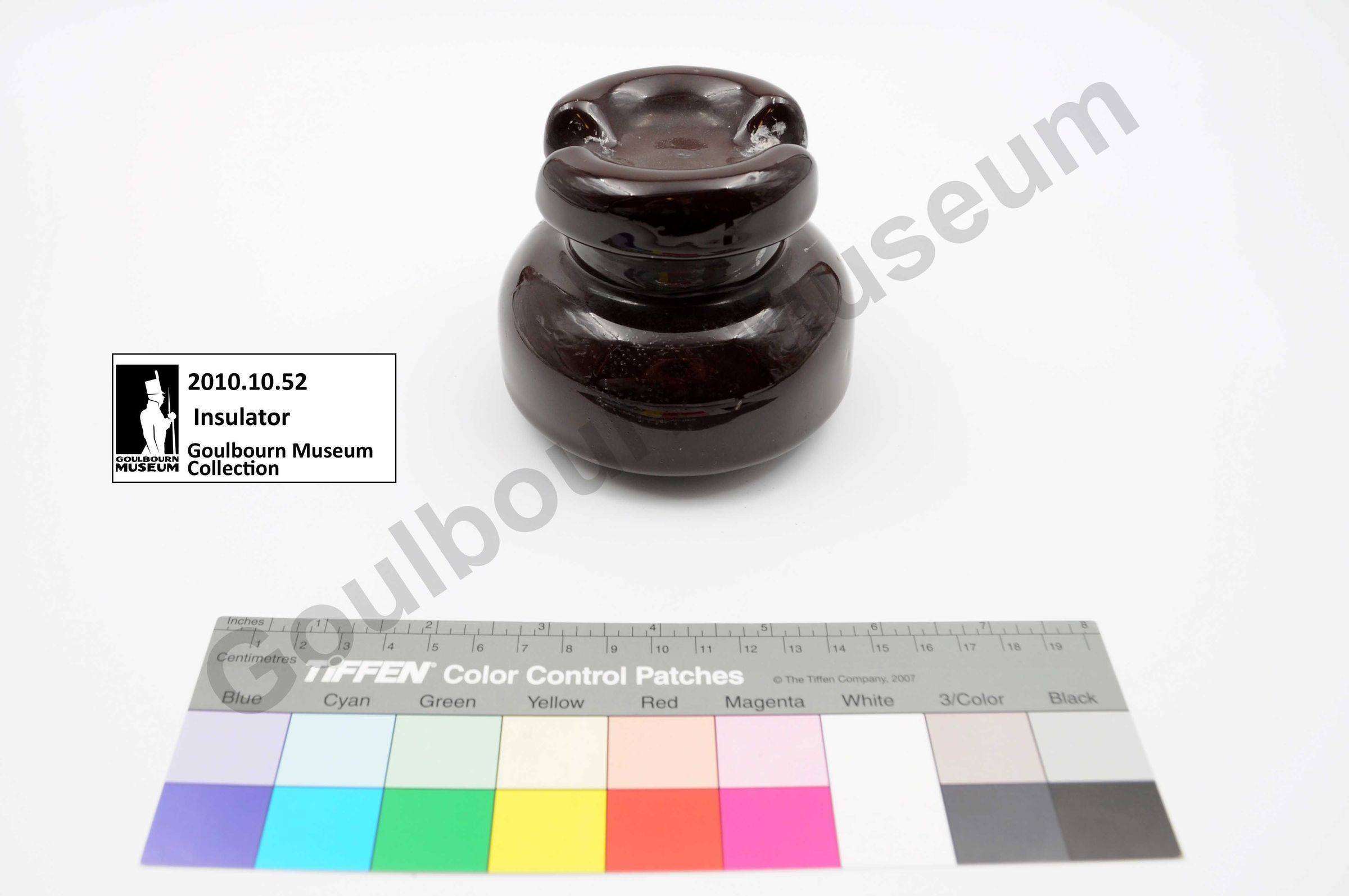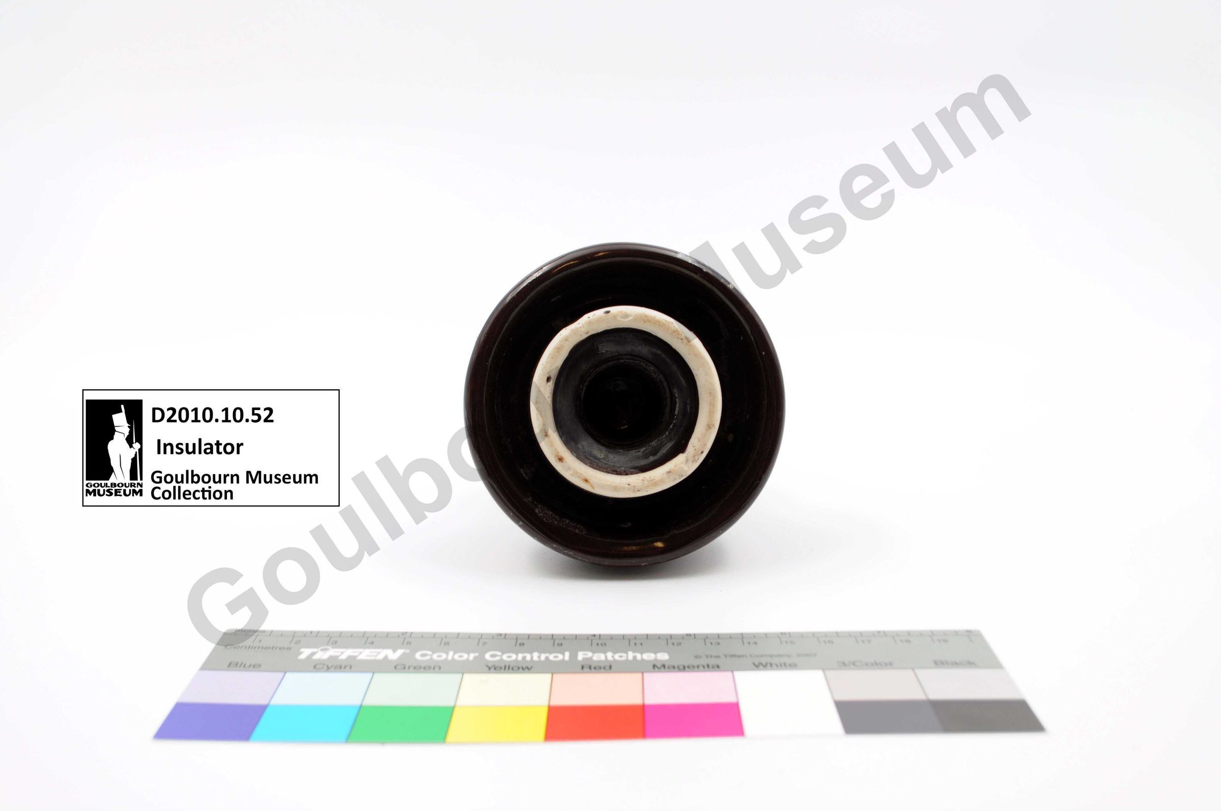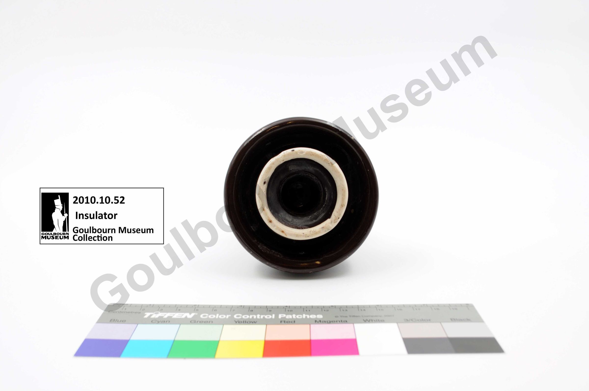 Dark brown screw top-shaped ceramic insulator with round sides.Context