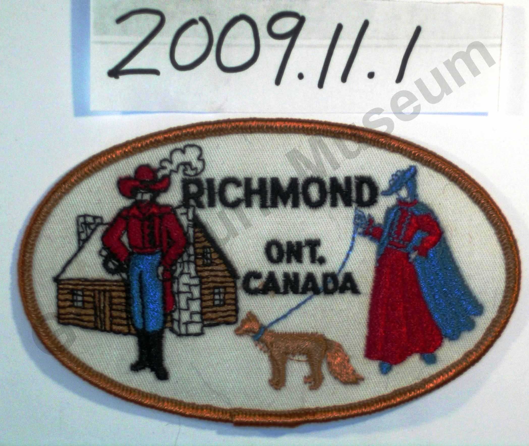 One embroidered patch with Richmond, Ontario, Canada written in black. With a man in a cowboy hat and a woman walking a dog standing in front of a log cabin.